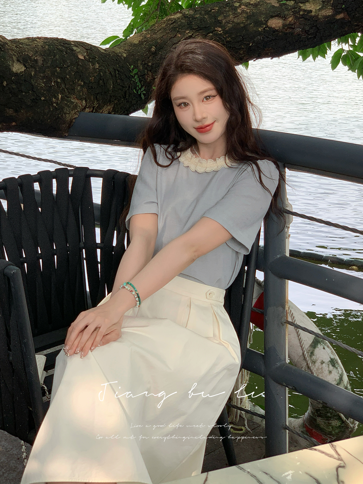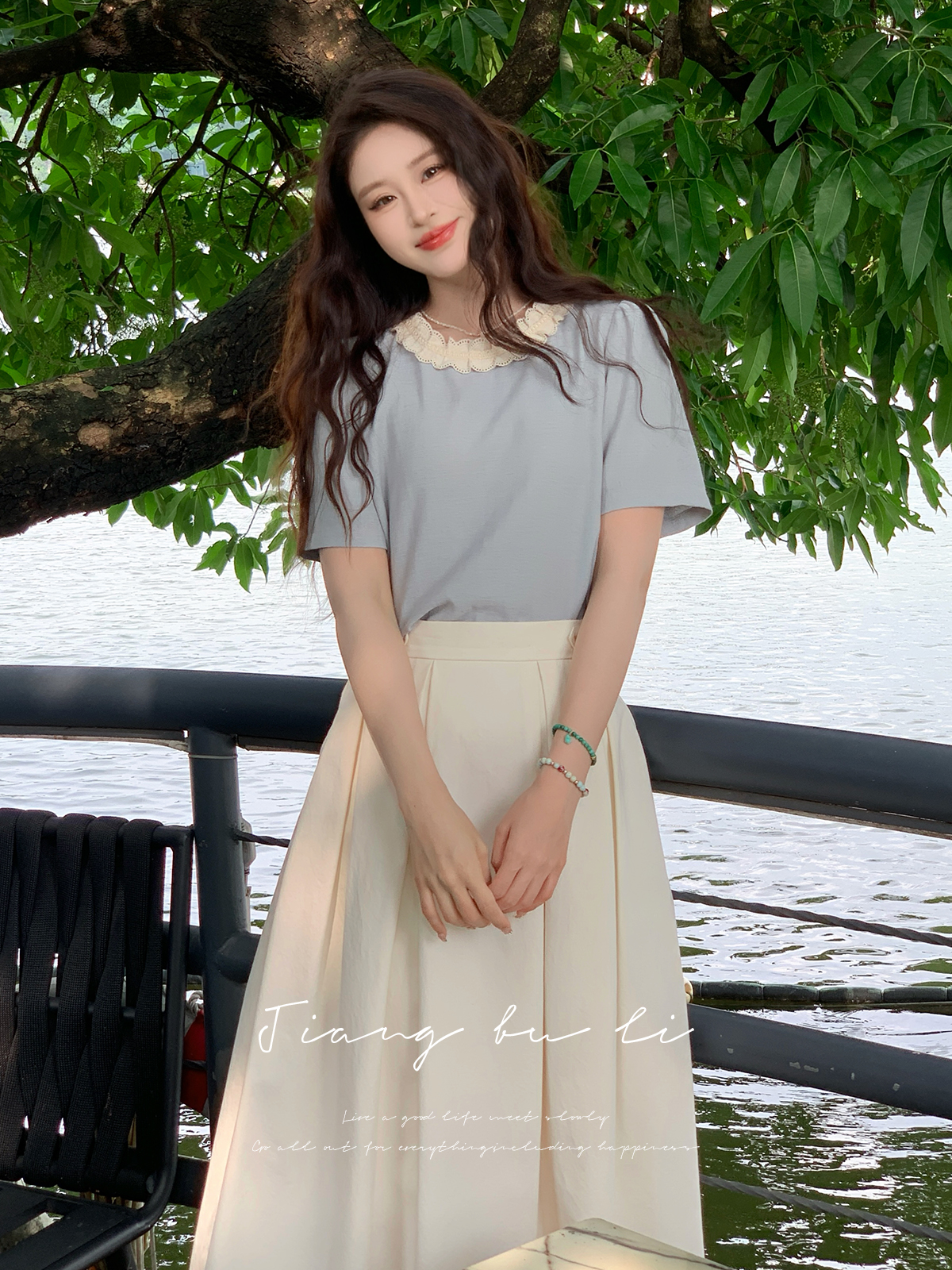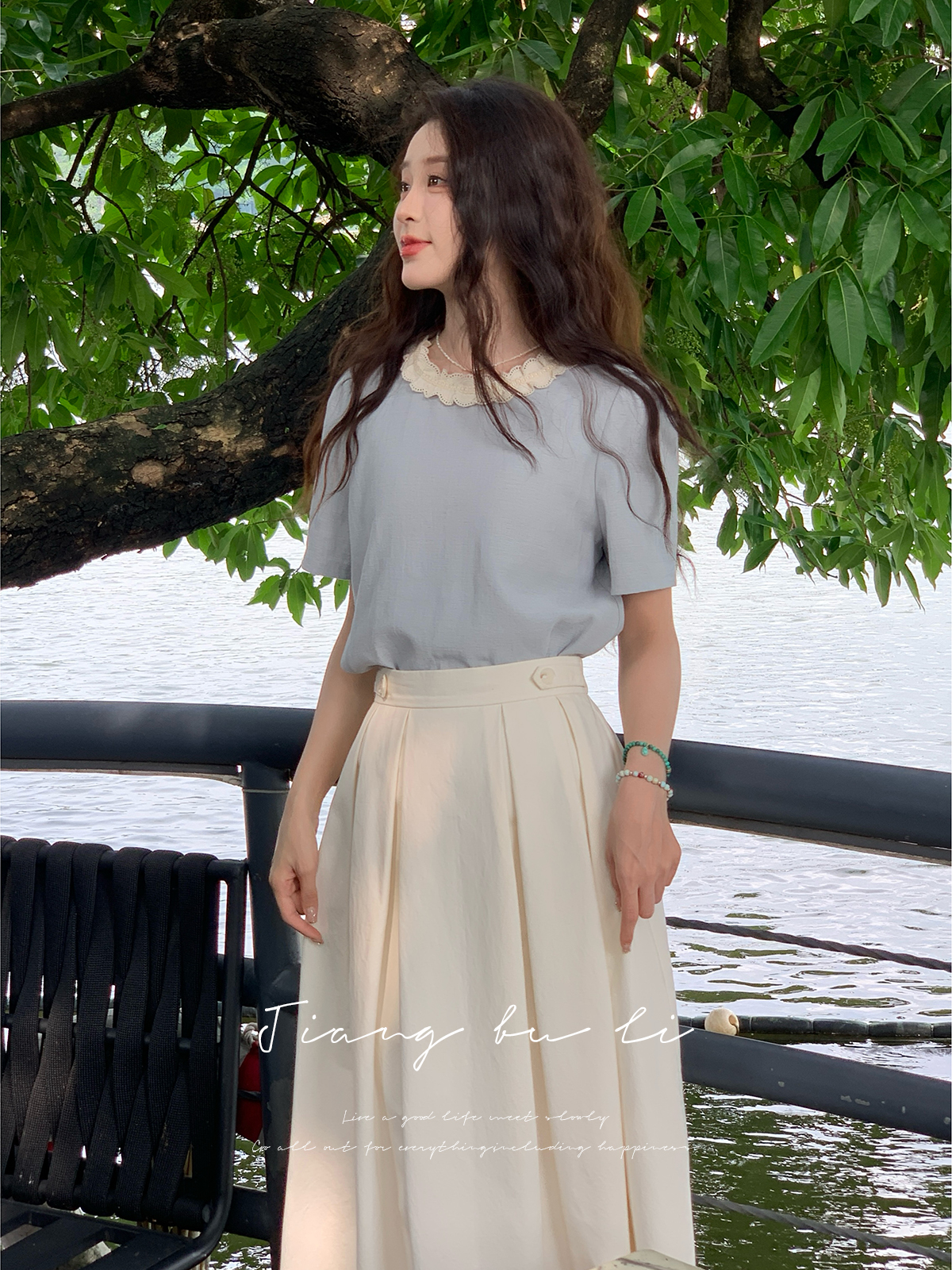 鹿向南「清新蓝语」圆领正肩休闲T恤2025夏季新款通勤短袖上衣女