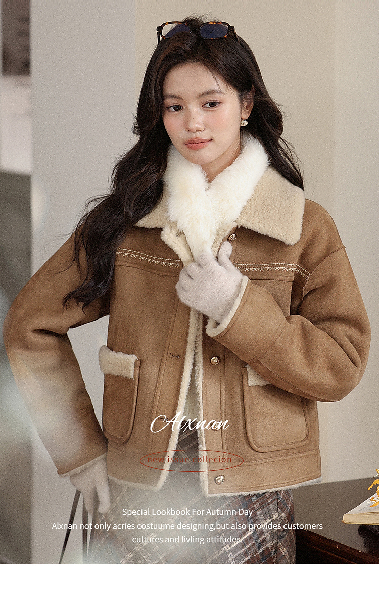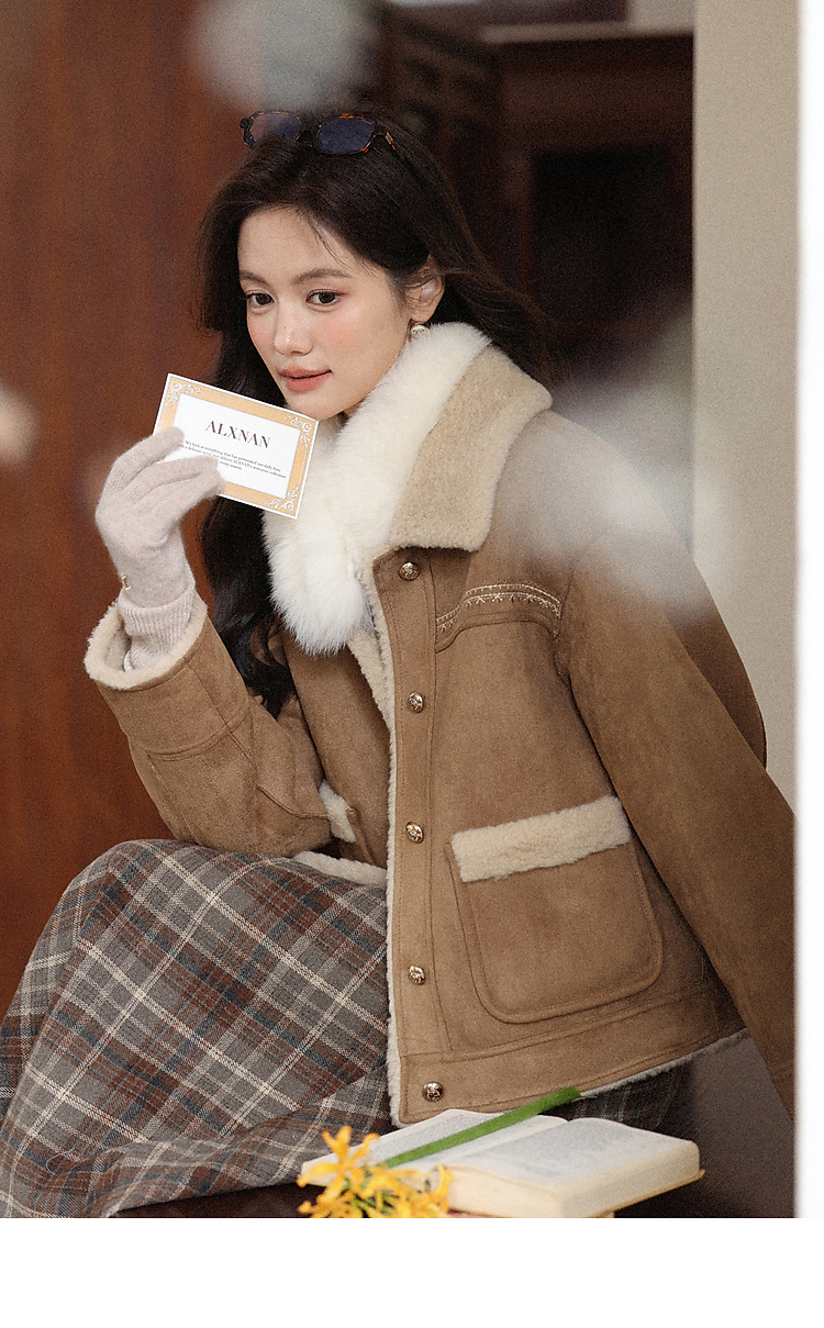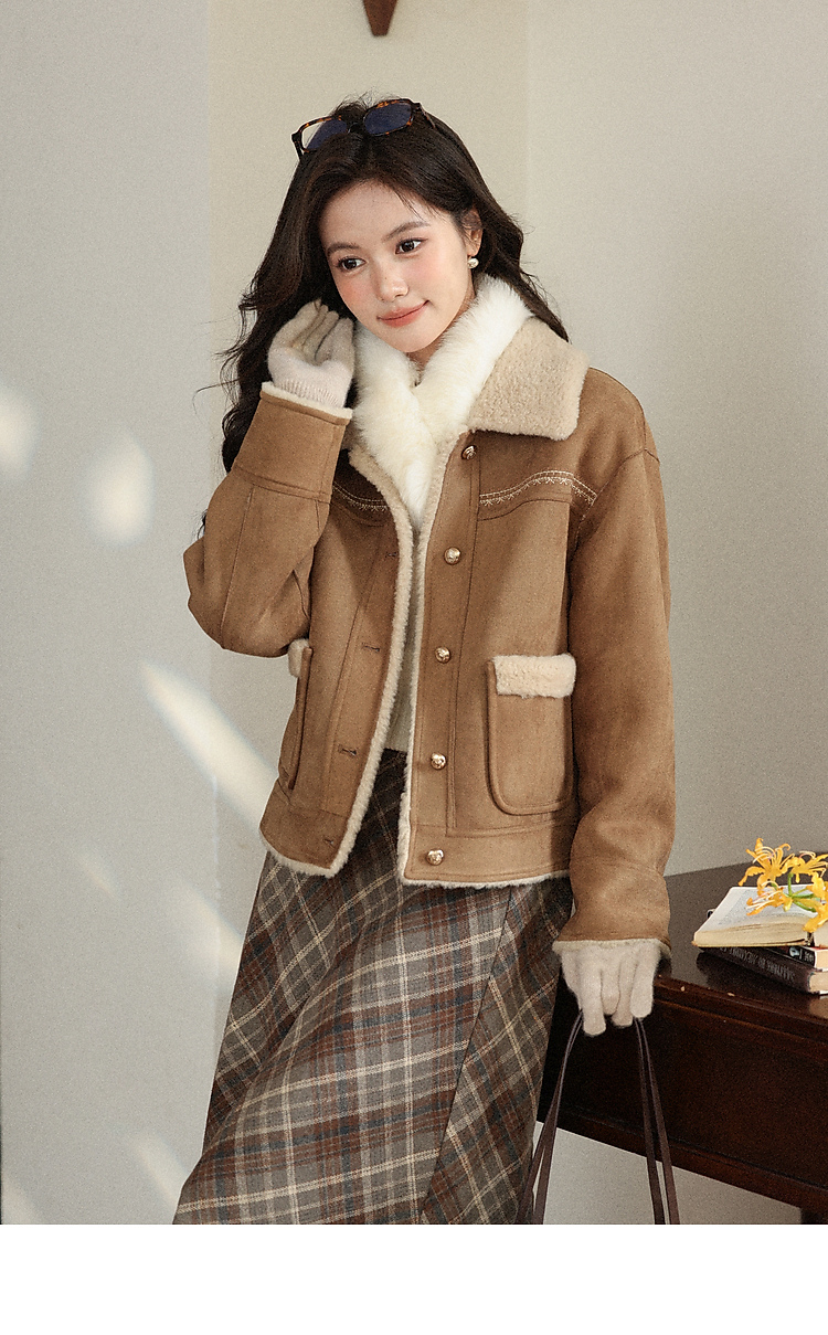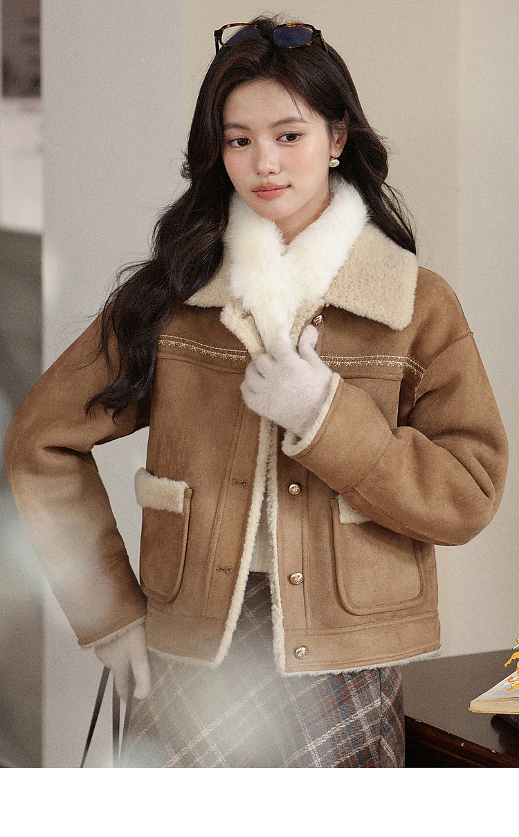鹿向南「秋街夕阳」美拉德浅咖色短款外套女秋冬宽松皮毛一体上衣L58865