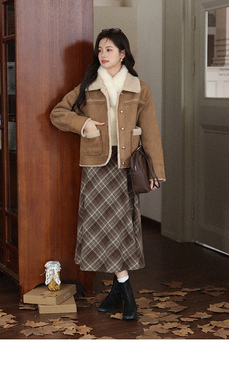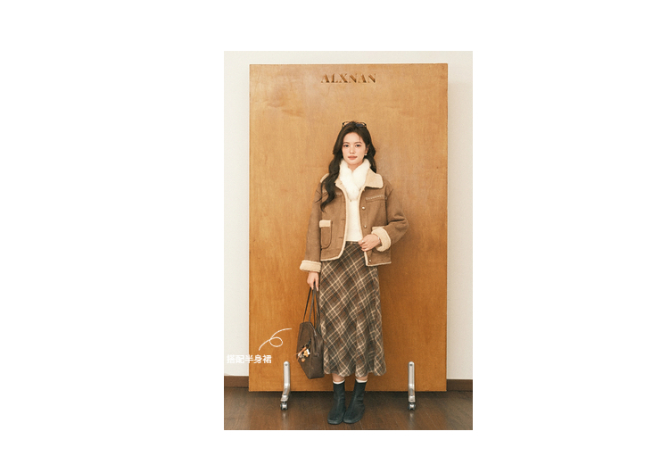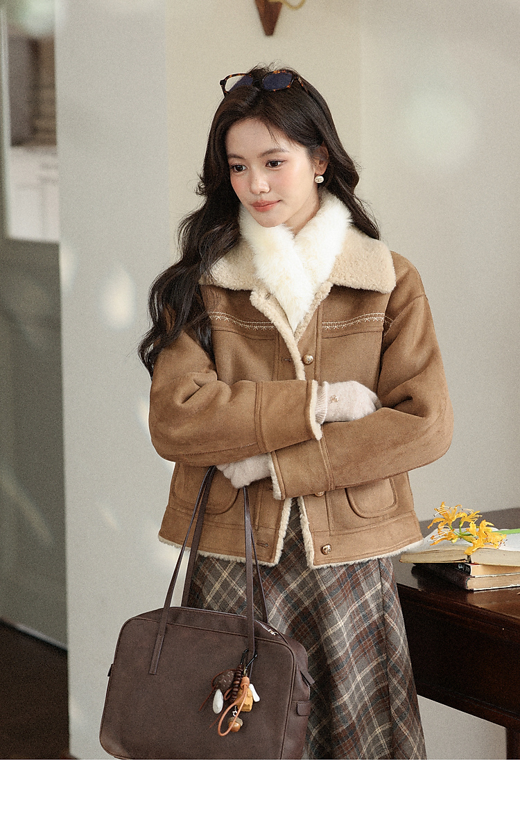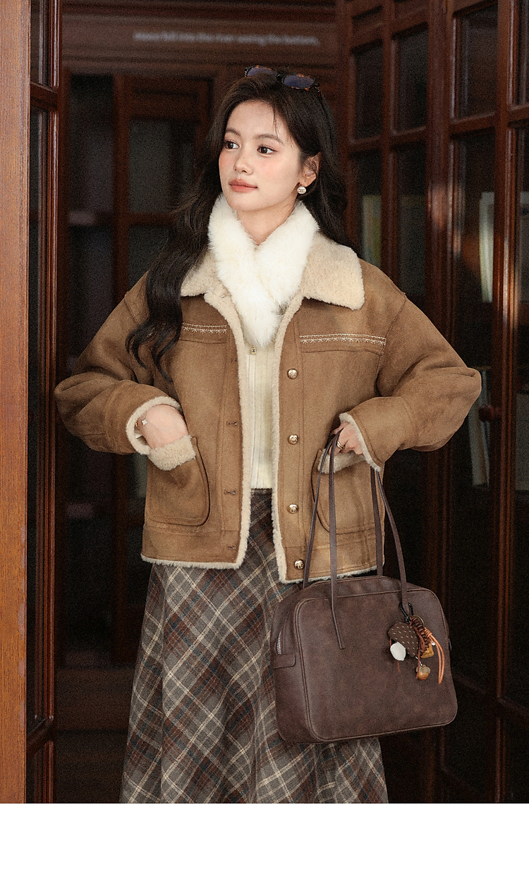 鹿向南「秋街夕阳」美拉德浅咖色短款外套女秋冬宽松皮毛一体上衣L58865
