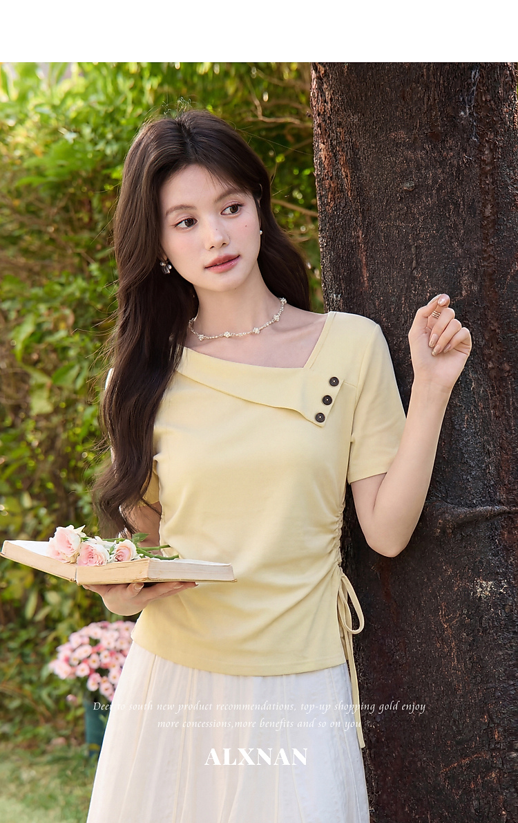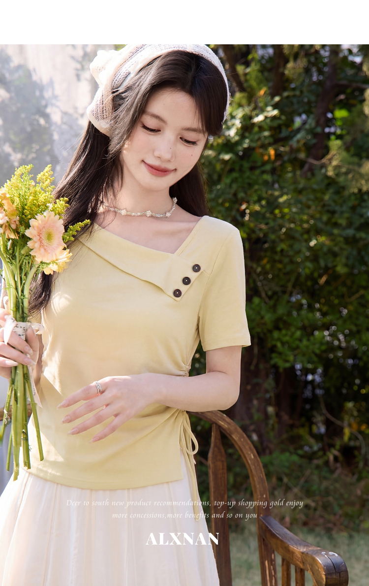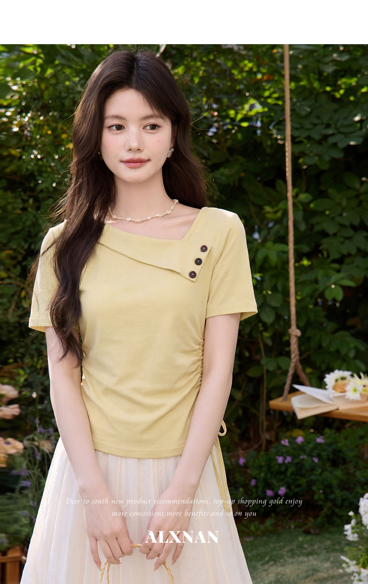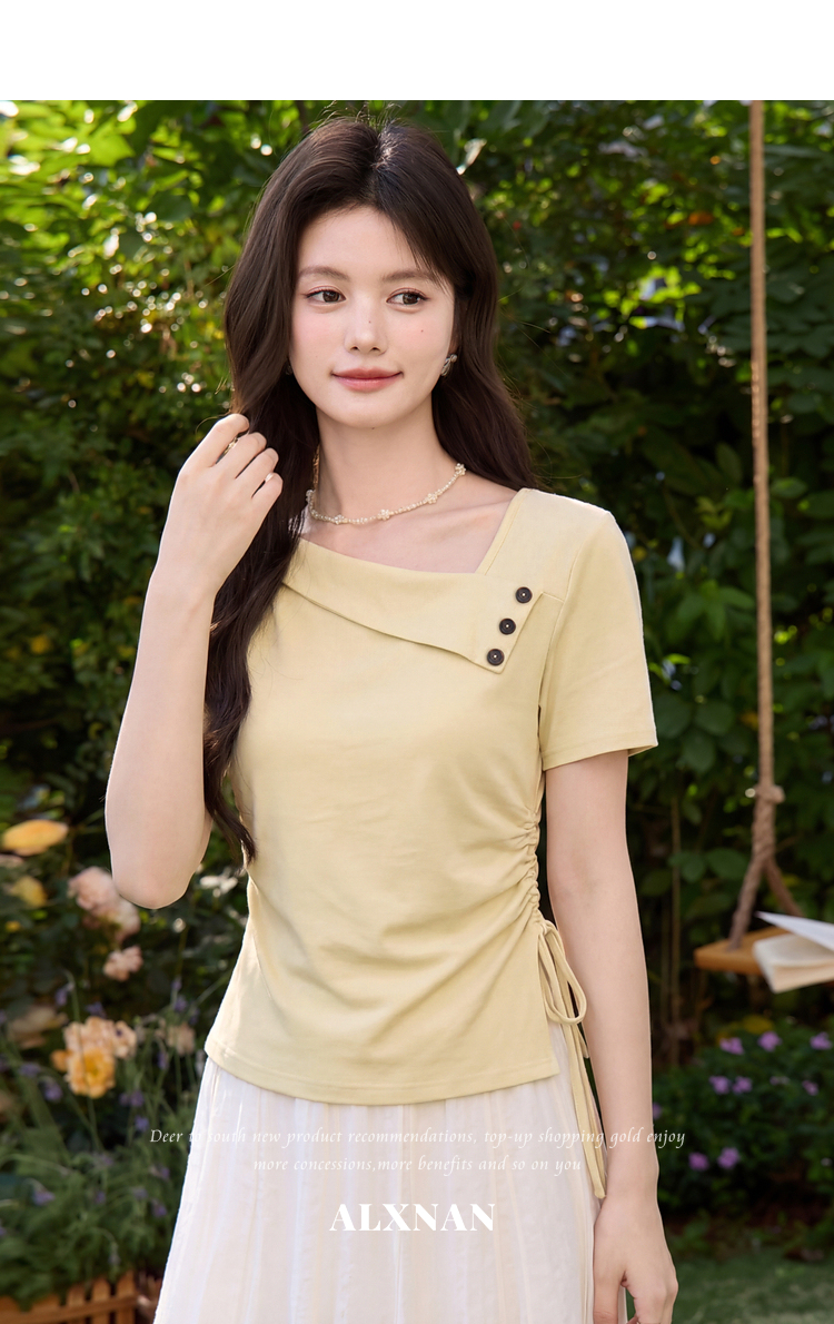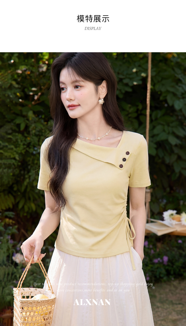 鹿向南「云樱甜柠」设计感斜领黄色短袖T恤女夏2026新款收腰上衣