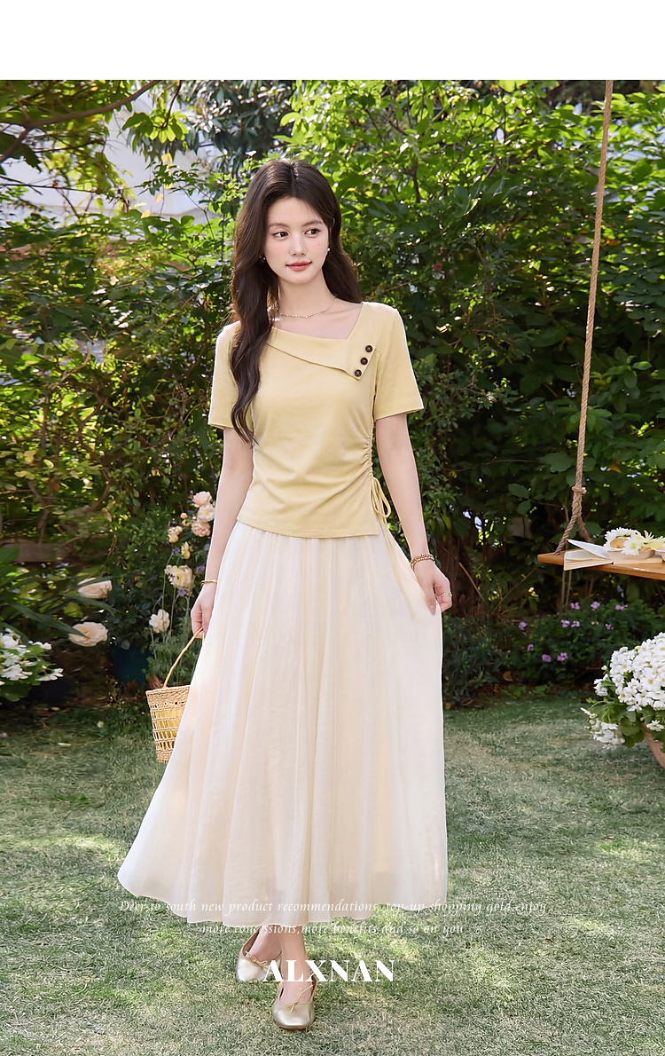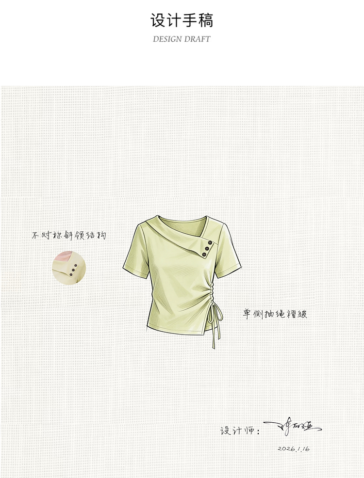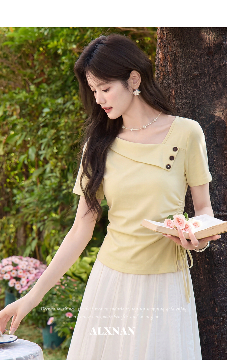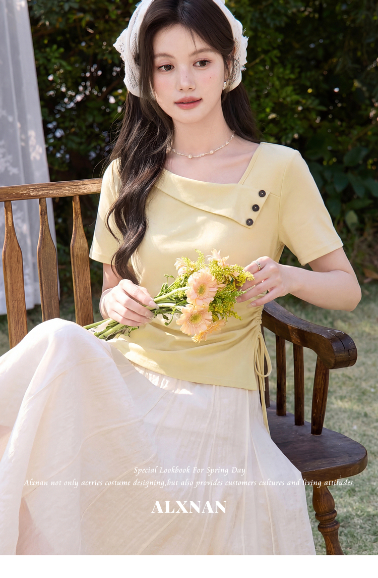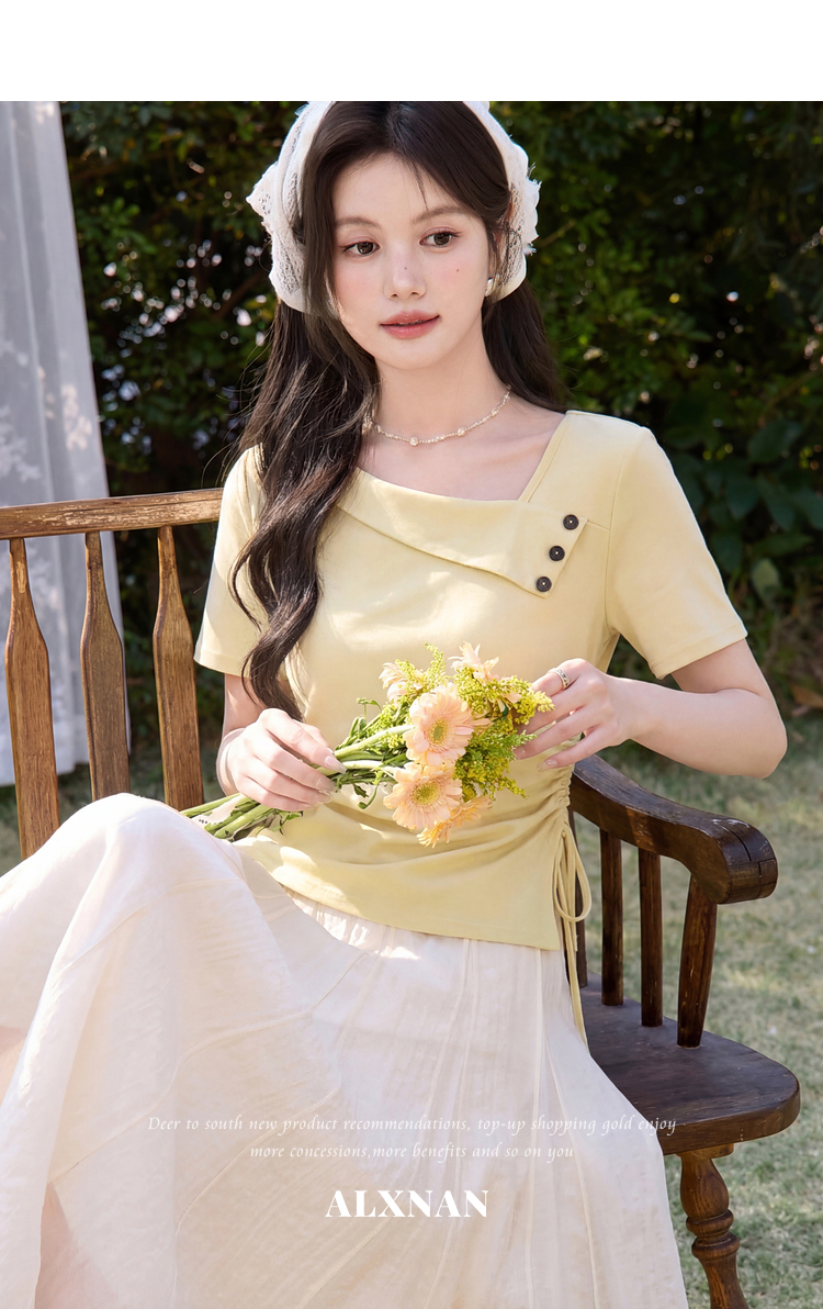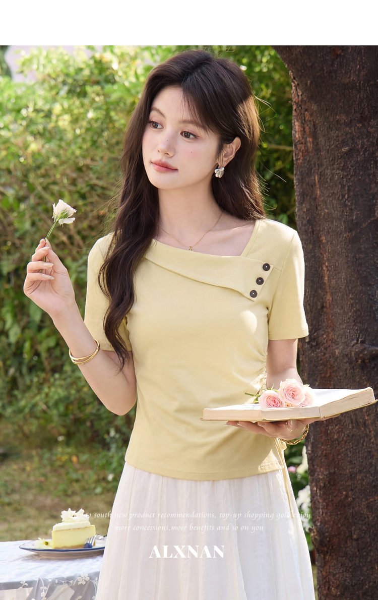 鹿向南「云樱甜柠」设计感斜领黄色短袖T恤女夏2026新款收腰上衣