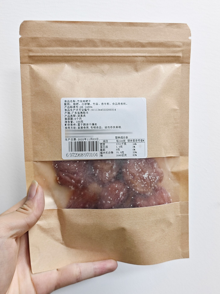 【商品名称】竹盐枇杷干 【上架规格】100g*4袋 【保质期】6个月 【生产日期】最近 【储存条件】阴凉干燥处 【发货地】广东揭西 【生产地】广东揭西 【发货快递】极兔 【不发货地区】新疆、西藏、港澳台 【发货时间】72小时 【售后规则】 1:食品类非质量问题不支持7天无理由退换货 2:若收到产品有质量问题或者破损少件,请签收24小时内对产品拍照+快递箱面单照片联系售后处理 3:个人口味问题不在售后范围内 【拦截/拒收/退货扣费】拦截拒收退货扣除3元