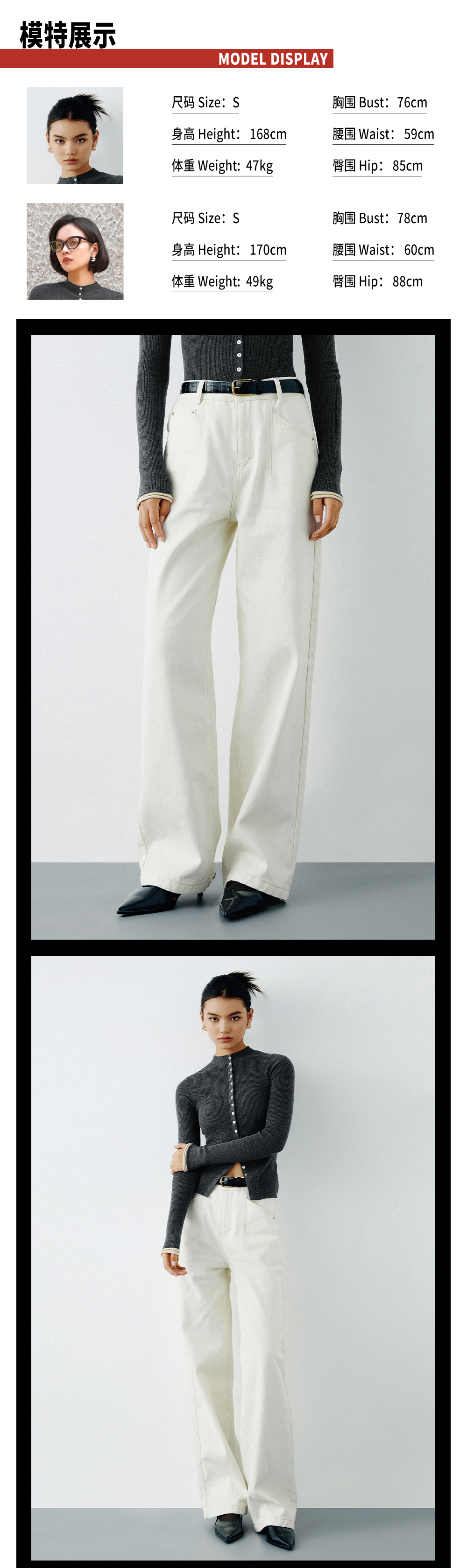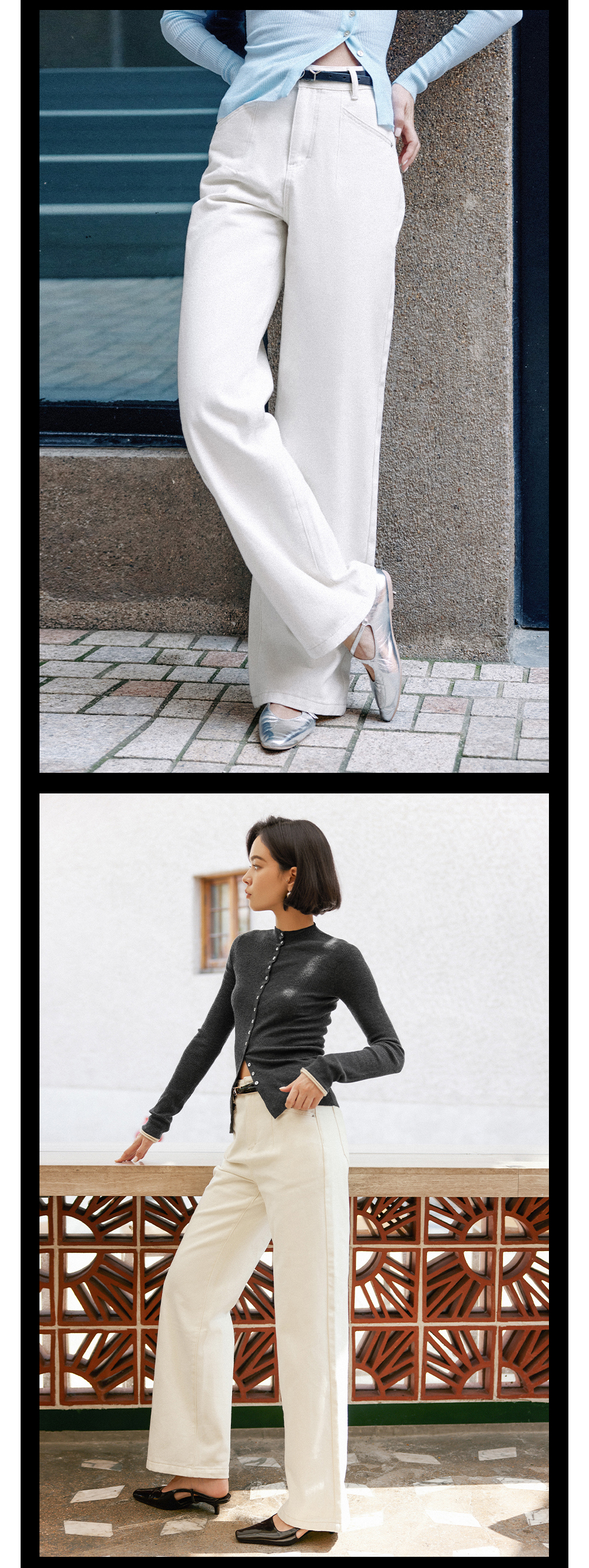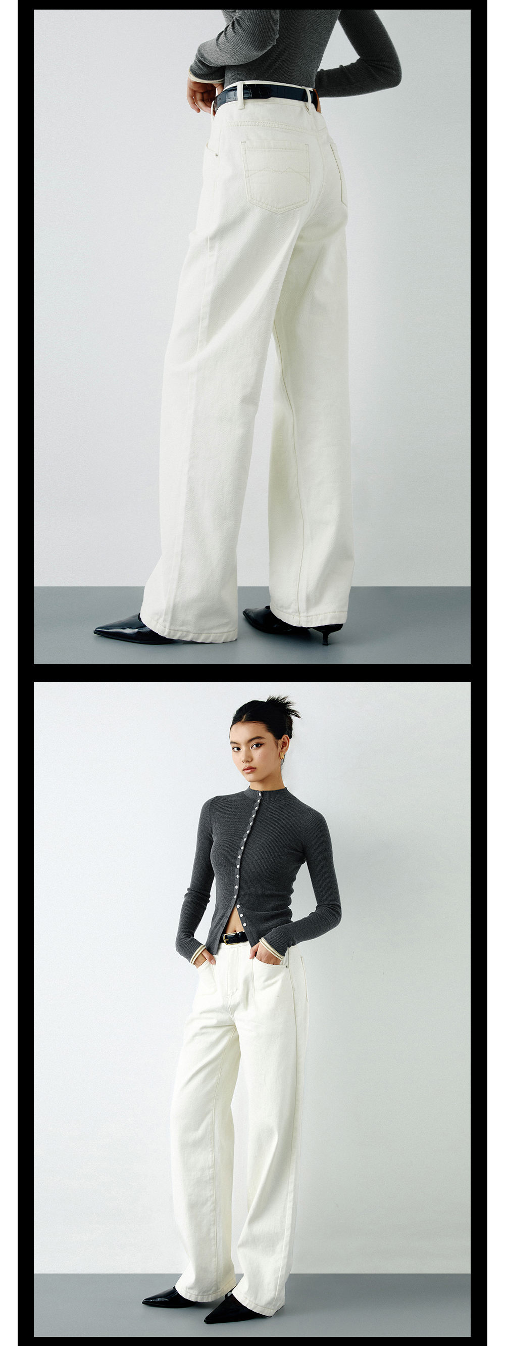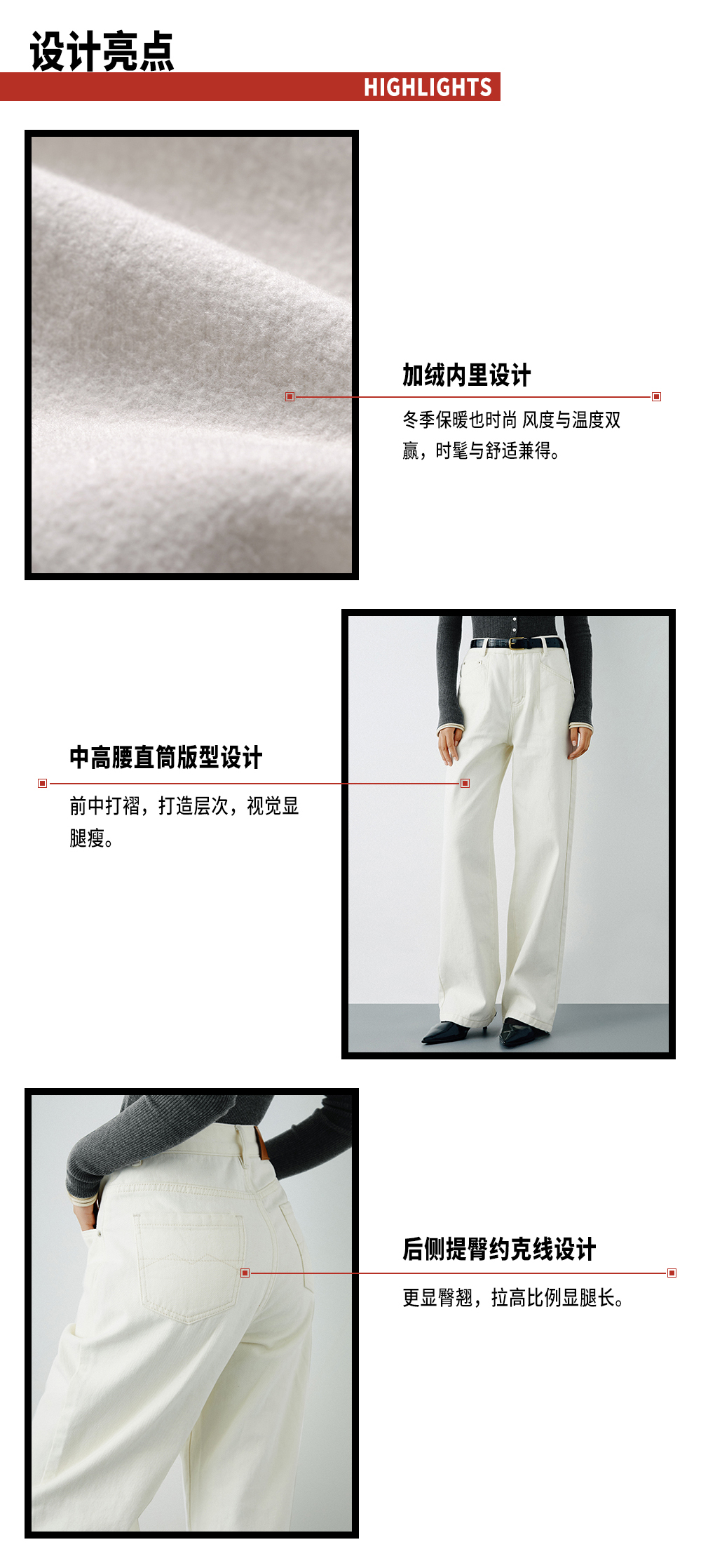 TR她热 神仙裤 白色水洗加绒直筒显瘦设计感基础款中高腰牛仔裤