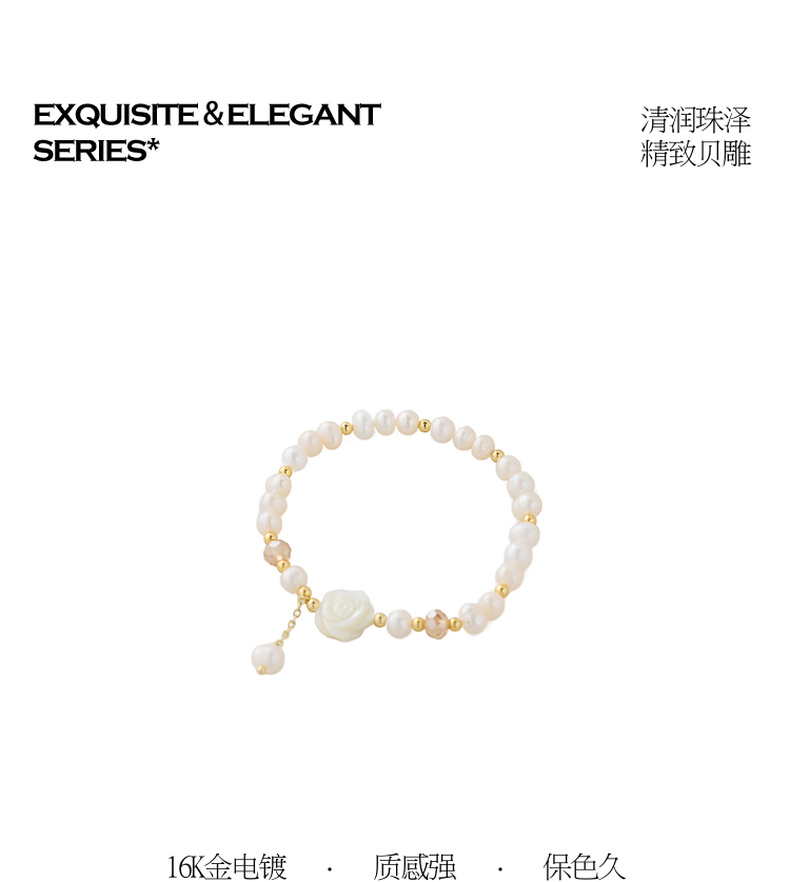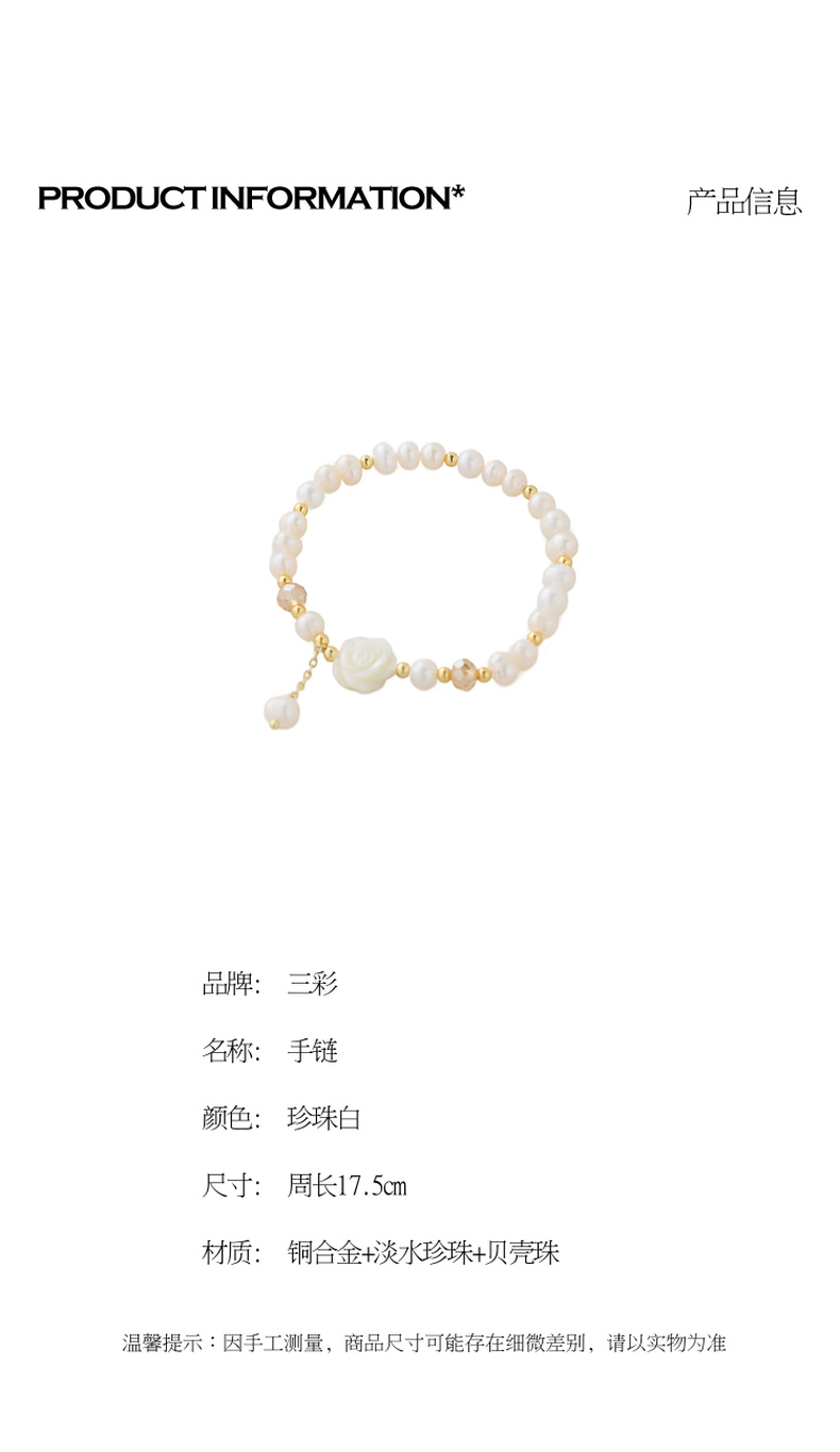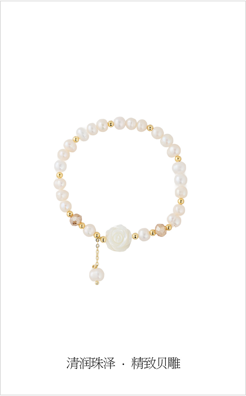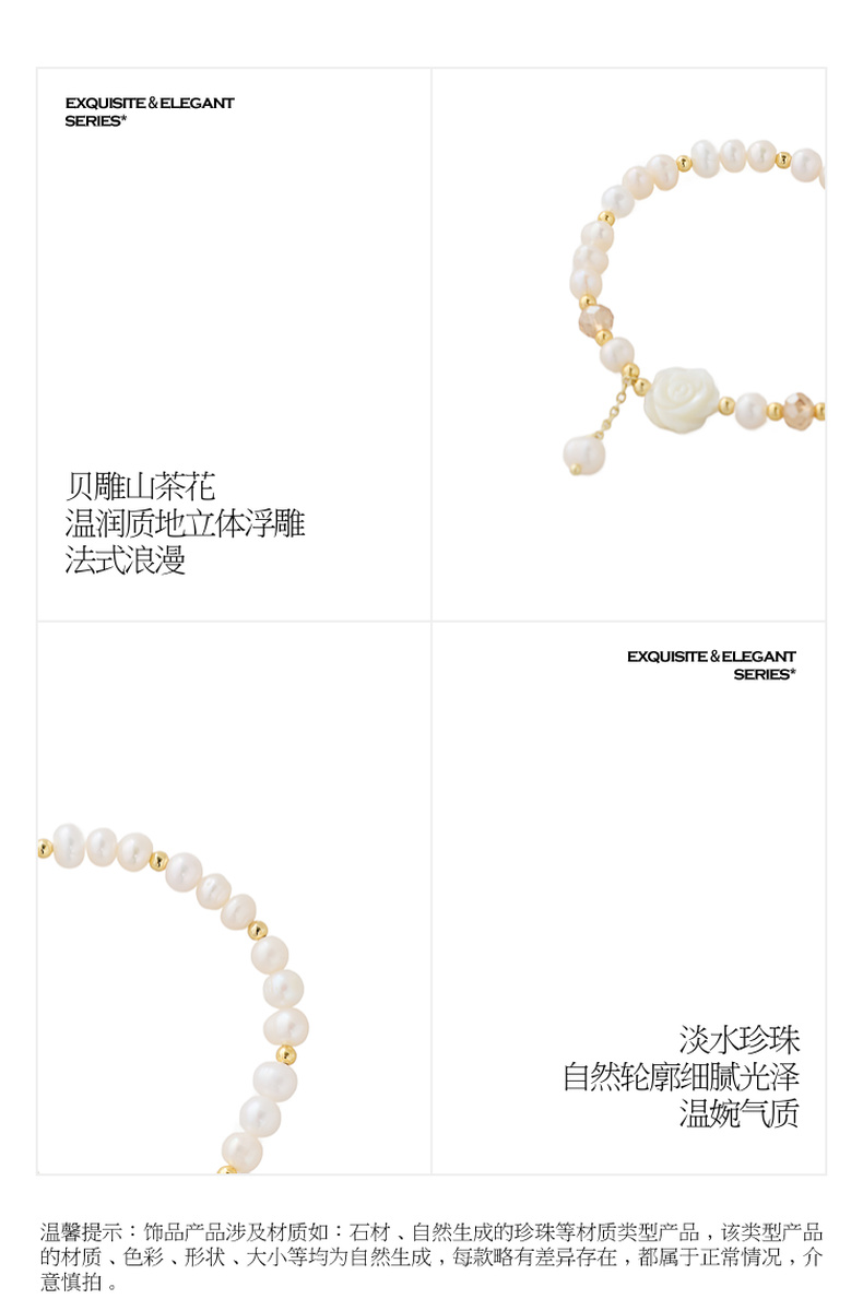 三彩2026新款淡水珍珠贝壳浮雕山茶花手串温婉气质法式浪漫约会女