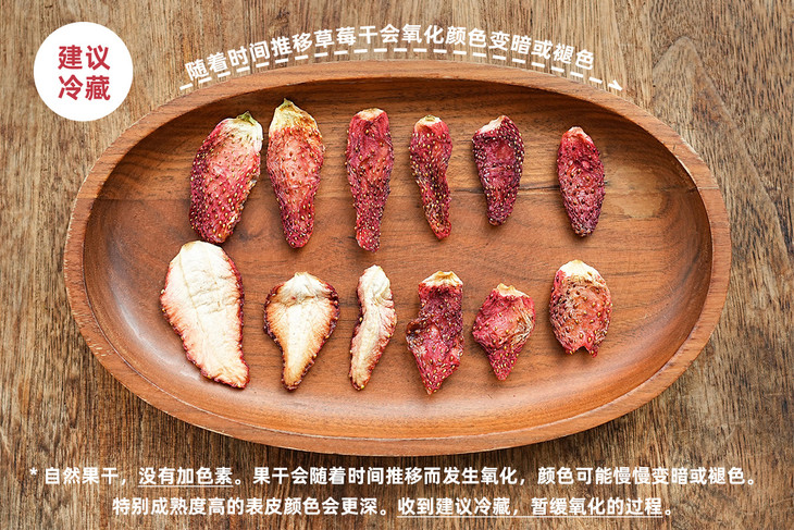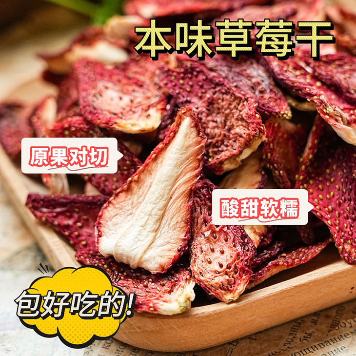 ✅每日鲜摘自然熟果。 11斤鲜草莓做1斤果干。 由签约的果农和果园,每日新鲜采摘8分熟果,筛除烂果。 经过摘蒂巴,清洗,切瓣,烘干,包装等多道工序, 平均用掉11斤鲜草莓,才做出1斤风味本味的草莓干。 没有额外加白砂糖,来添称头的重量。
