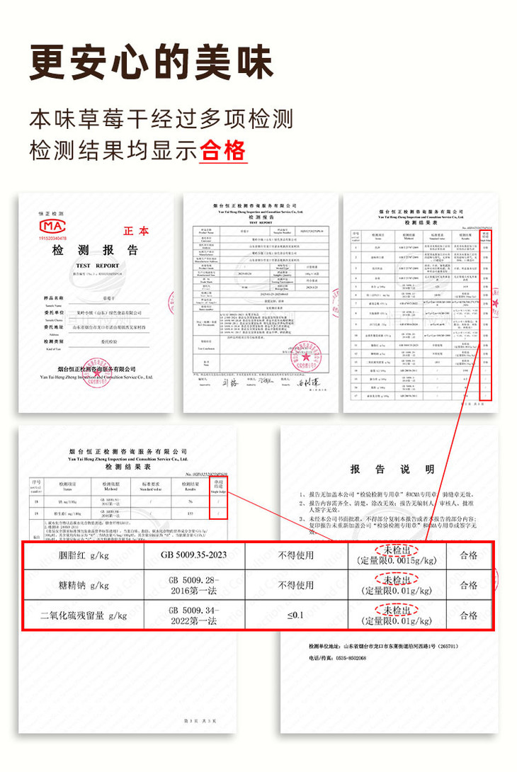 ✅高于国标的要求做一颗草莓干。 我们经得起第三方检测。 ▪ 水分14.9%(符合国标≤25%) ▪ 二氧化硫未检出(高于国标<0.01g/kg的标准) ▪ 铅含量未检出(高于国标<0.04mg/kg的标准)