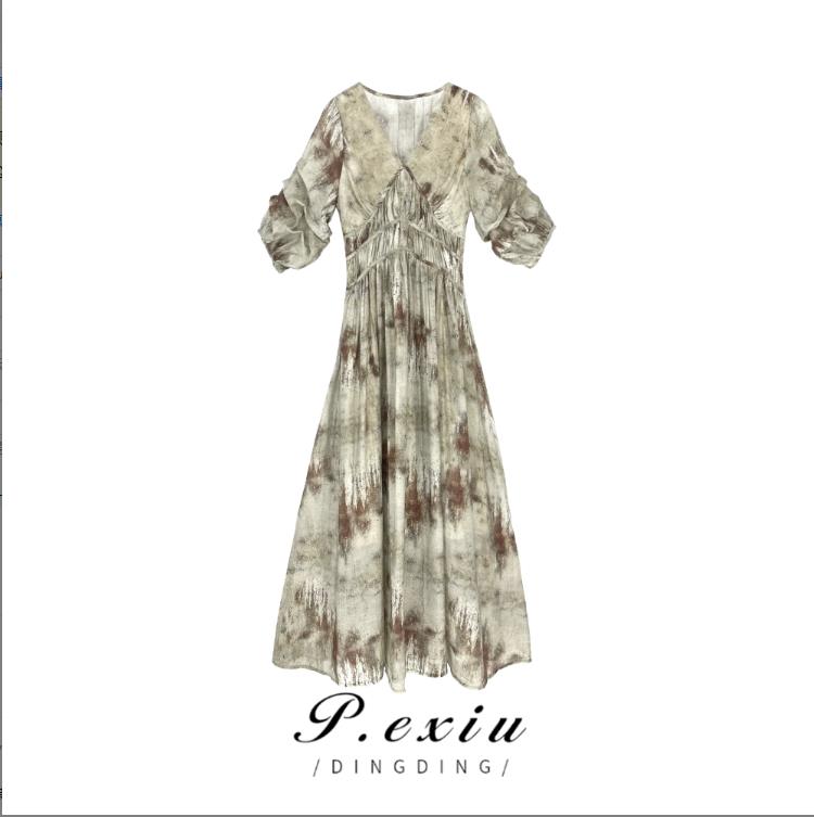 【现货】0604 PanYiXiu/潘依绣【墨笔生花】水墨晕染V领气质显瘦连衣裙 20948T