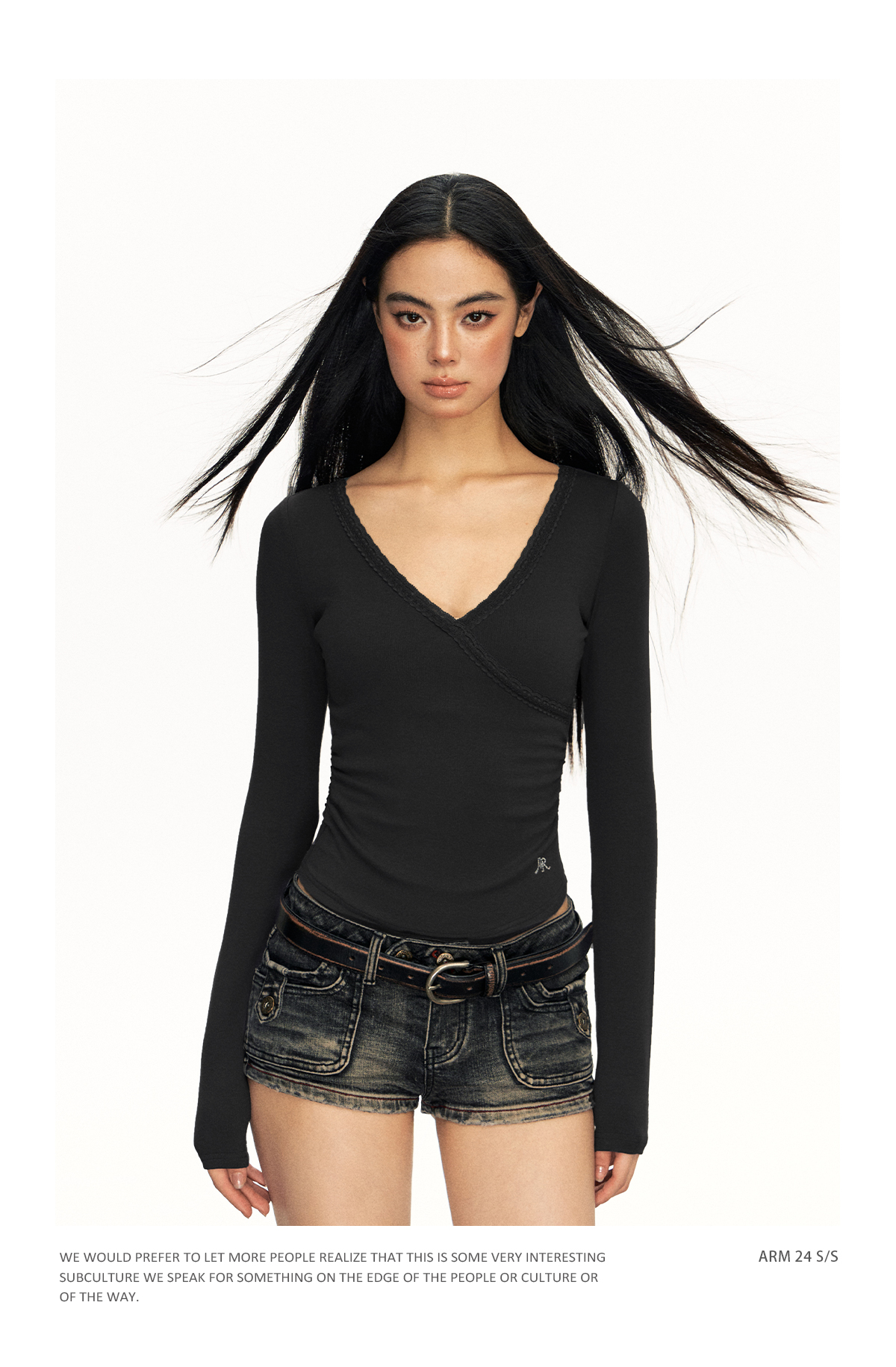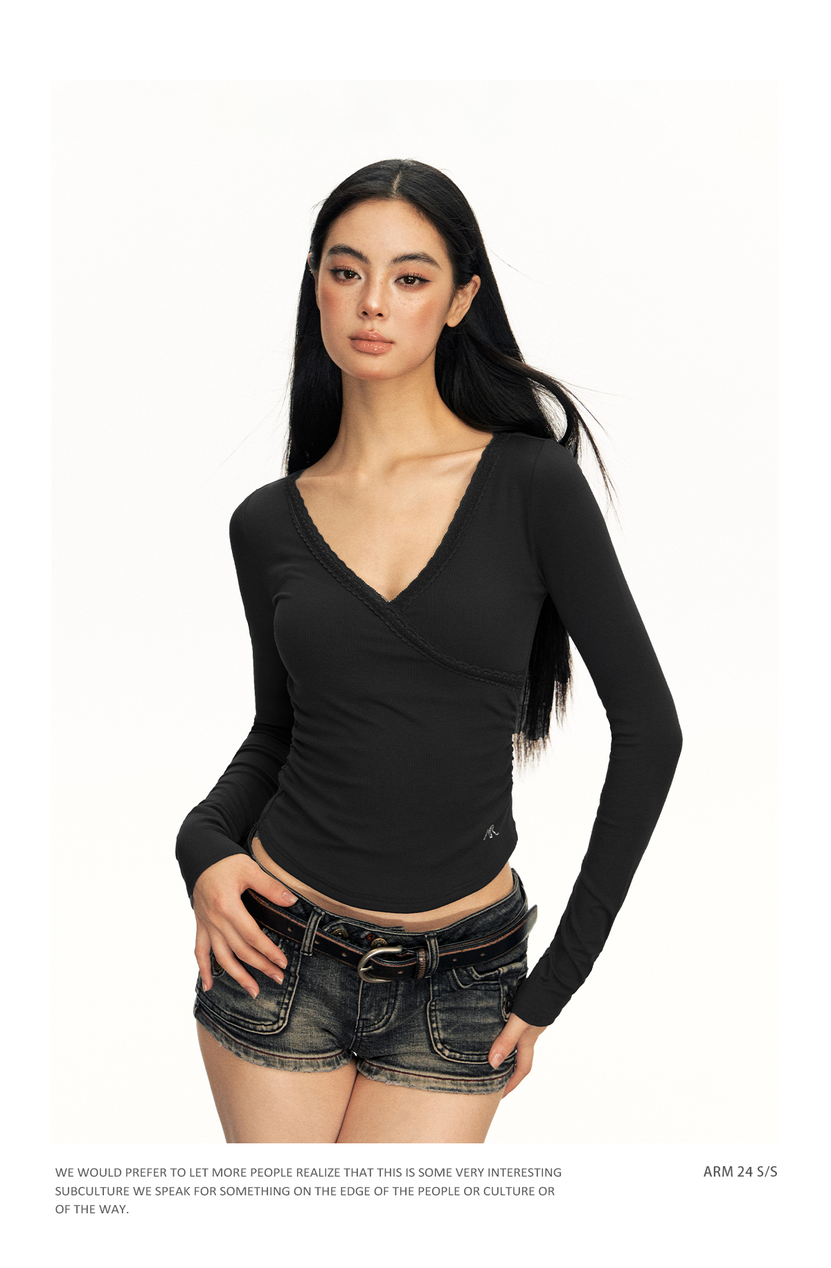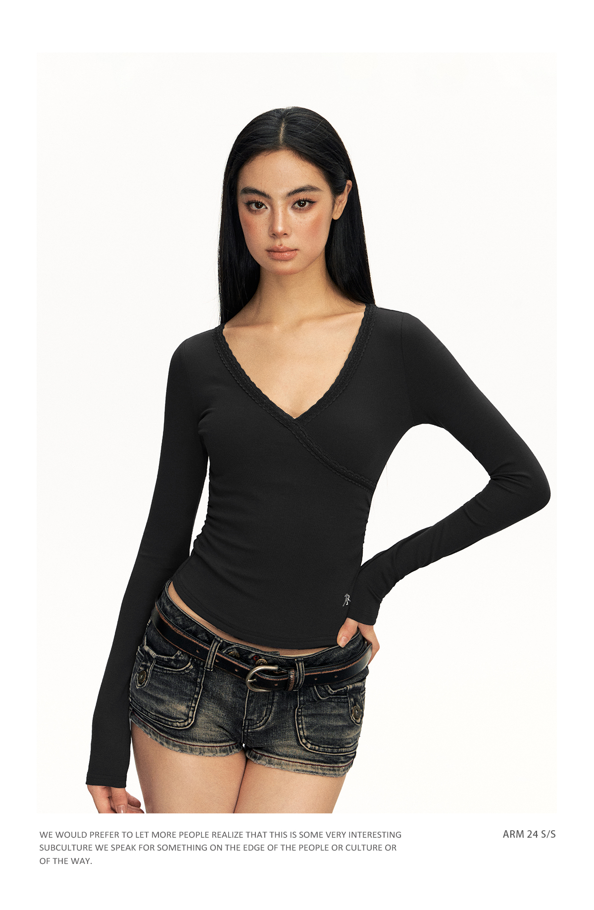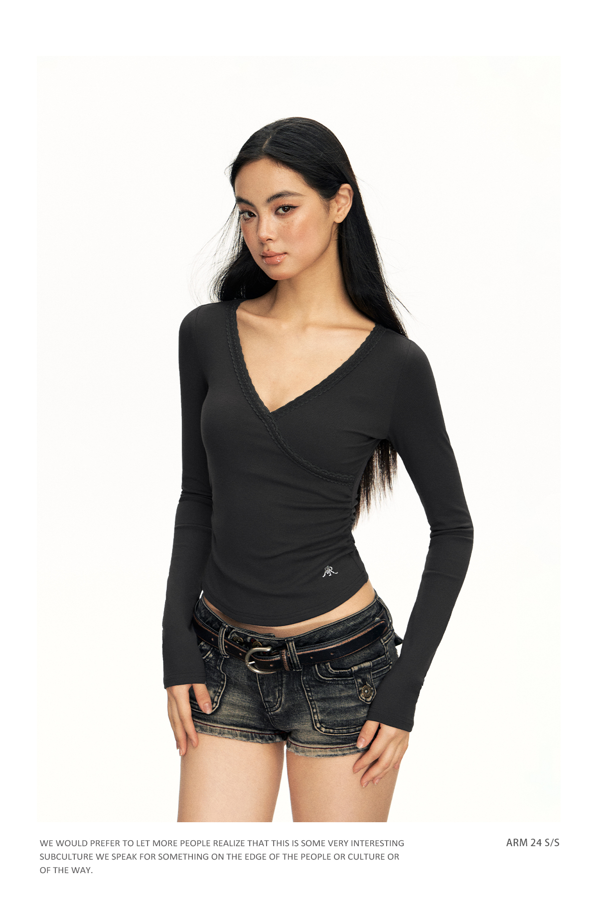 Ariseism美式复古纯色蕾丝V领长袖t恤女2025春秋新款修身显瘦上衣