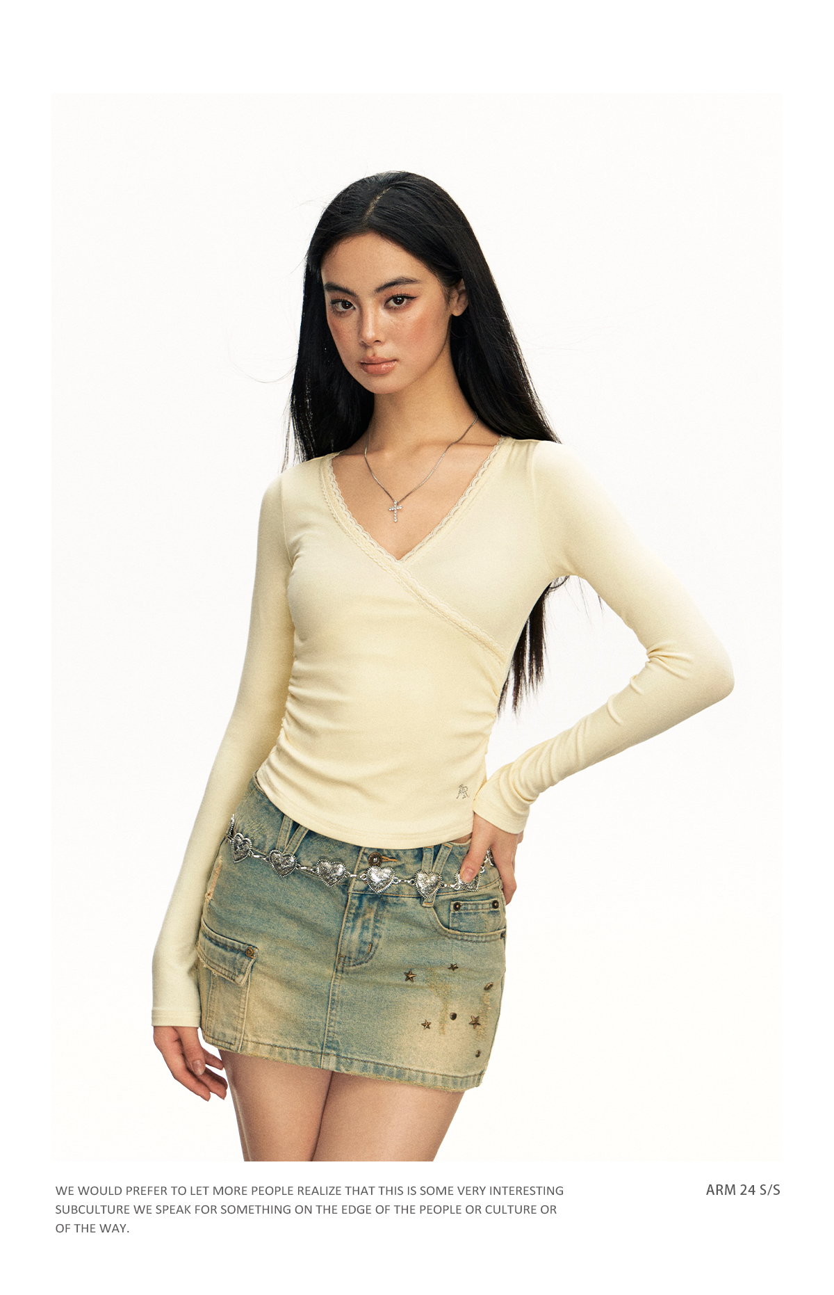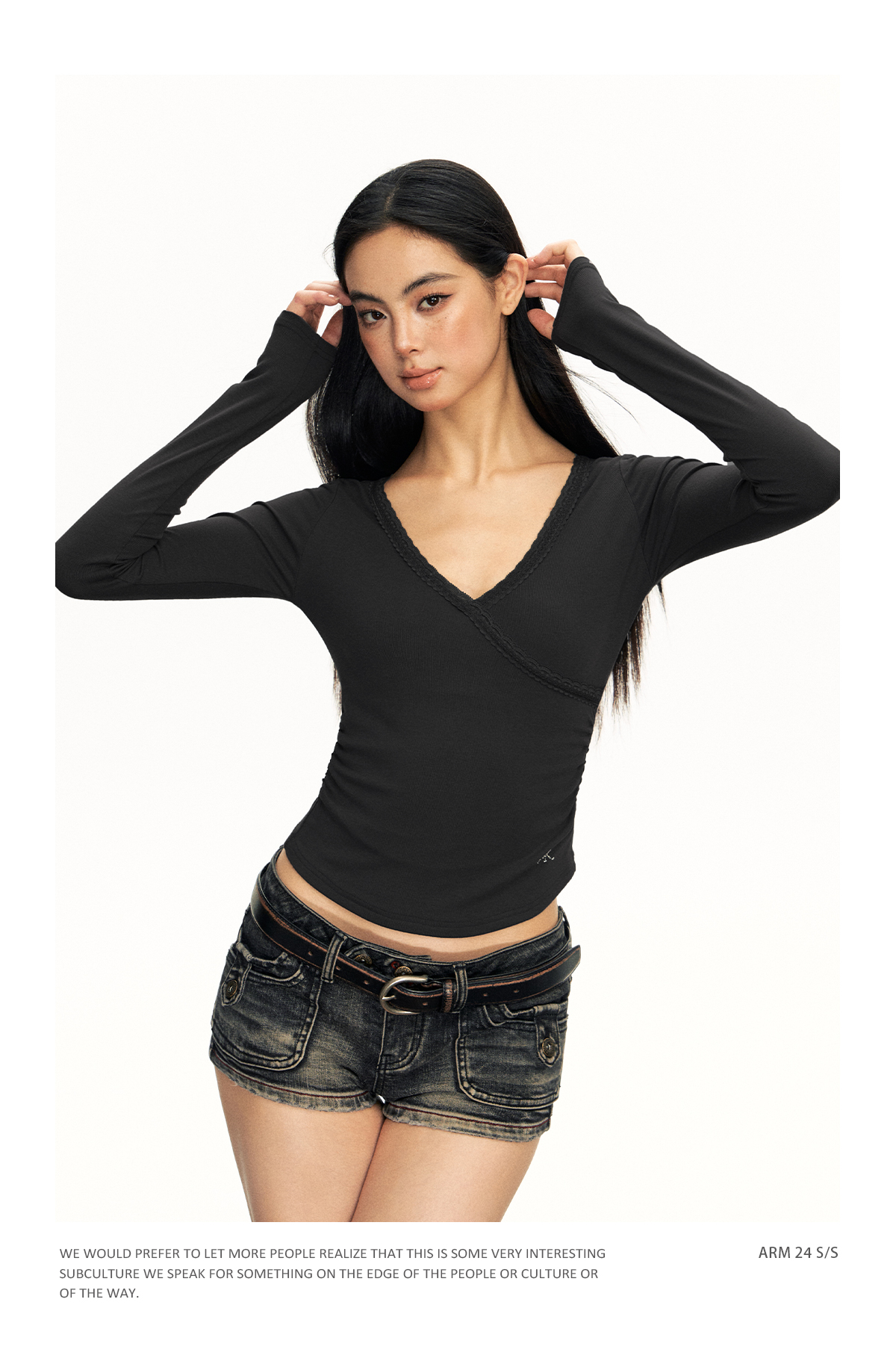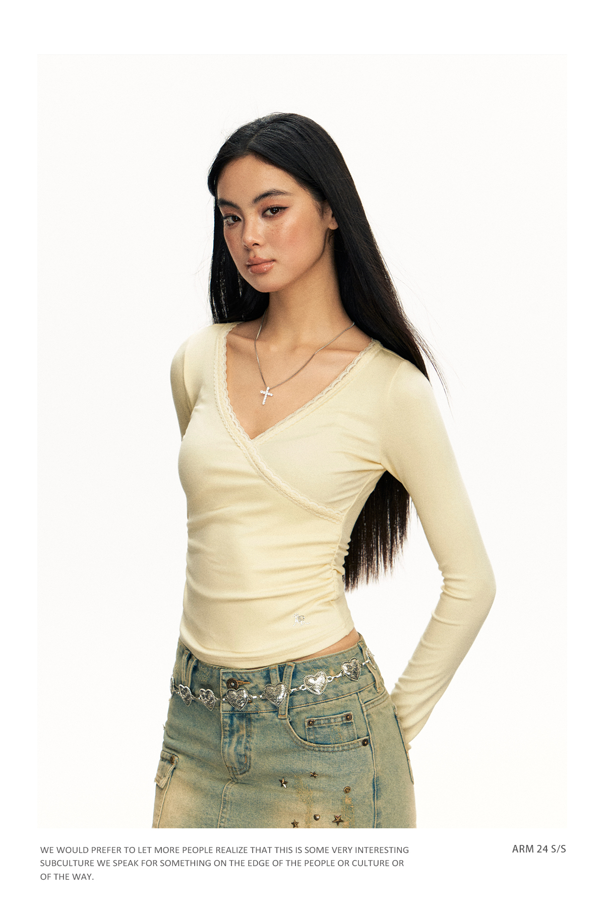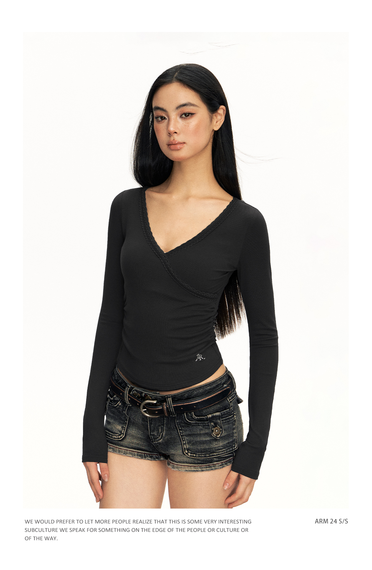 Ariseism美式复古纯色蕾丝V领长袖t恤女2025春秋新款修身显瘦上衣