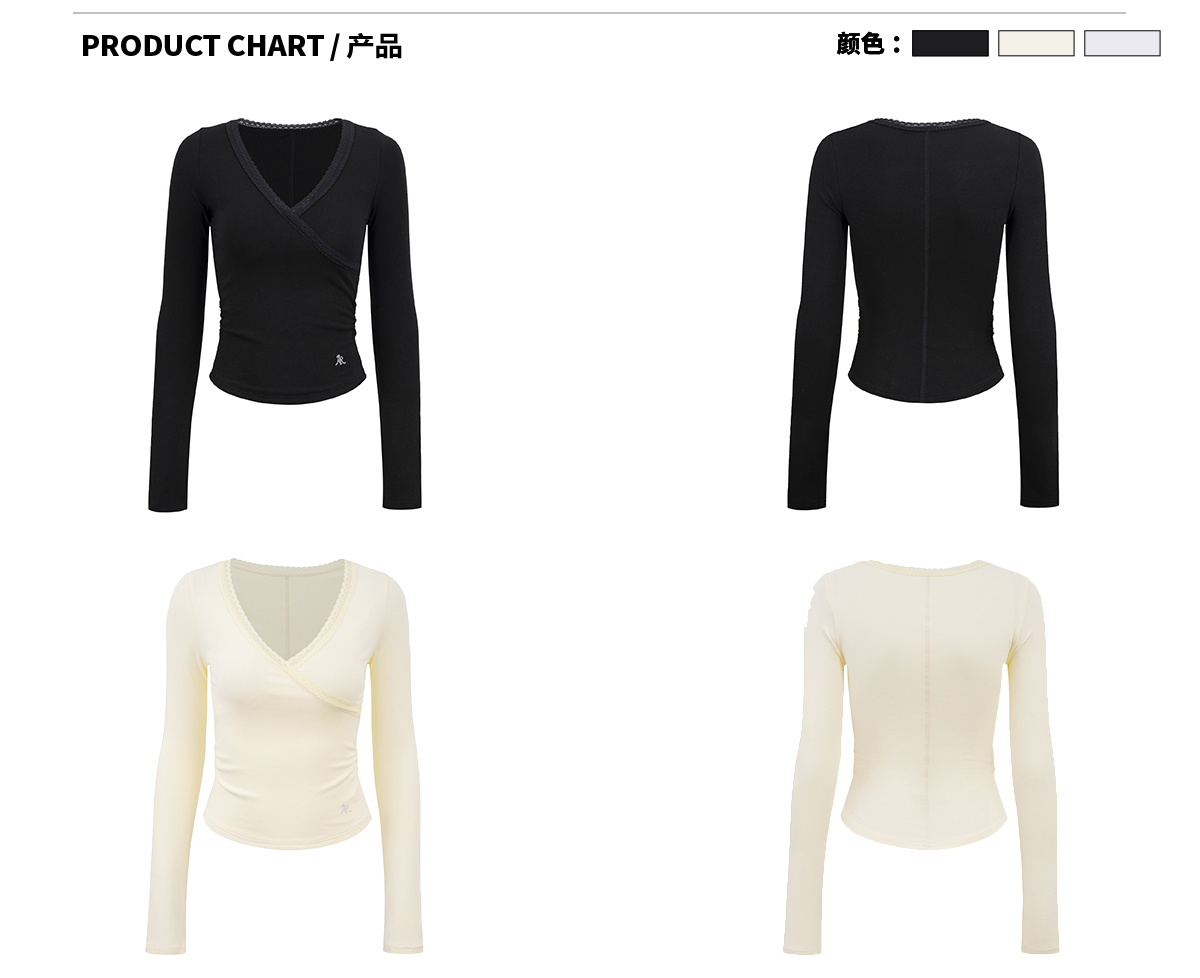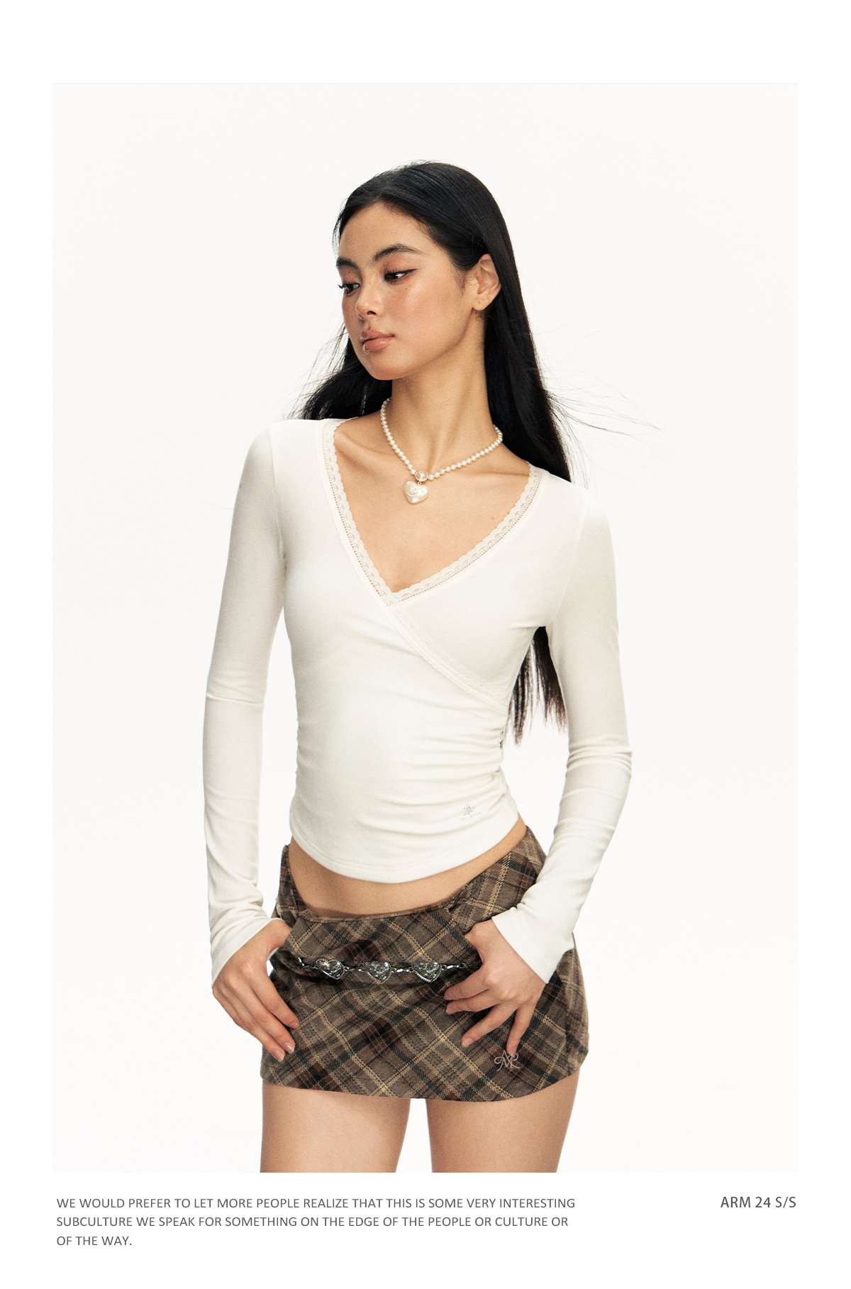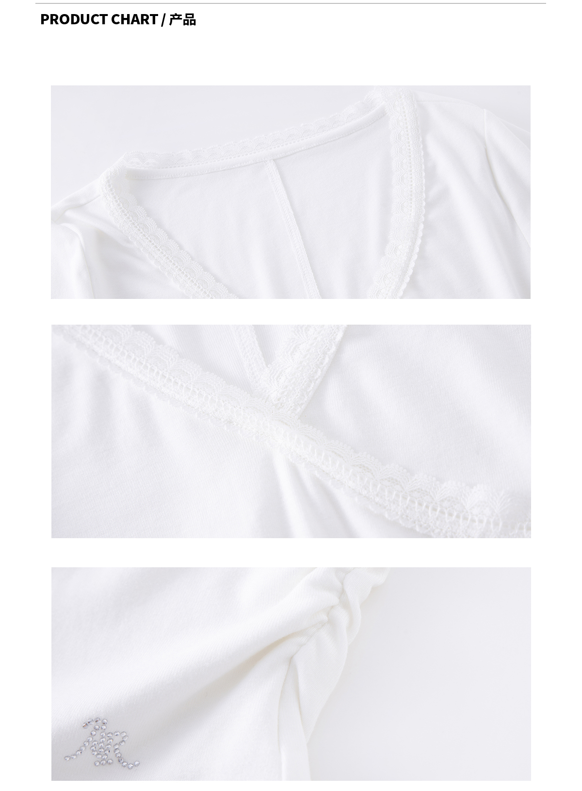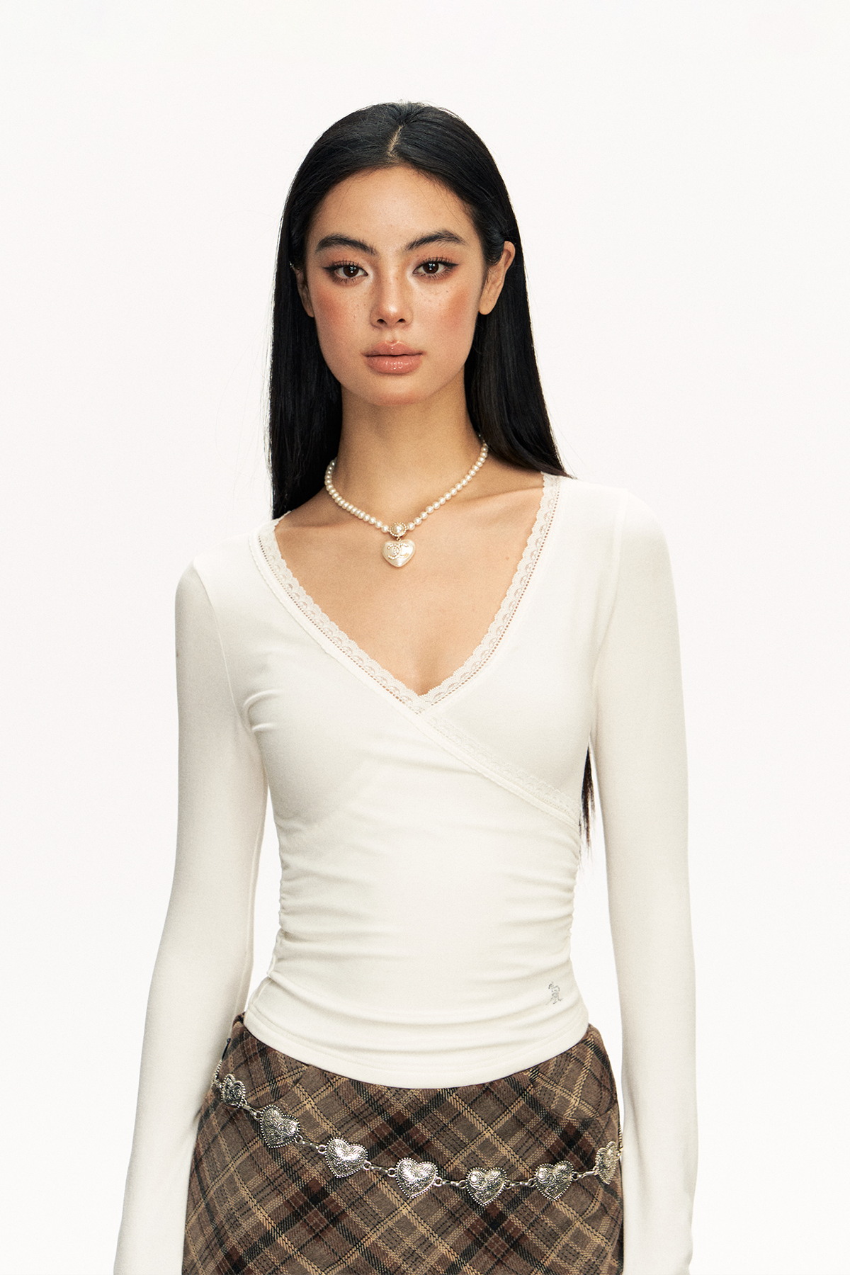 Ariseism美式复古纯色蕾丝V领长袖t恤女2025春秋新款修身显瘦上衣