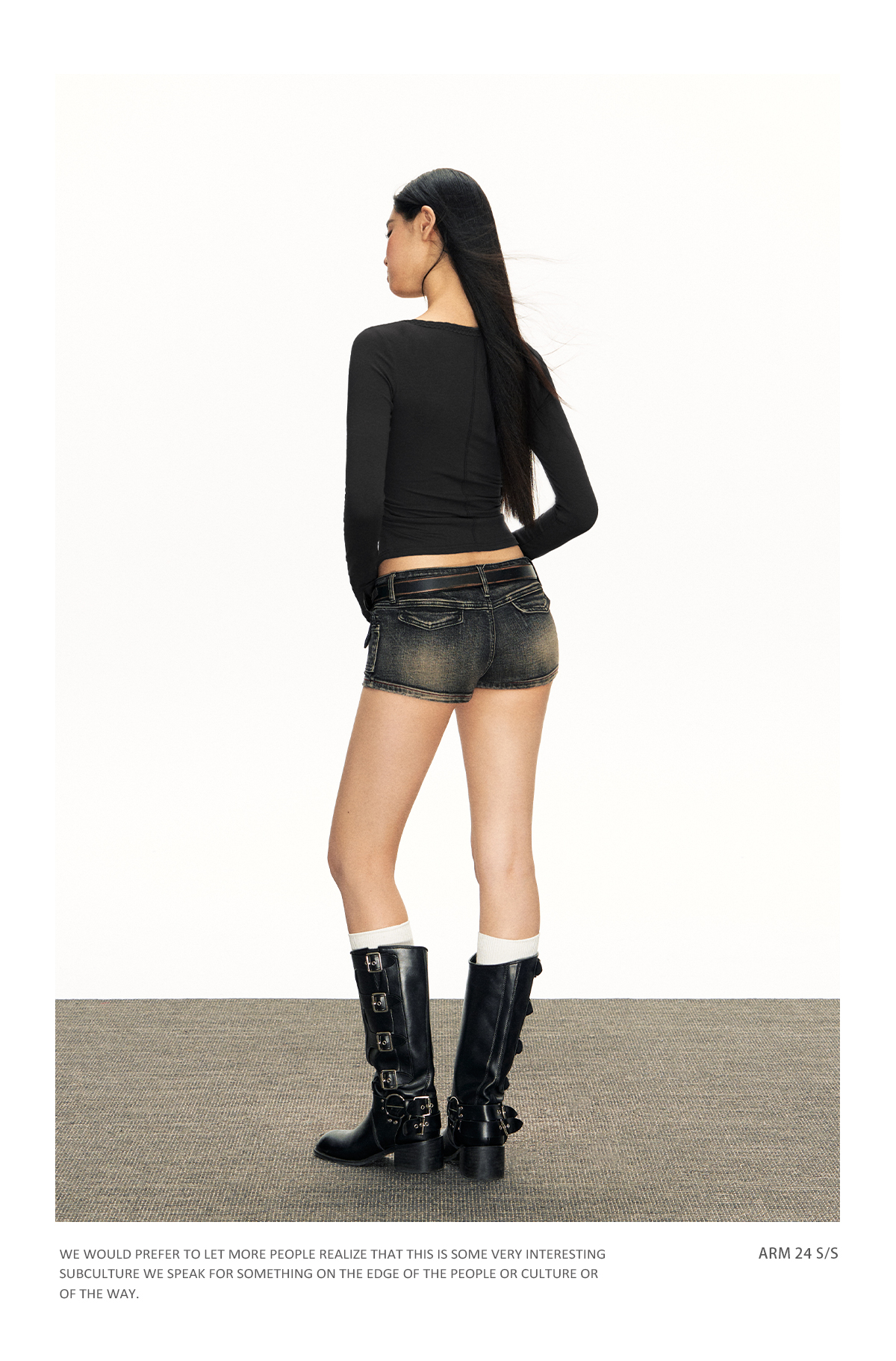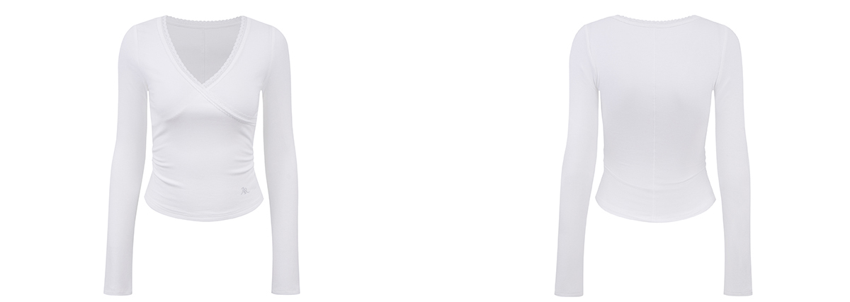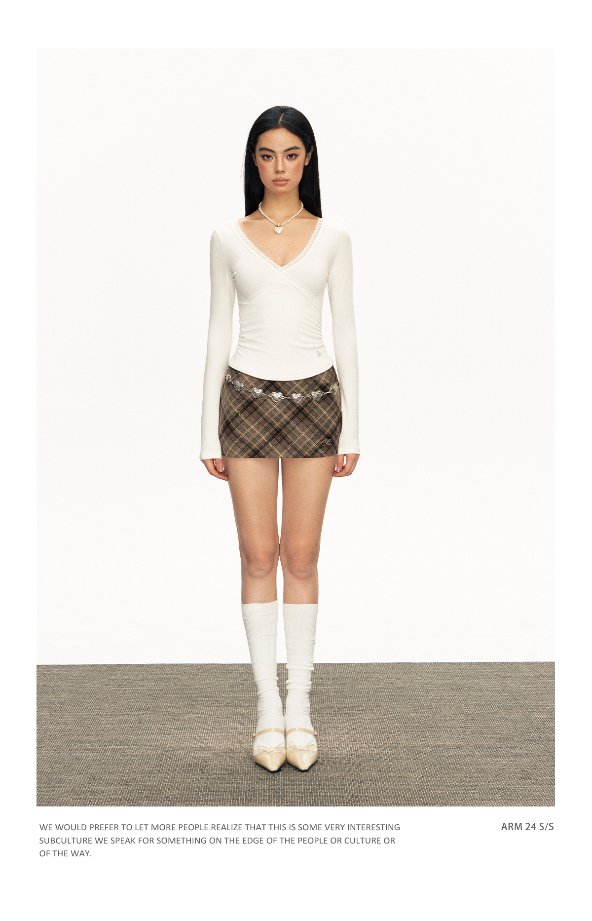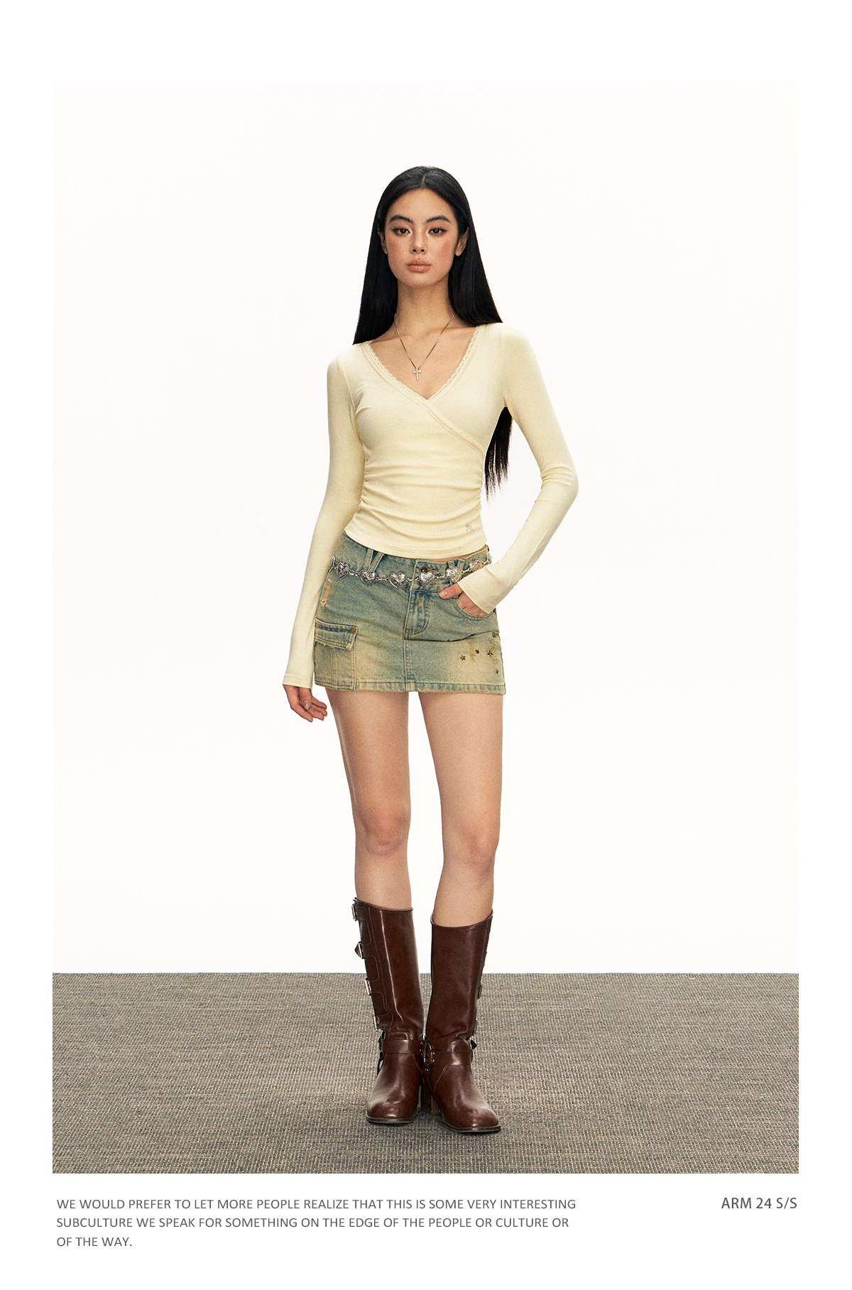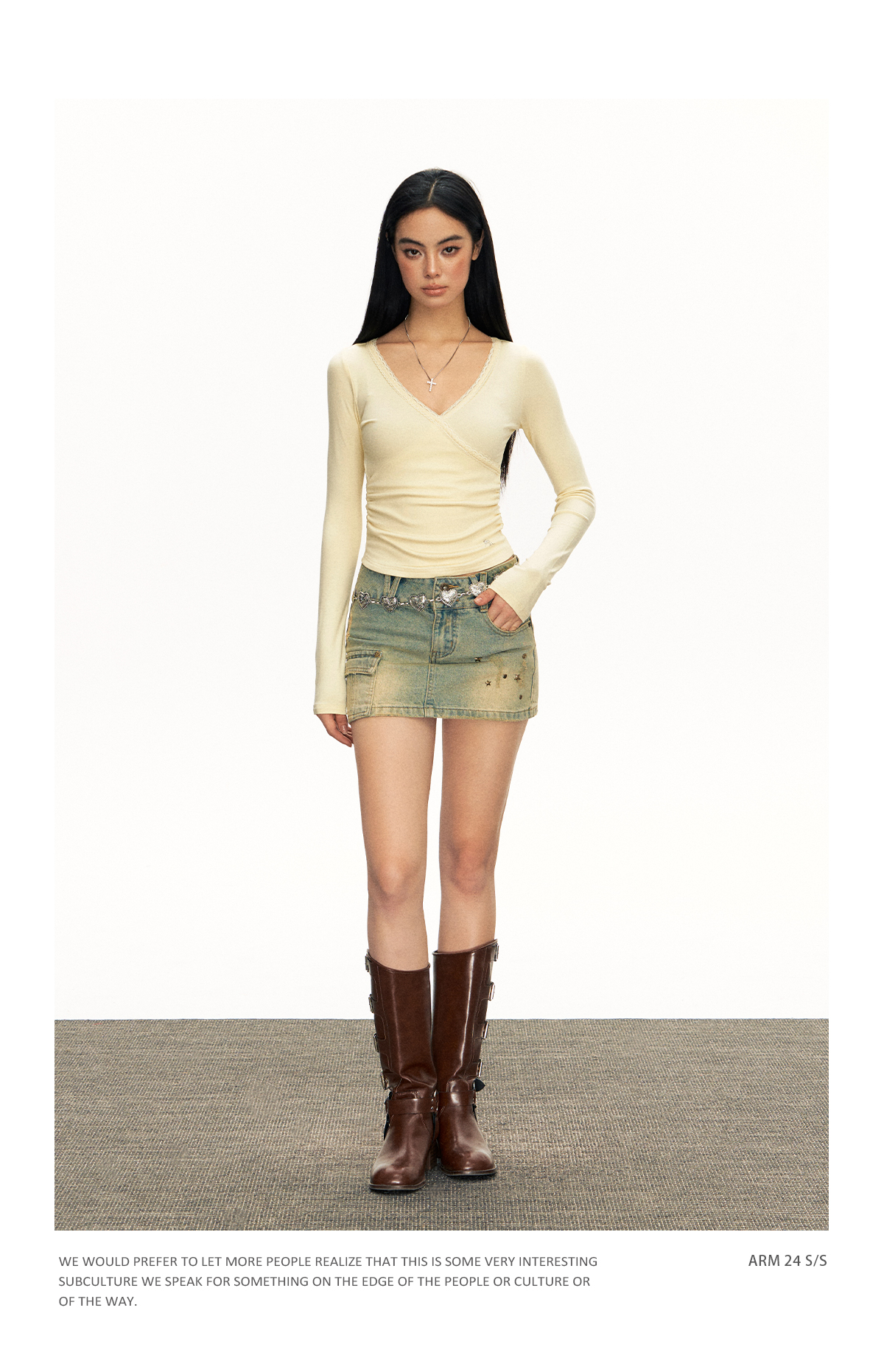 Ariseism美式复古纯色蕾丝V领长袖t恤女2025春秋新款修身显瘦上衣