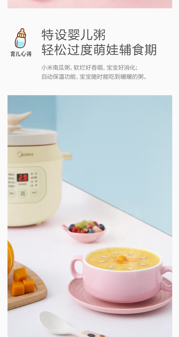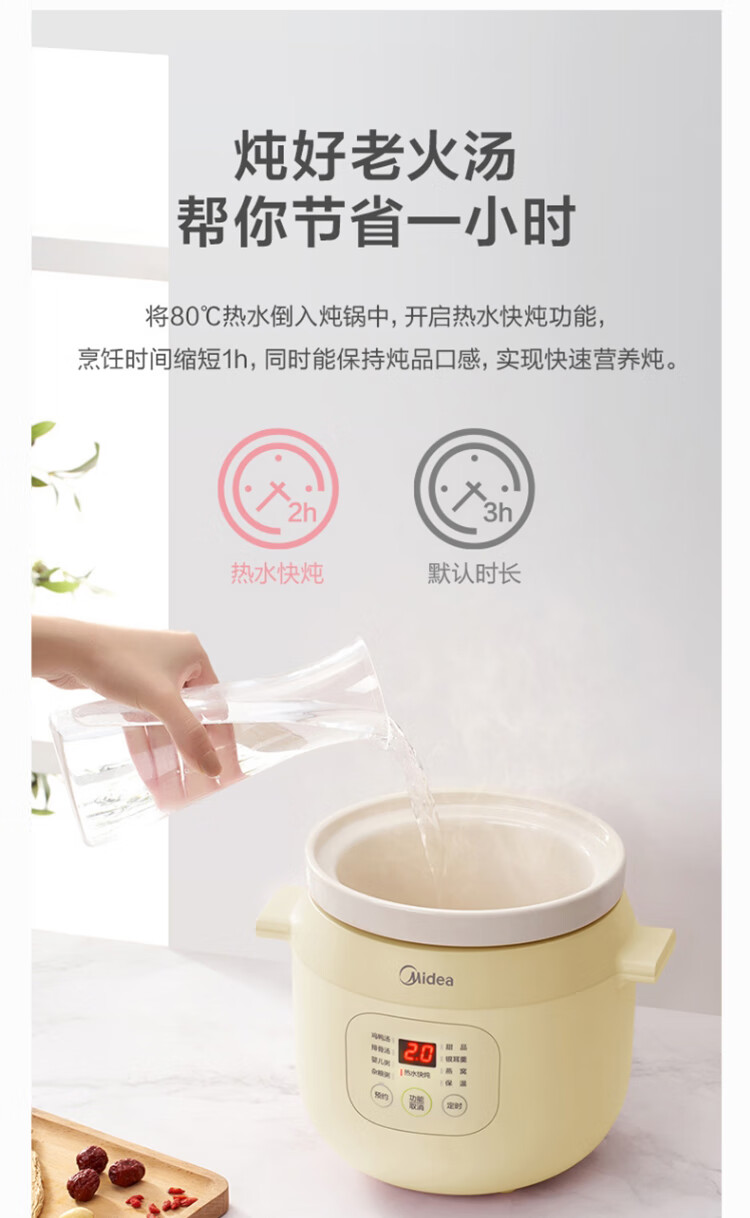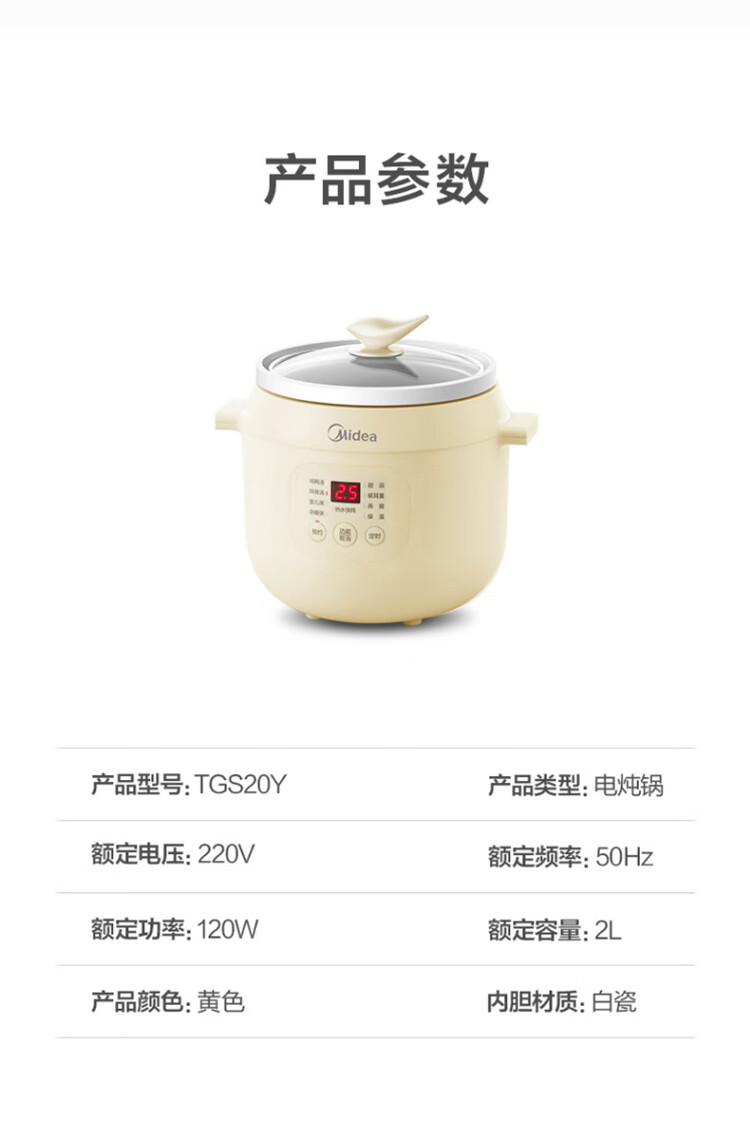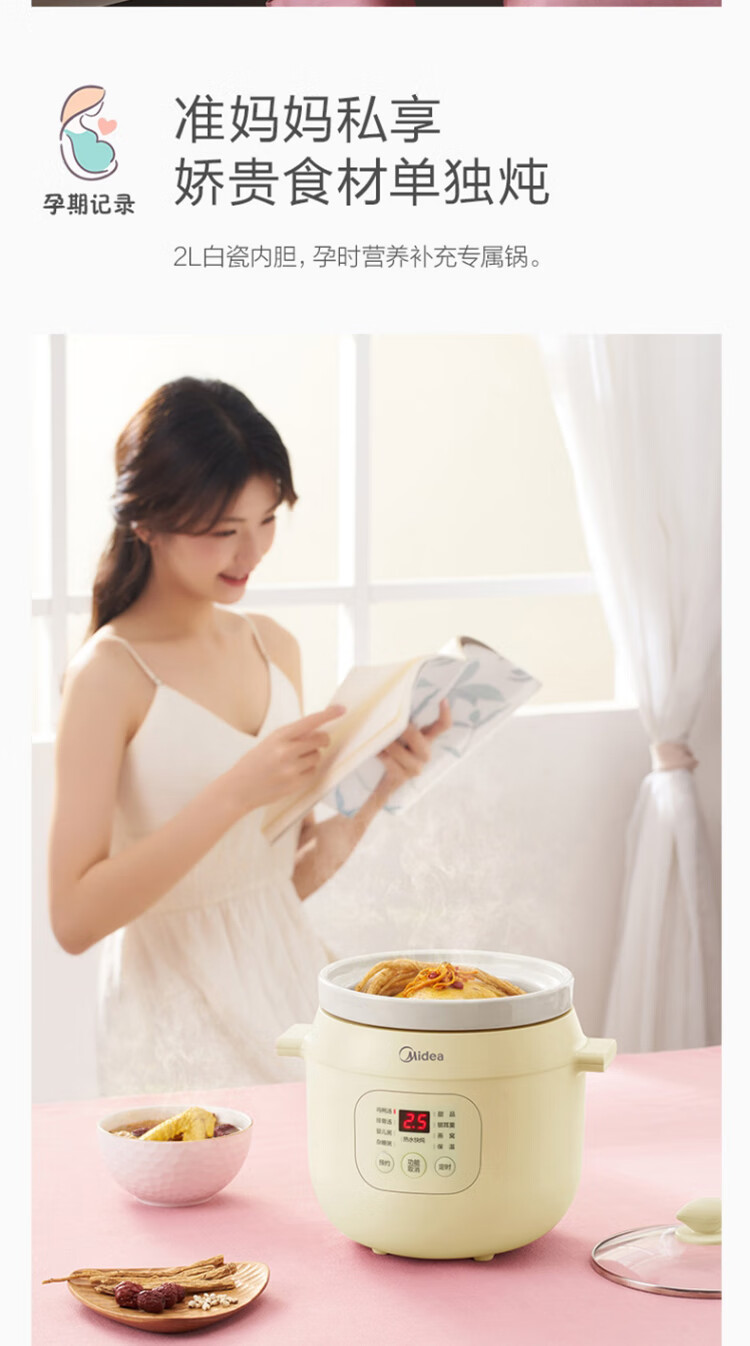 美的(Midea)电炖锅电炖盅BB煲辅食锅婴儿煮粥煲汤锅2L燕窝炖盅白瓷多胆TGS20Y