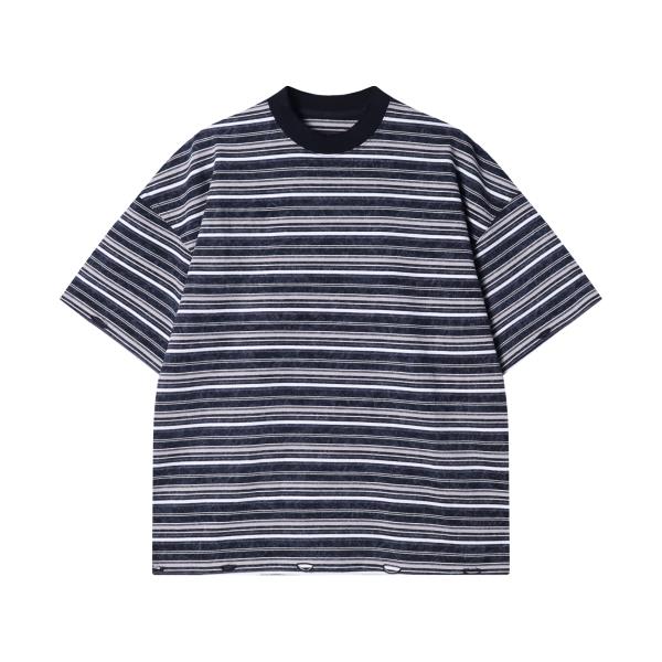 夏季新款时尚个性潮牌撞色条纹破洞圆领短袖T恤百搭潮流宽松上衣