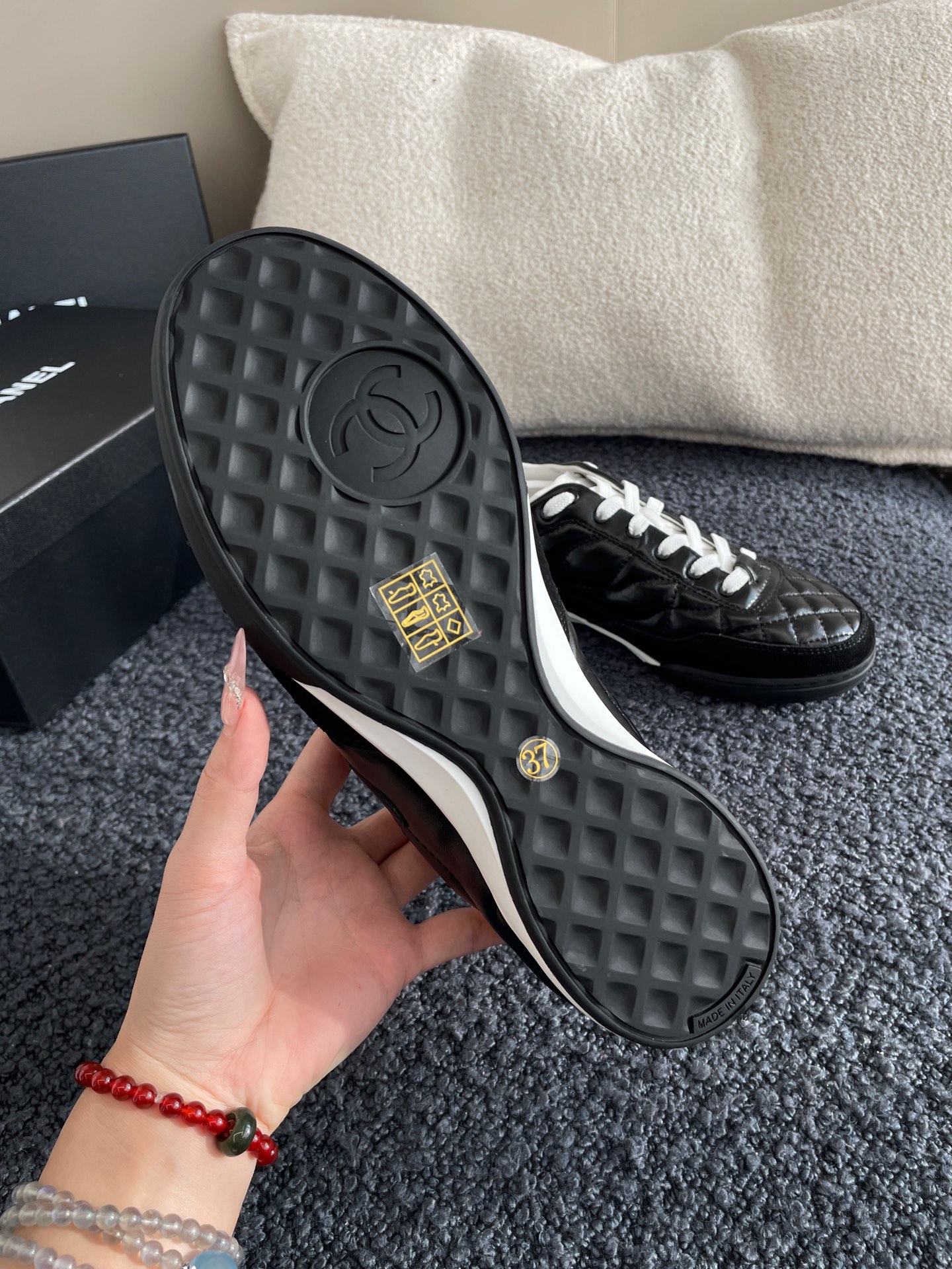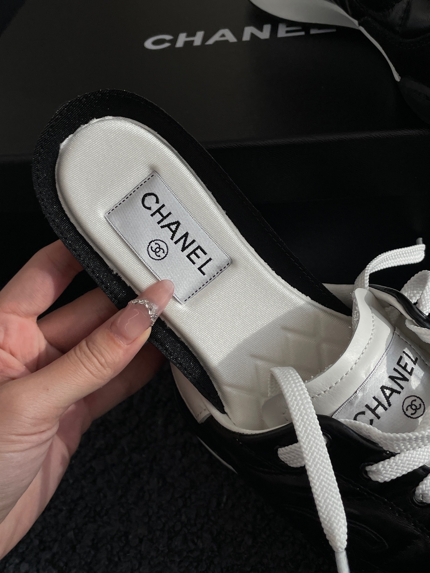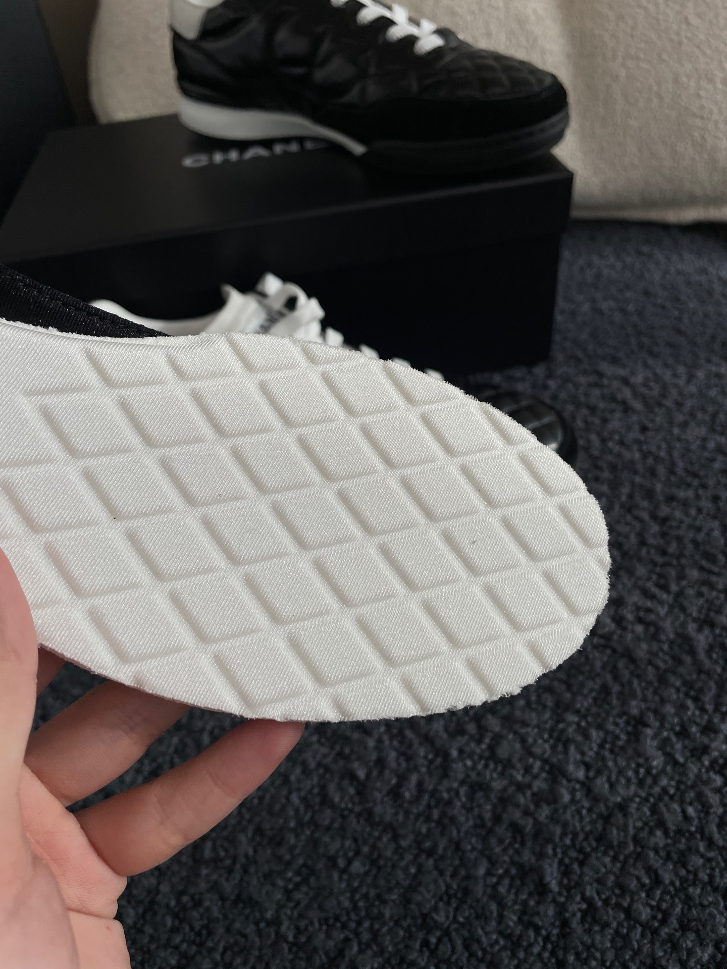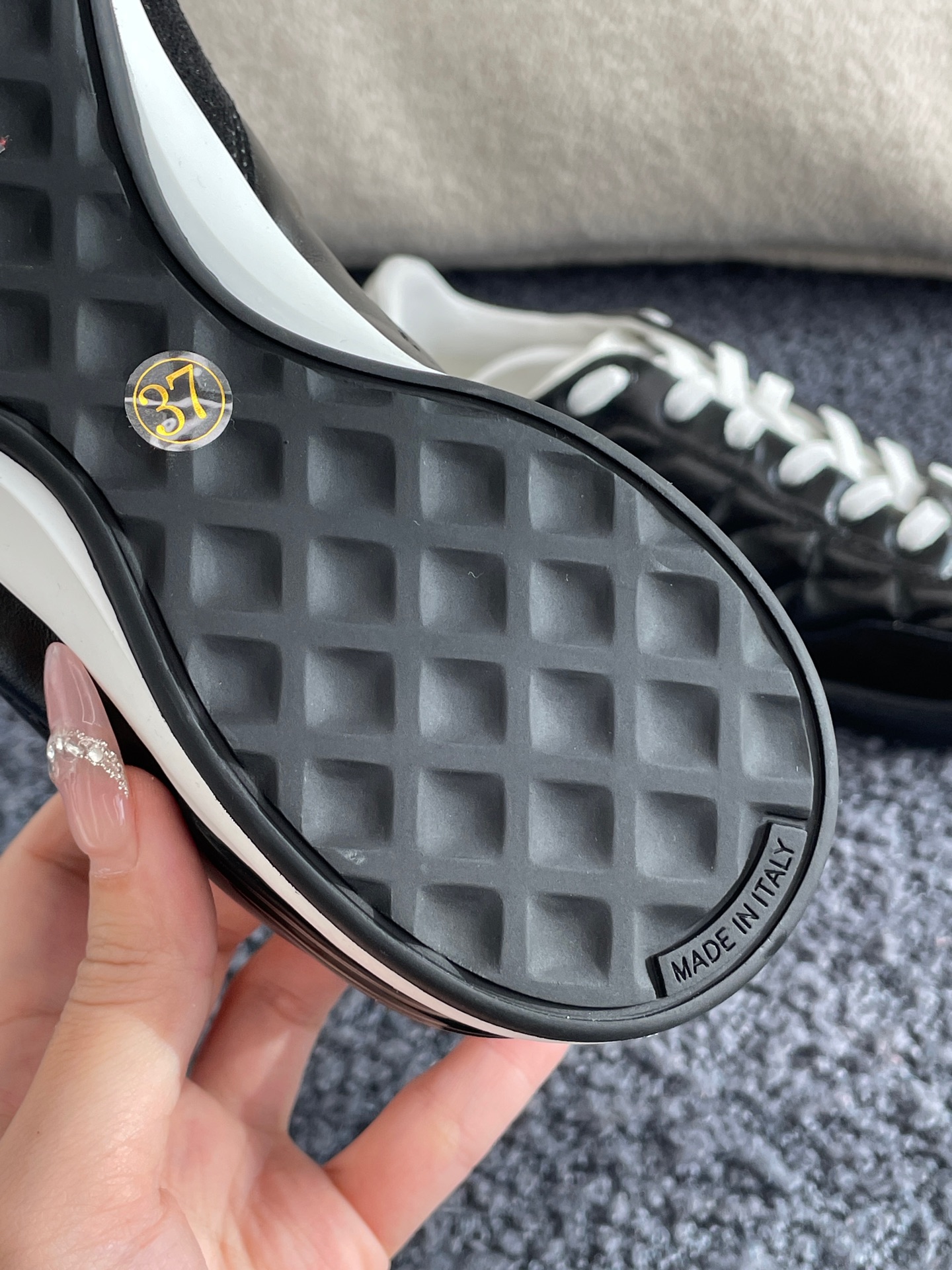 搭配小香经典的运动鞋垫,前脚掌是菱格纹路,加强摩擦力按摩防滑作用,后脚跟有小香的logo标,⚠️注意脚跟位置周边一圈黑色并不是平面拼接的,凸起于鞋垫与鞋子内侧连接防磨脚穿着更舒适!