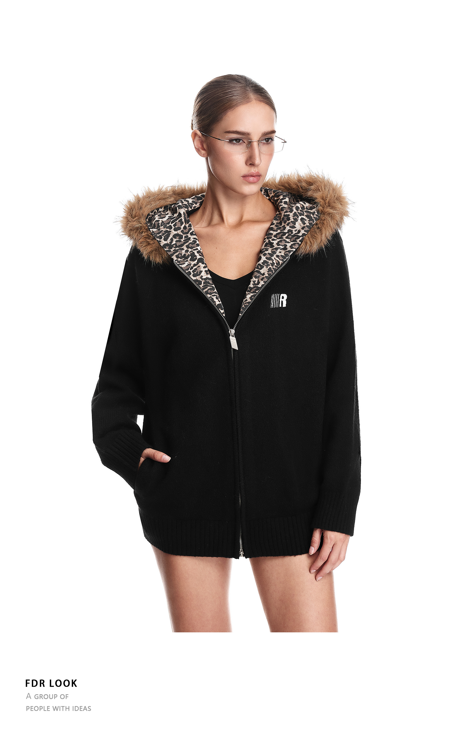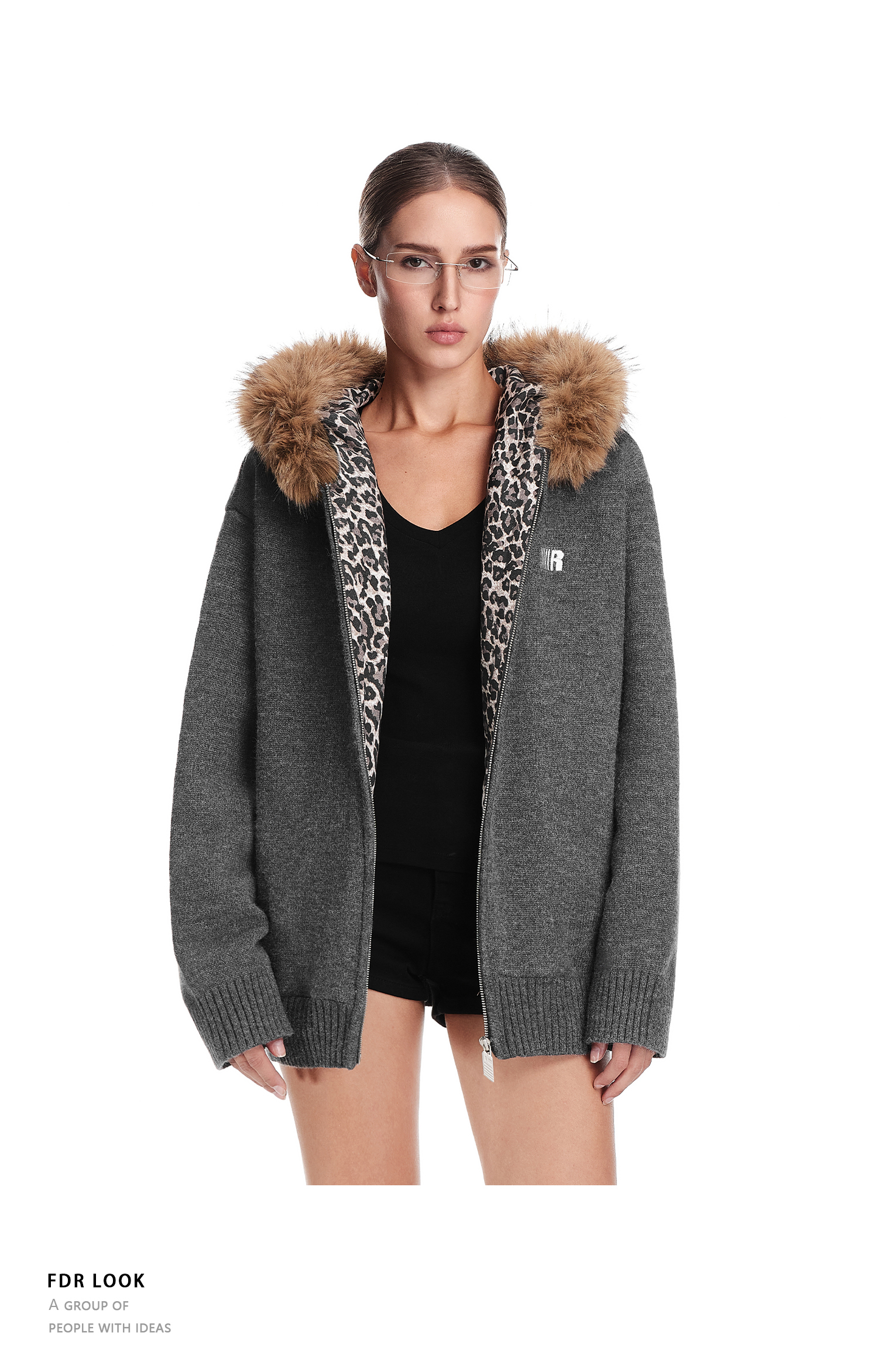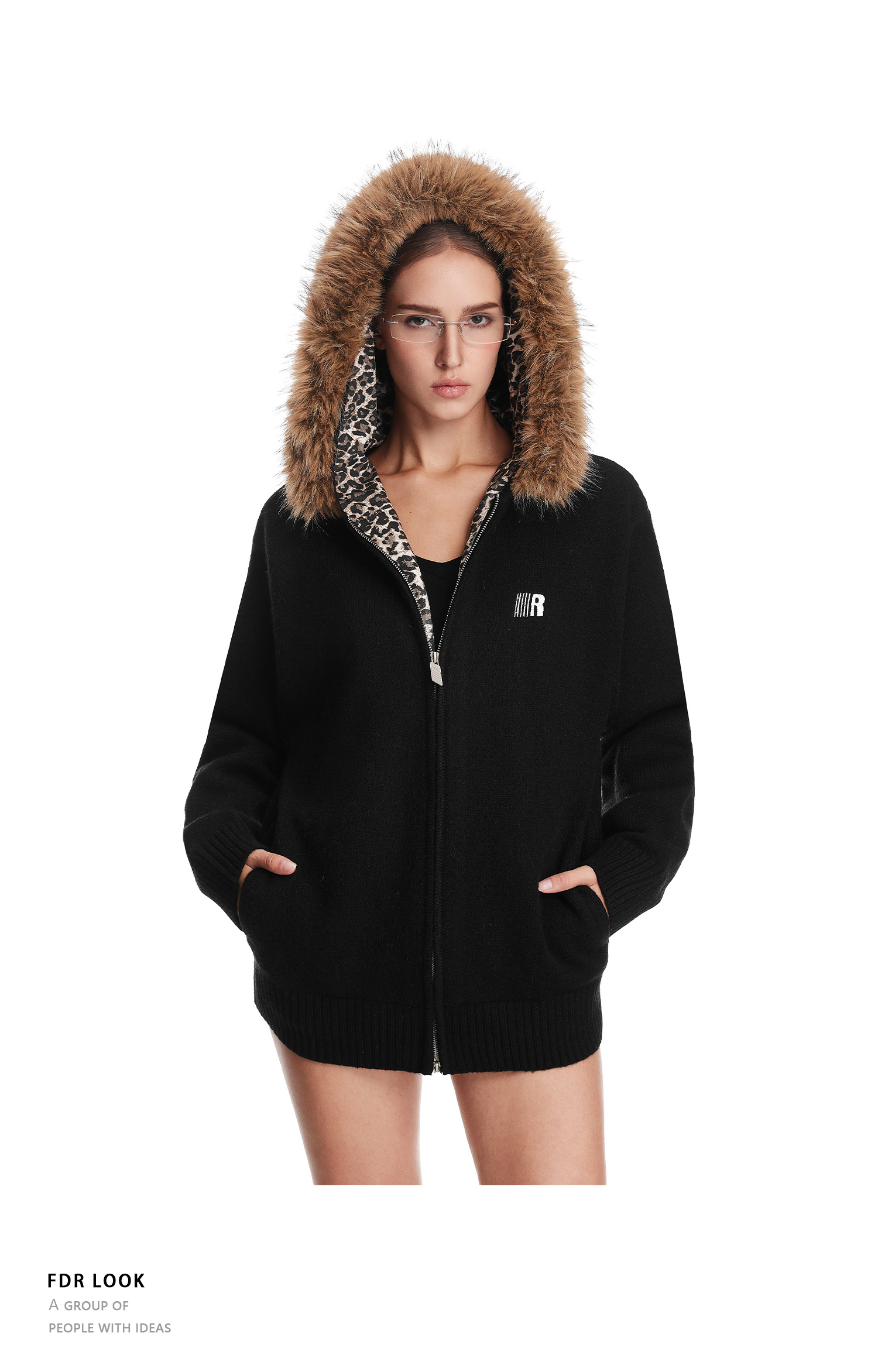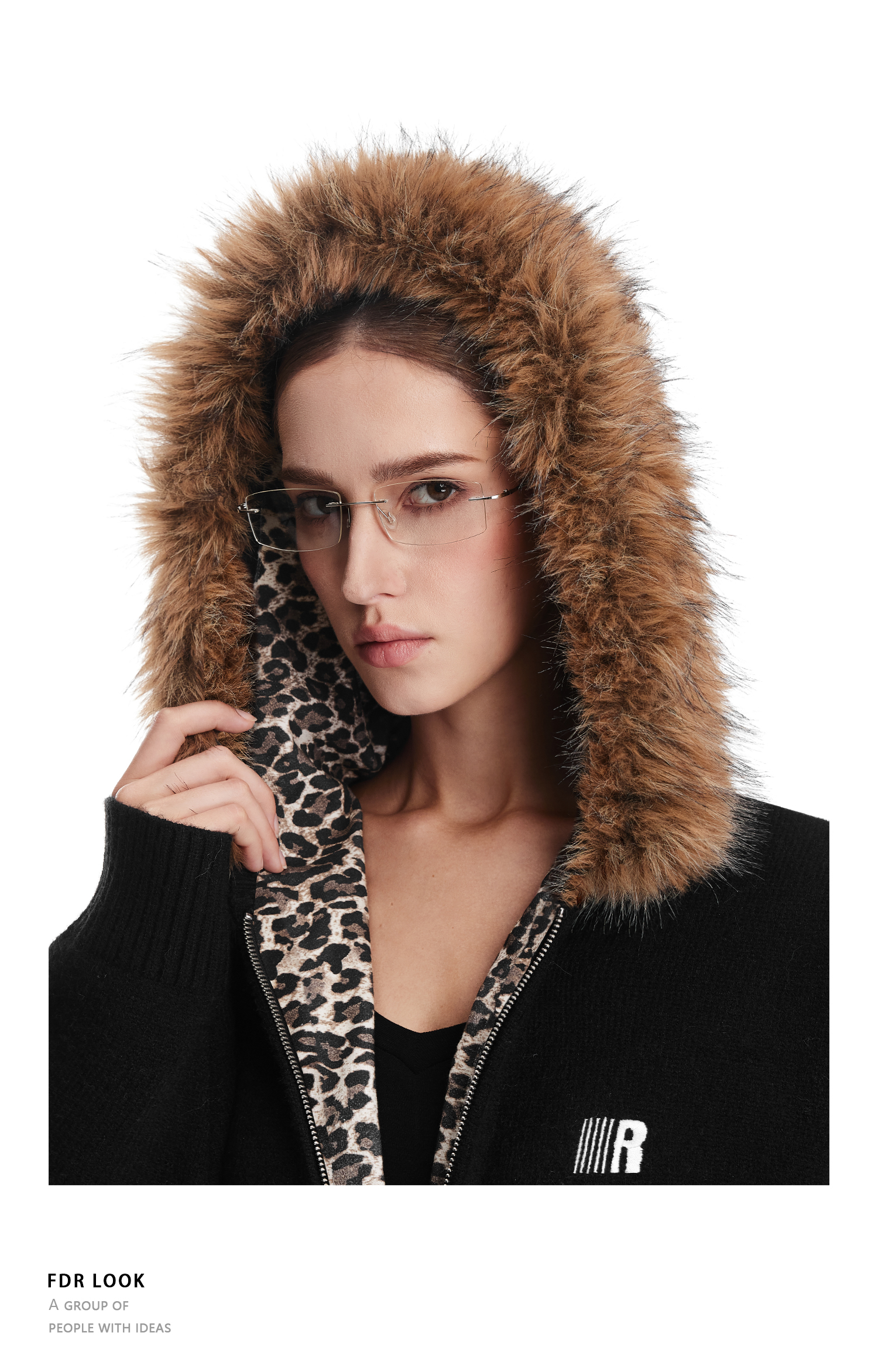 FDR官方店 毛领豹纹毛衣开衫外套女2025新款秋冬连帽情侣针织衫男