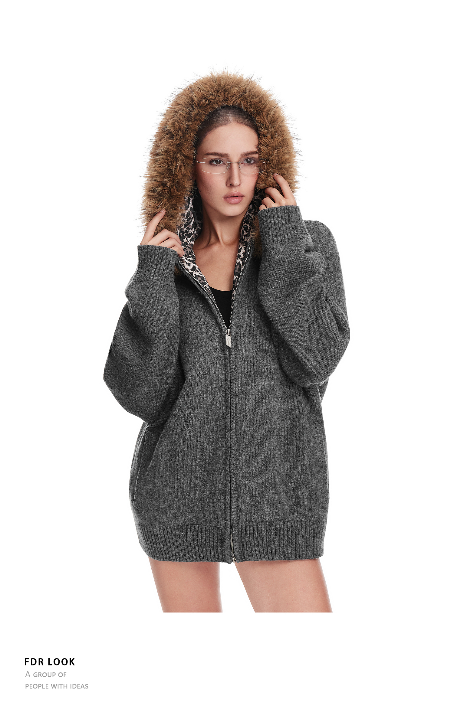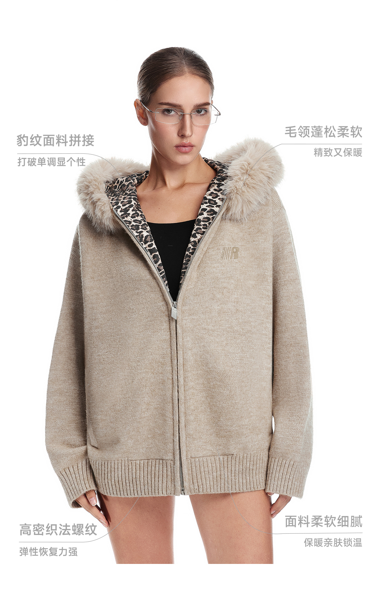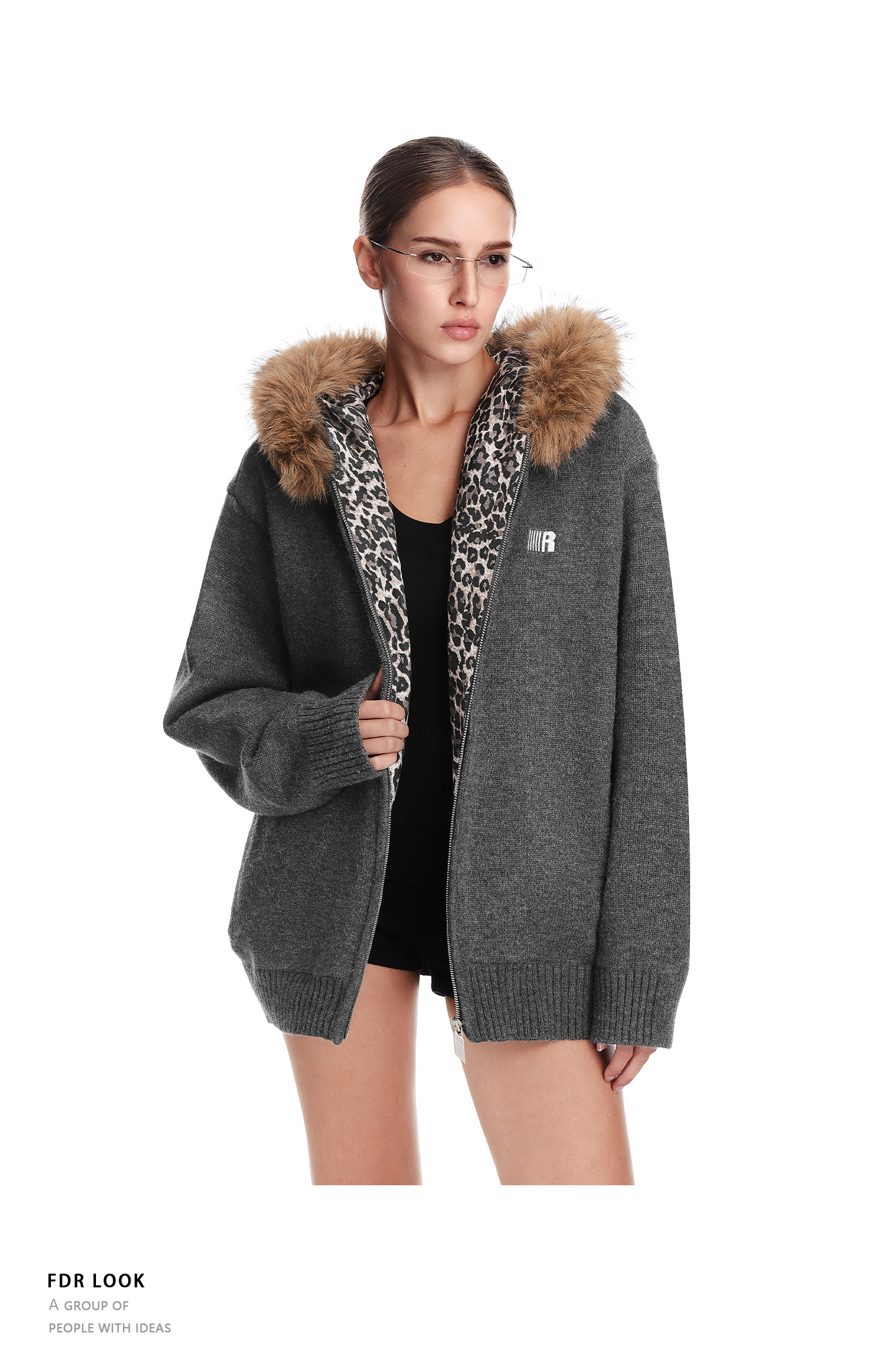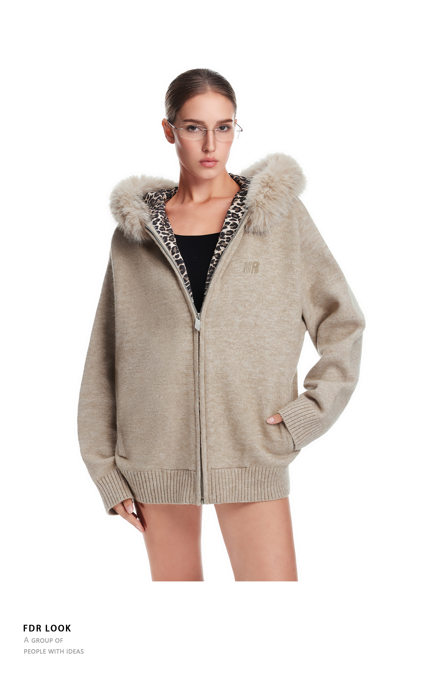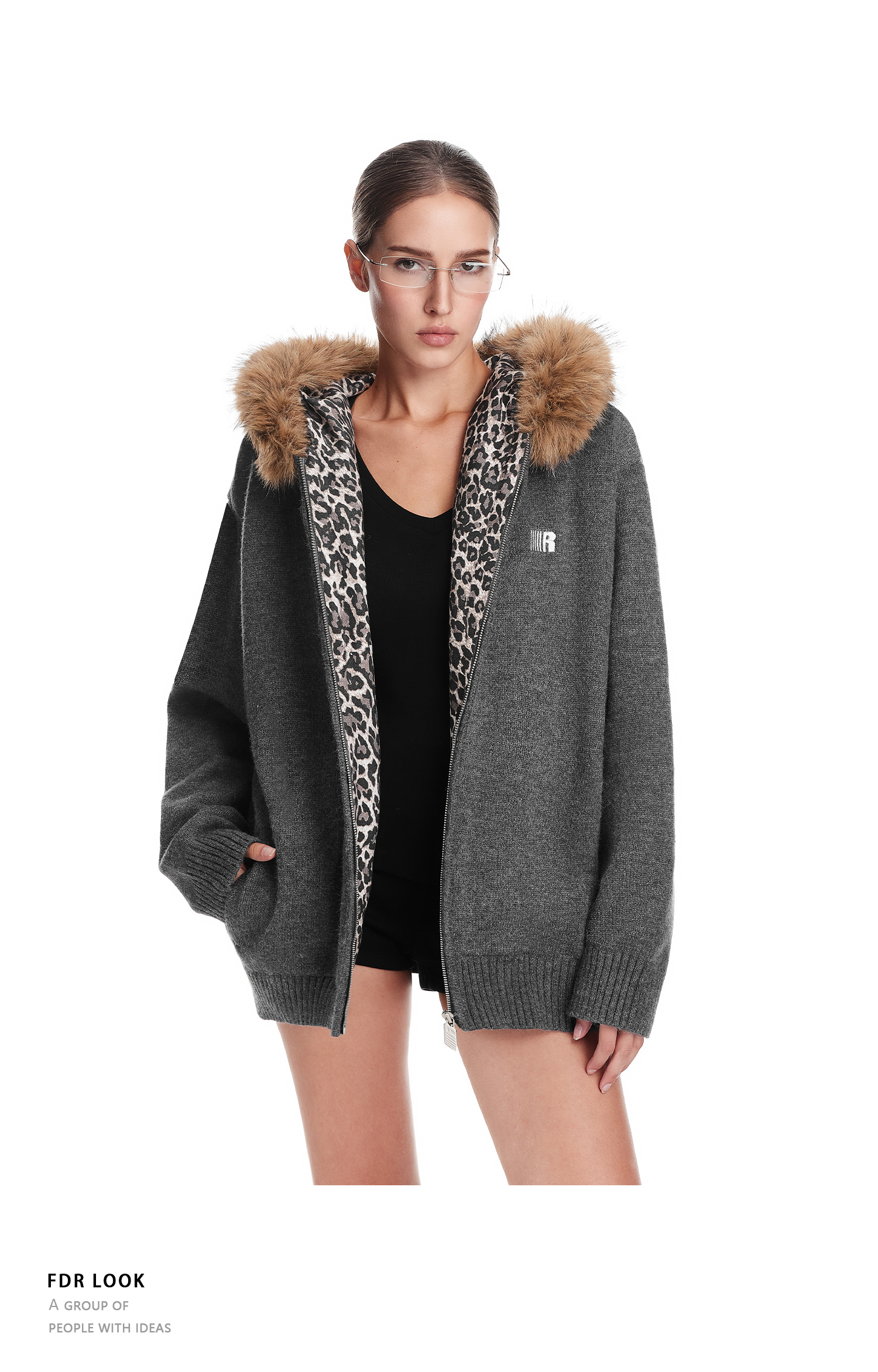 FDR官方店 毛领豹纹毛衣开衫外套女2025新款秋冬连帽情侣针织衫男