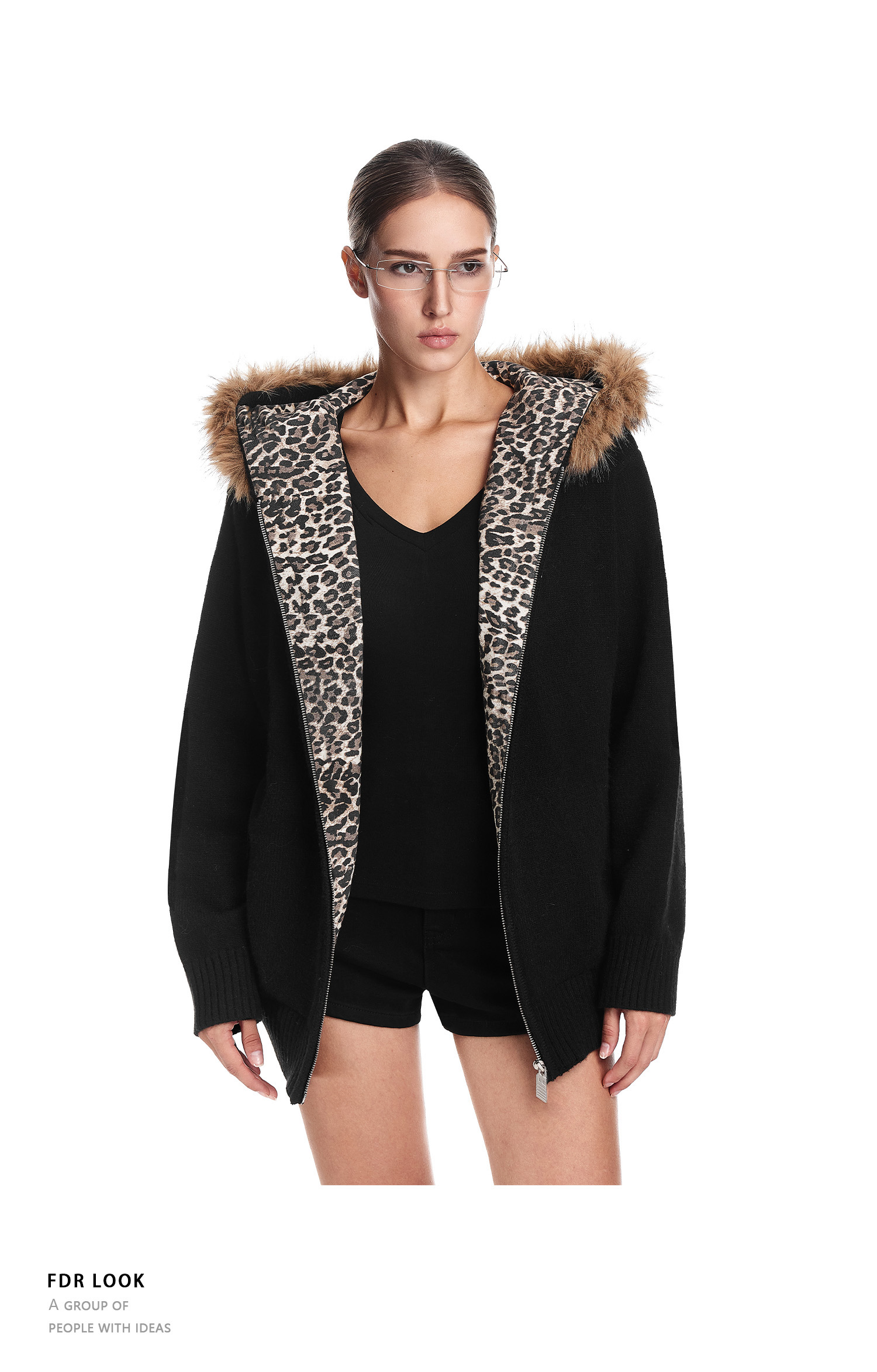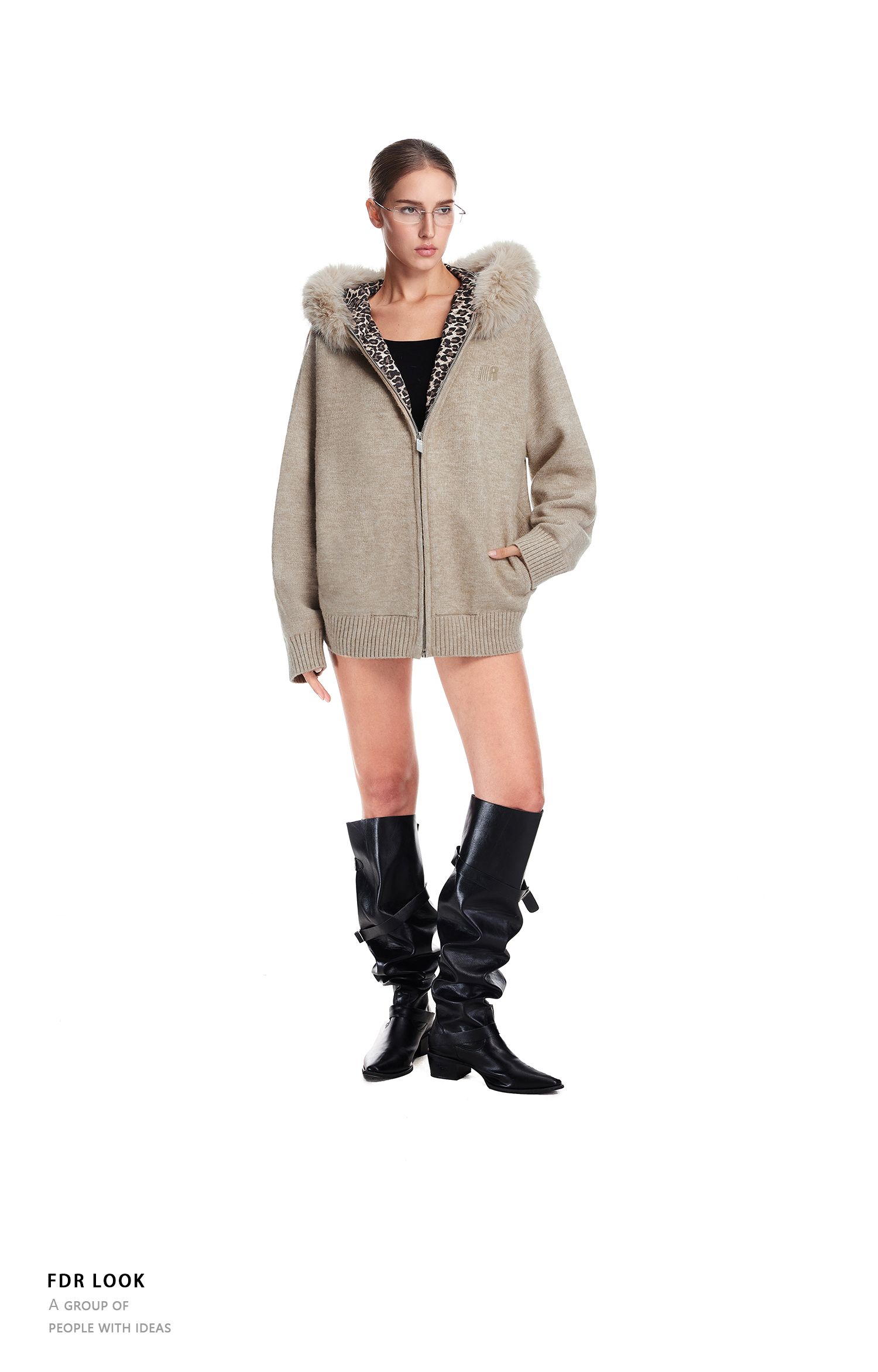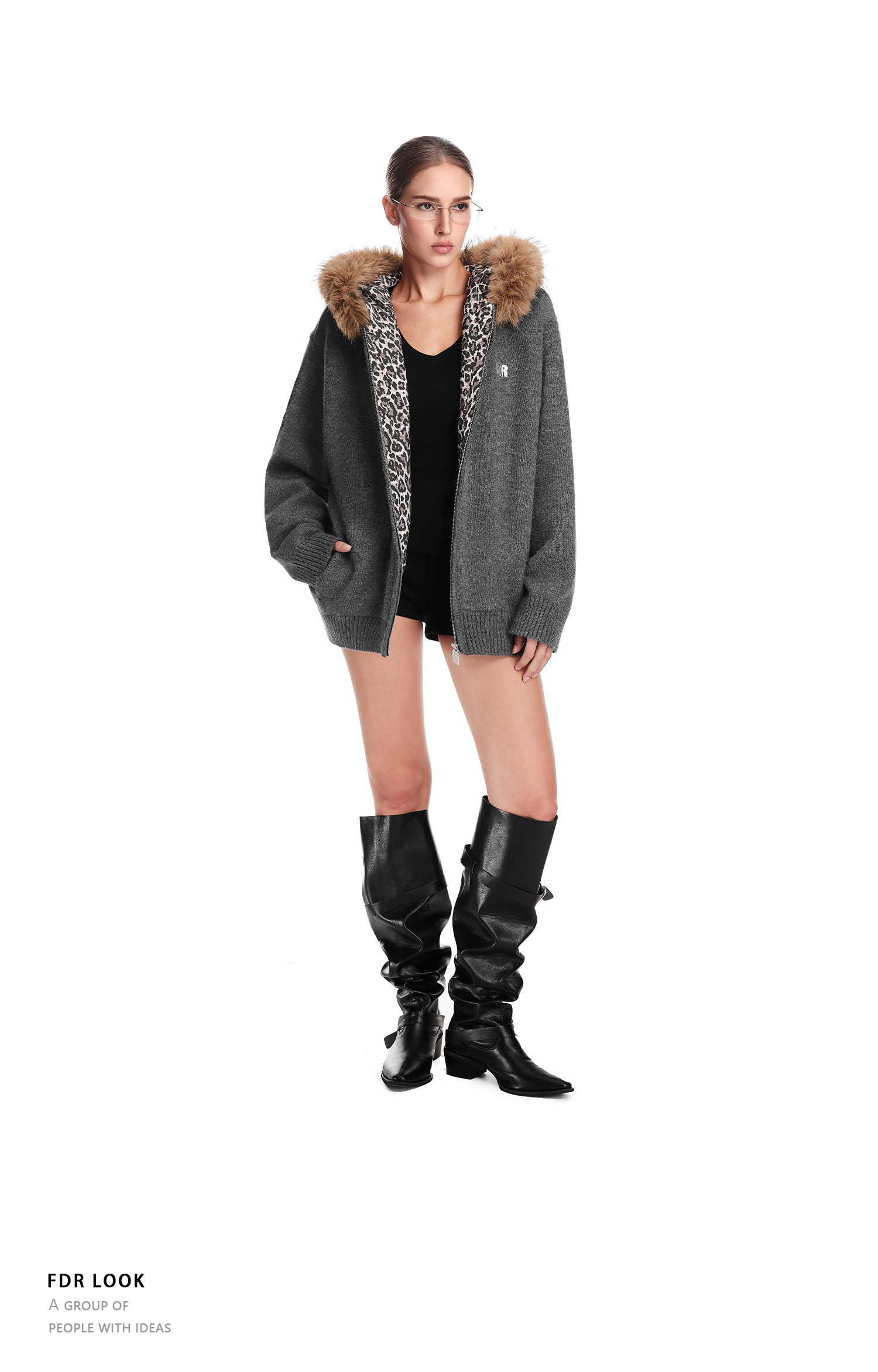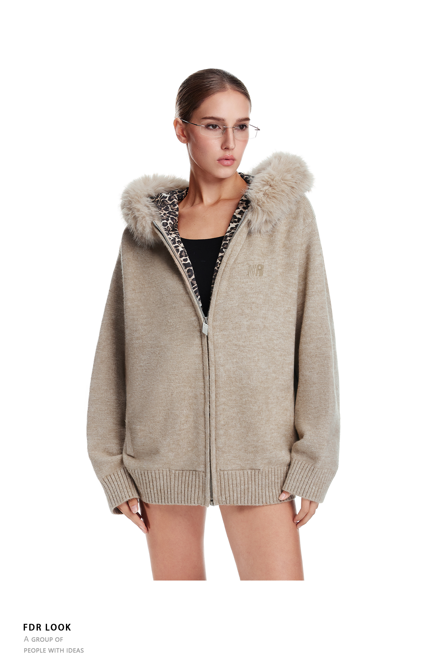 FDR官方店 毛领豹纹毛衣开衫外套女2025新款秋冬连帽情侣针织衫男