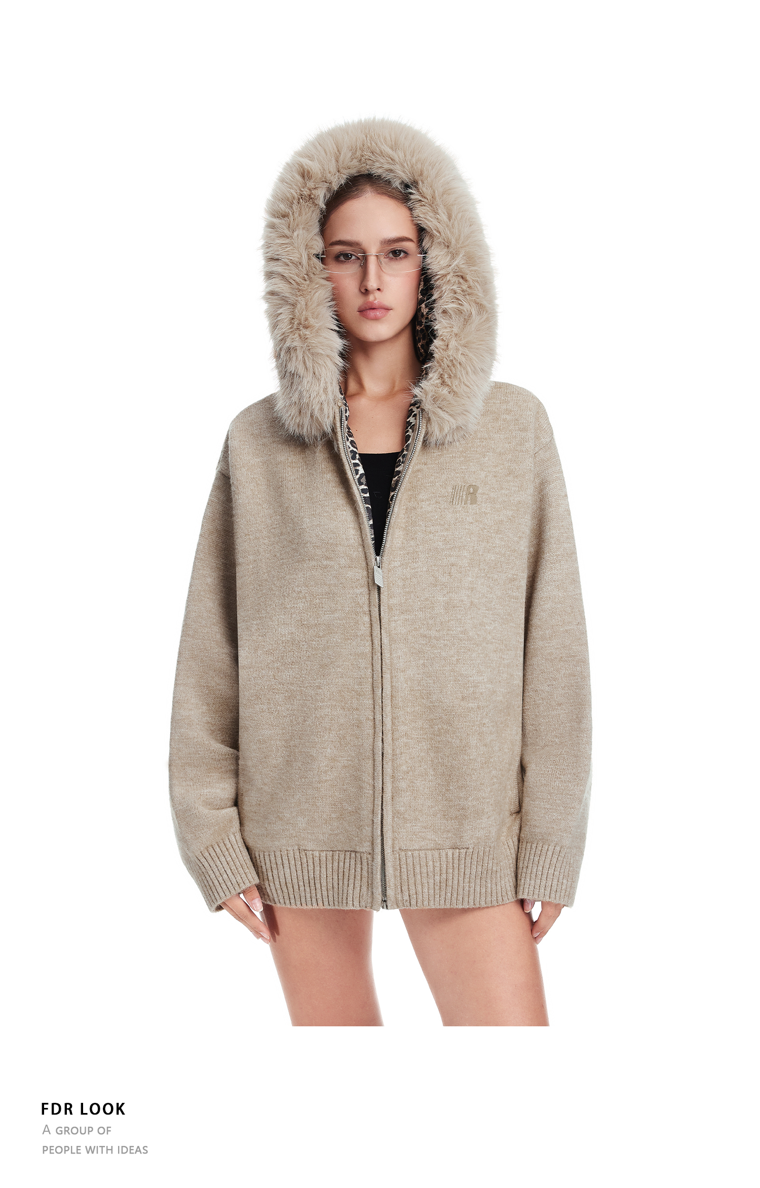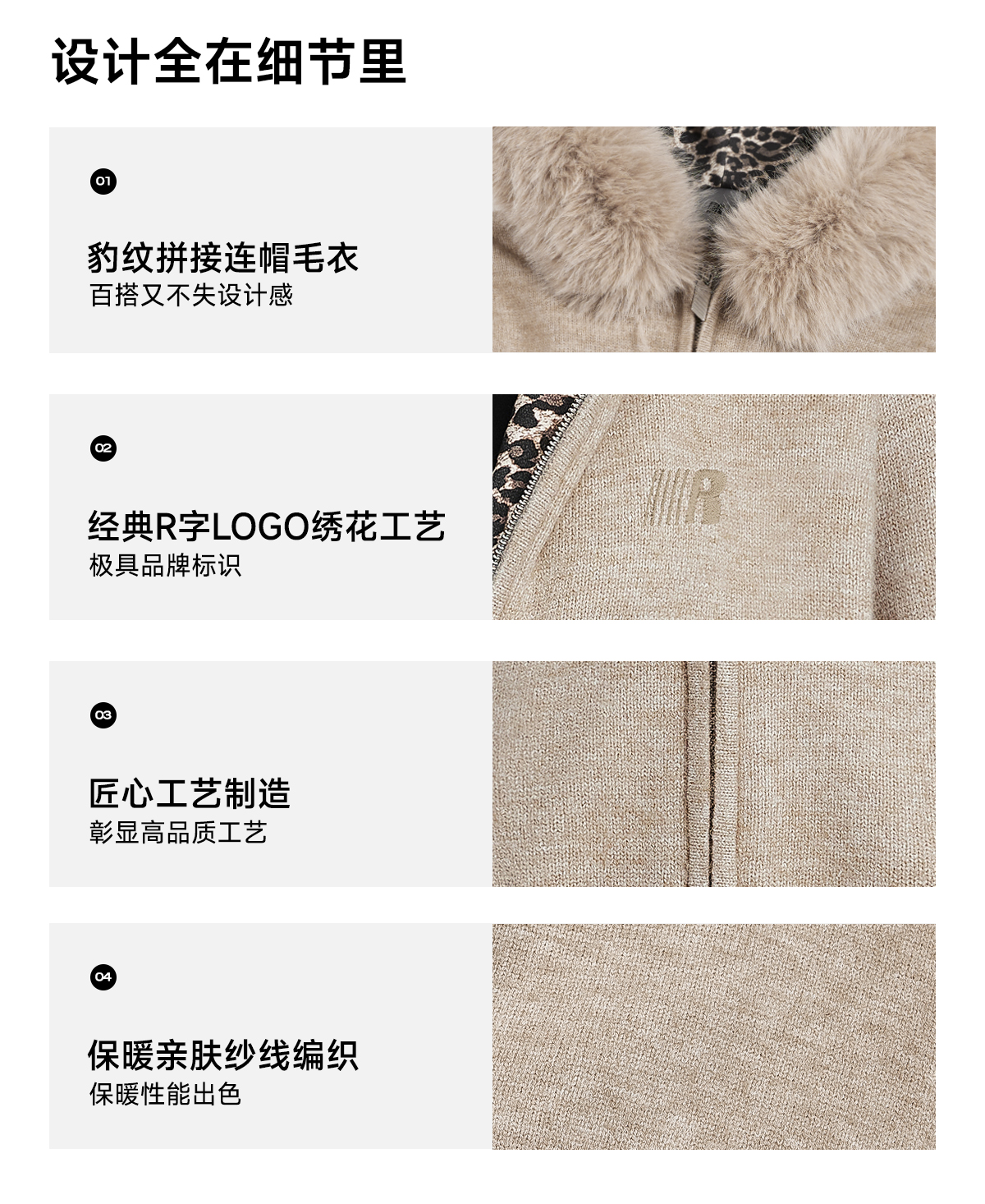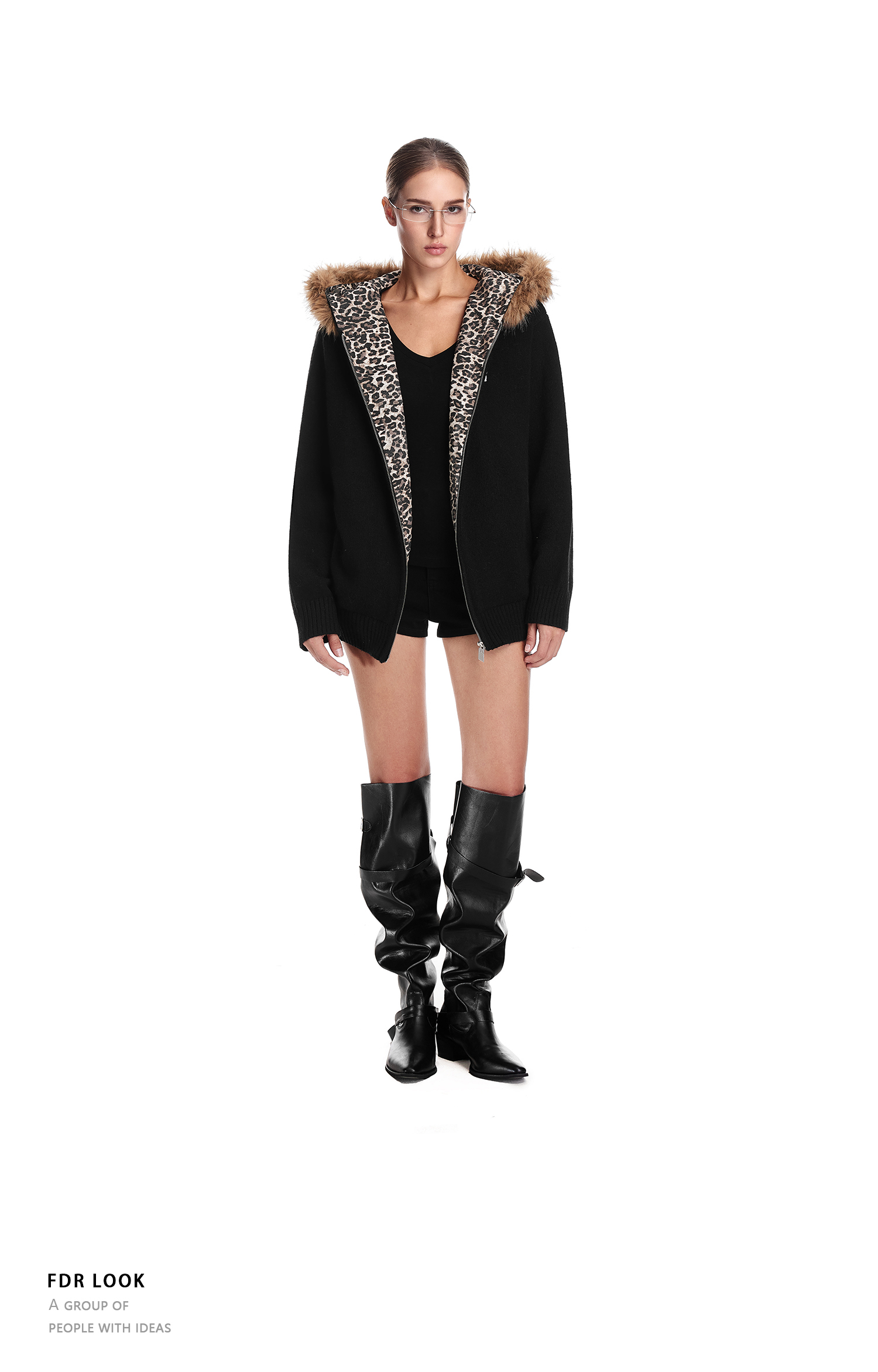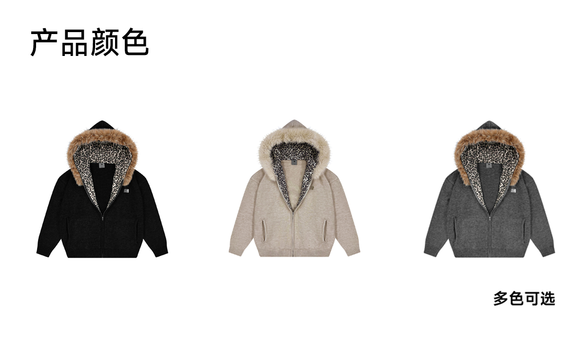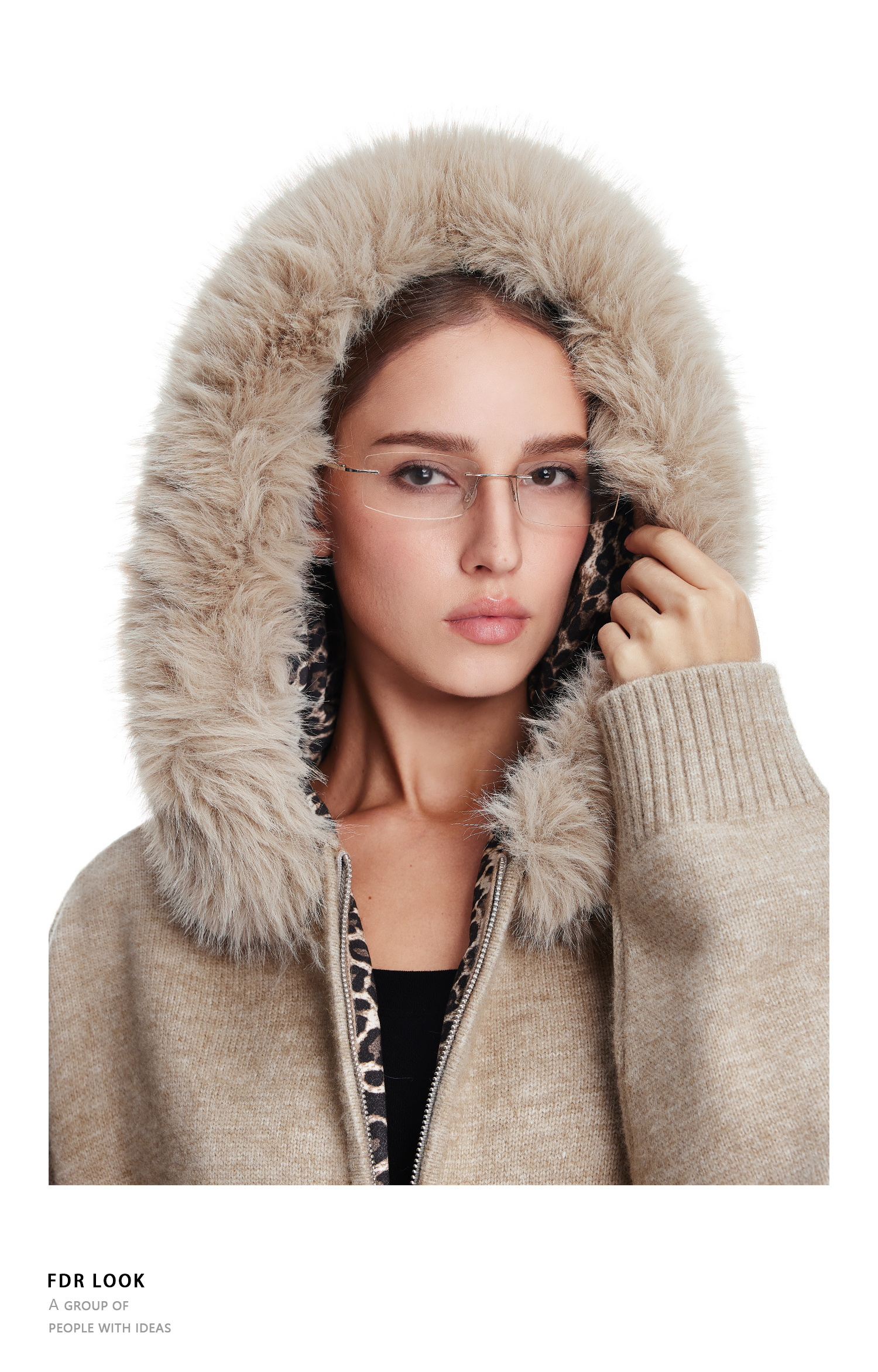 FDR官方店 毛领豹纹毛衣开衫外套女2025新款秋冬连帽情侣针织衫男