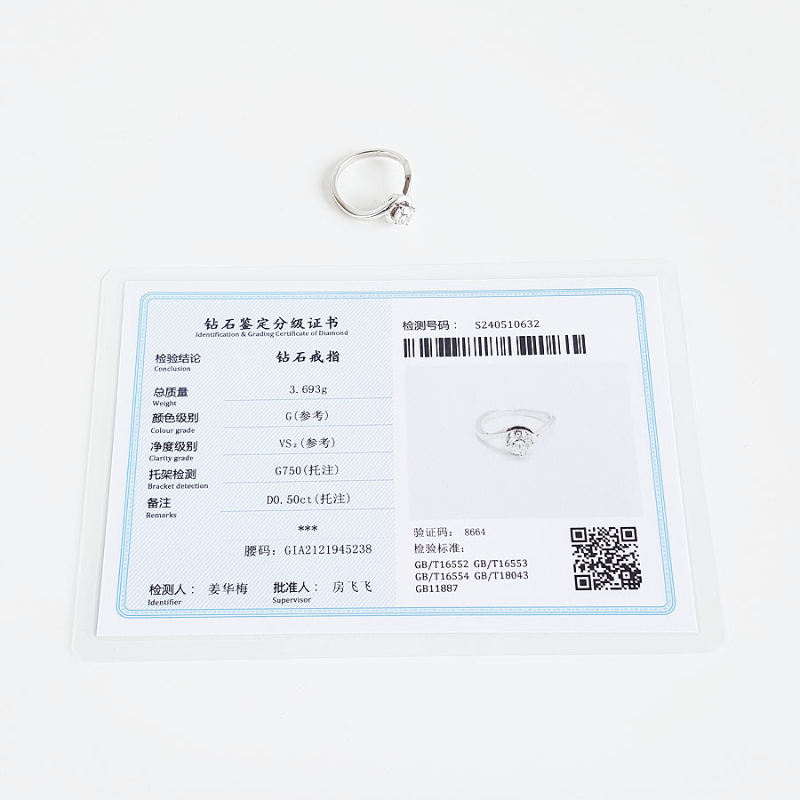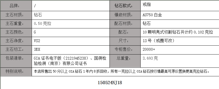 【天然正品】AU750白金钻石戒指0.50克拉G VS2 3EX 13号(戒圈可改)150524NJ18