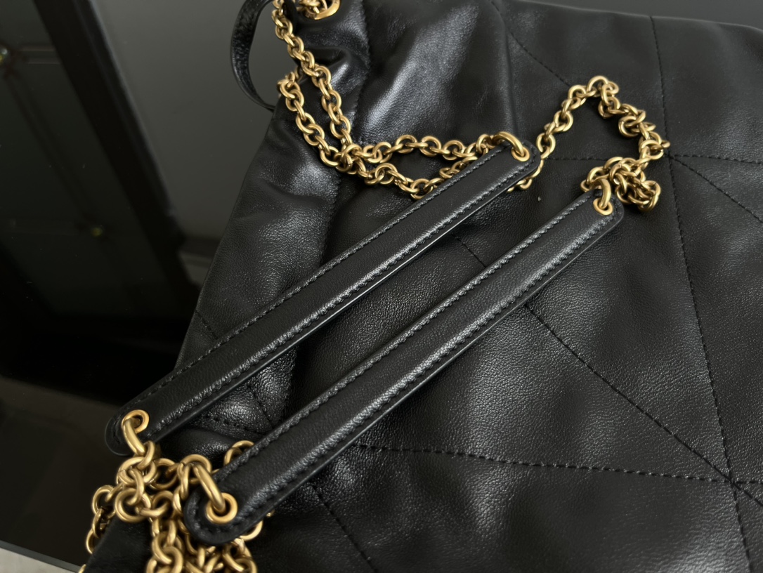 肩带处还贴心的设计了皮肩带 大大缓解了包包重量给肩膀带来的压力 使得背起来更轻松!比起小香垃圾袋设计更人性化,格外体贴!