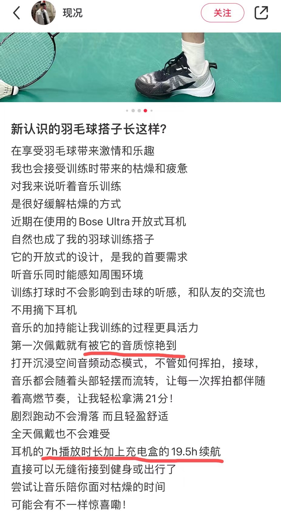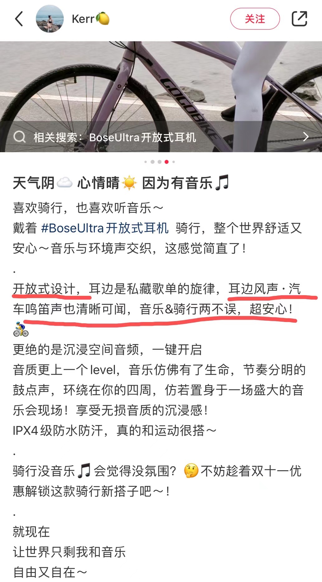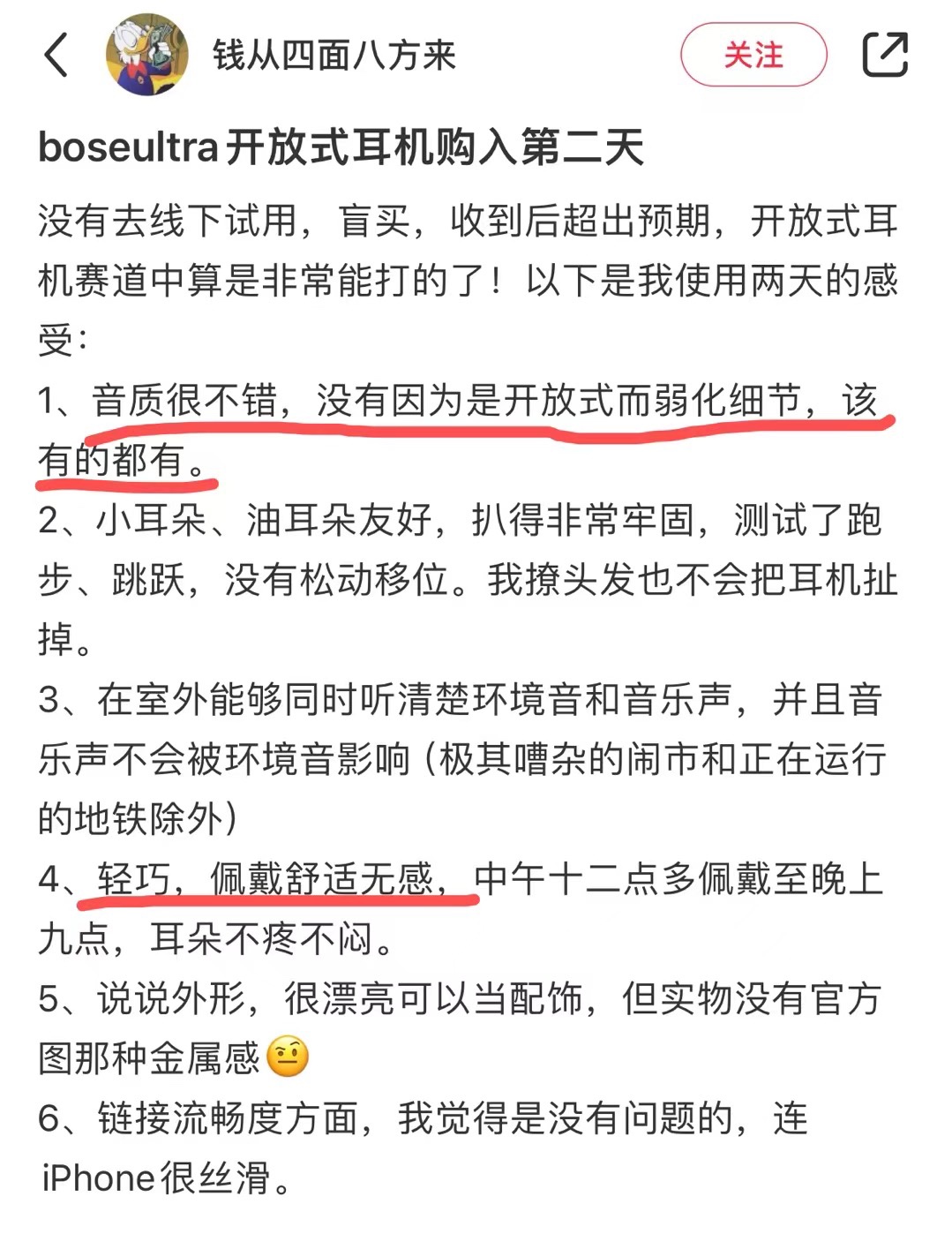 ……那些生活中,在享受音乐的同时又担心错过别处某些声响的不安感,因为Bose的出现,都迎刃而解!真正做到了音乐、生活、工作、运动四不误!!它的气传导技术,更是对耳朵十二分的友好!因为不必塞进耳朵里,它可以完美做到不堵塞耳道、不闷热、不易掉的同时,完美享受美妙音质!!