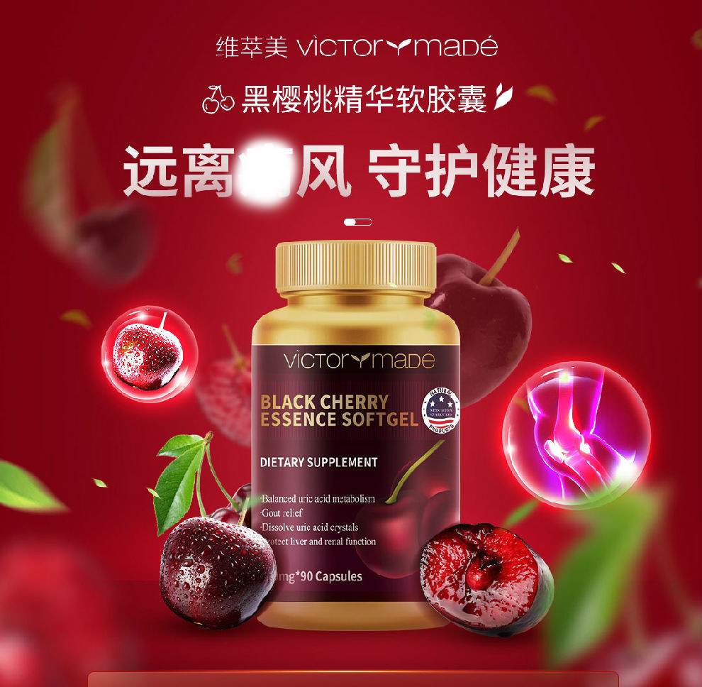 美国维萃美Victorymade黑樱桃精华软胶囊改善尿酸高500mg90粒瓶
