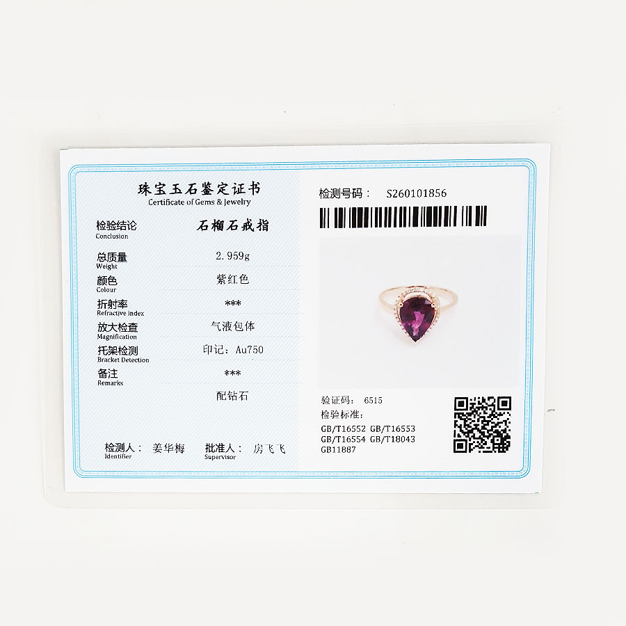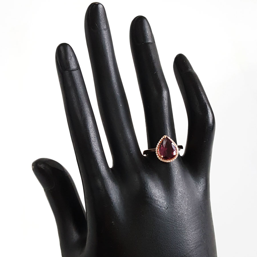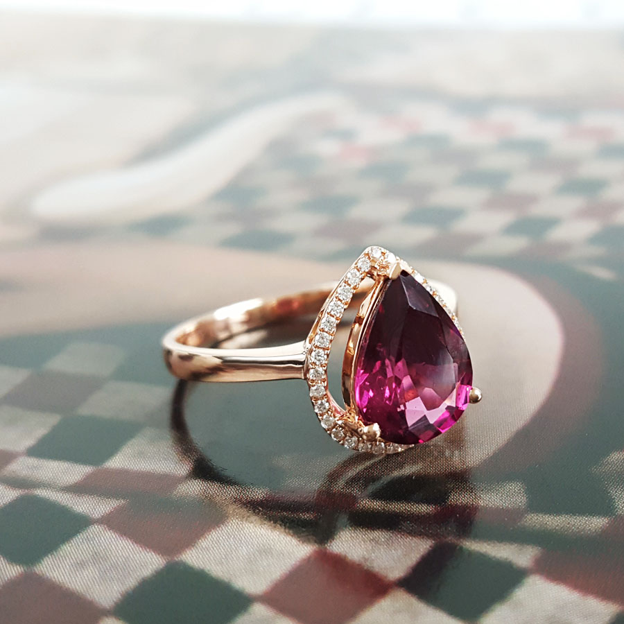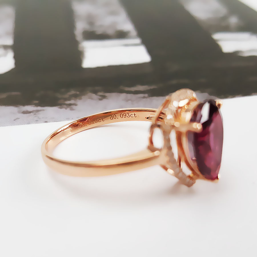 名称 | AU750玫瑰金镶钻镶天然水滴型紫牙乌2.519克拉石榴石戒指 |