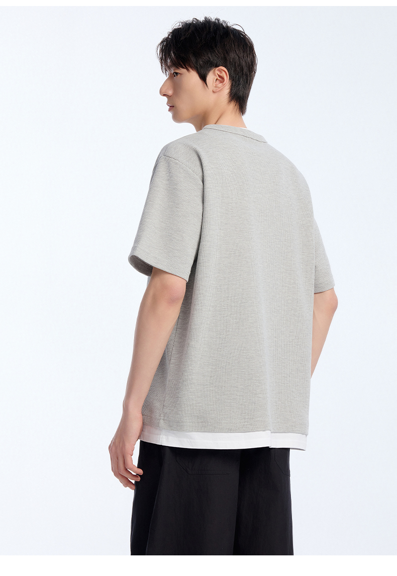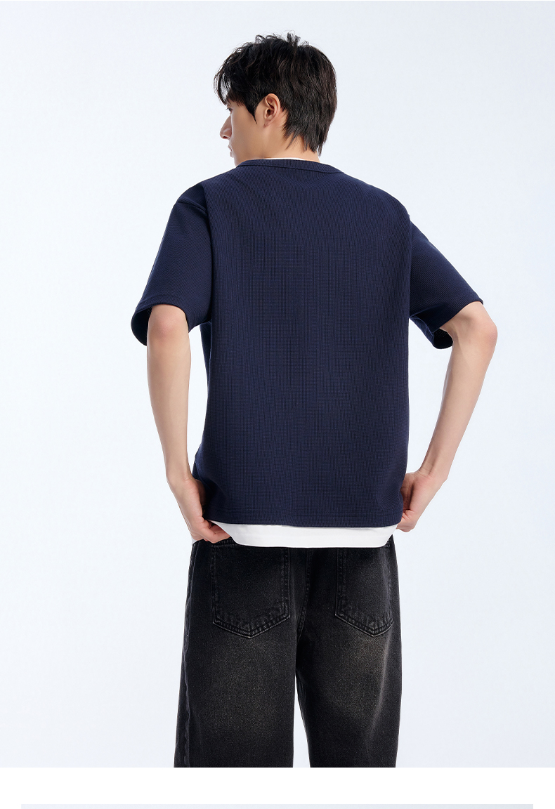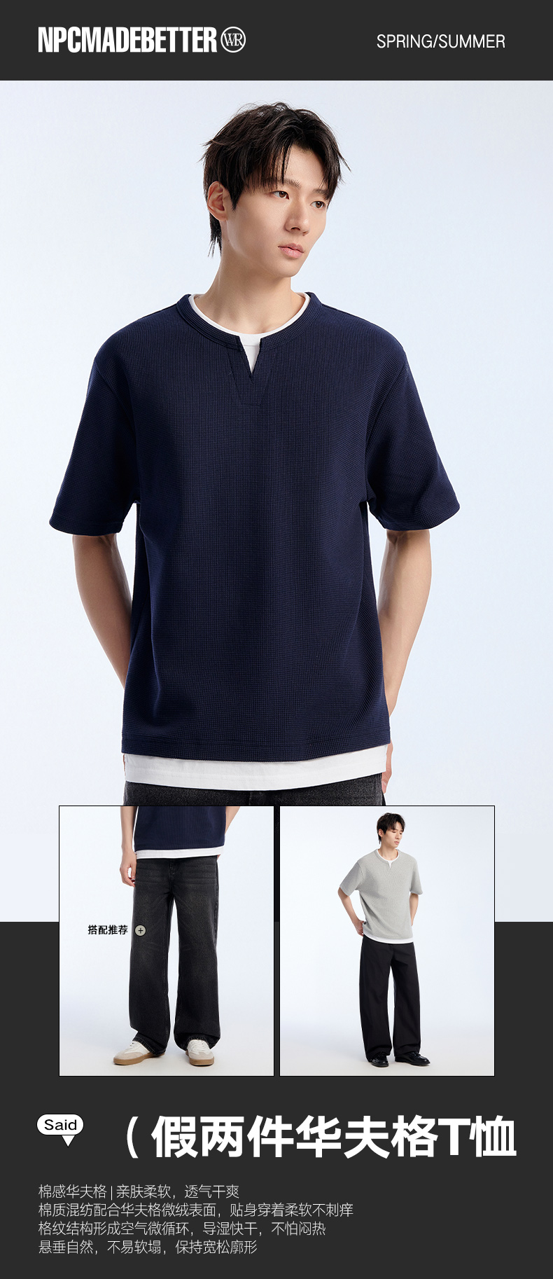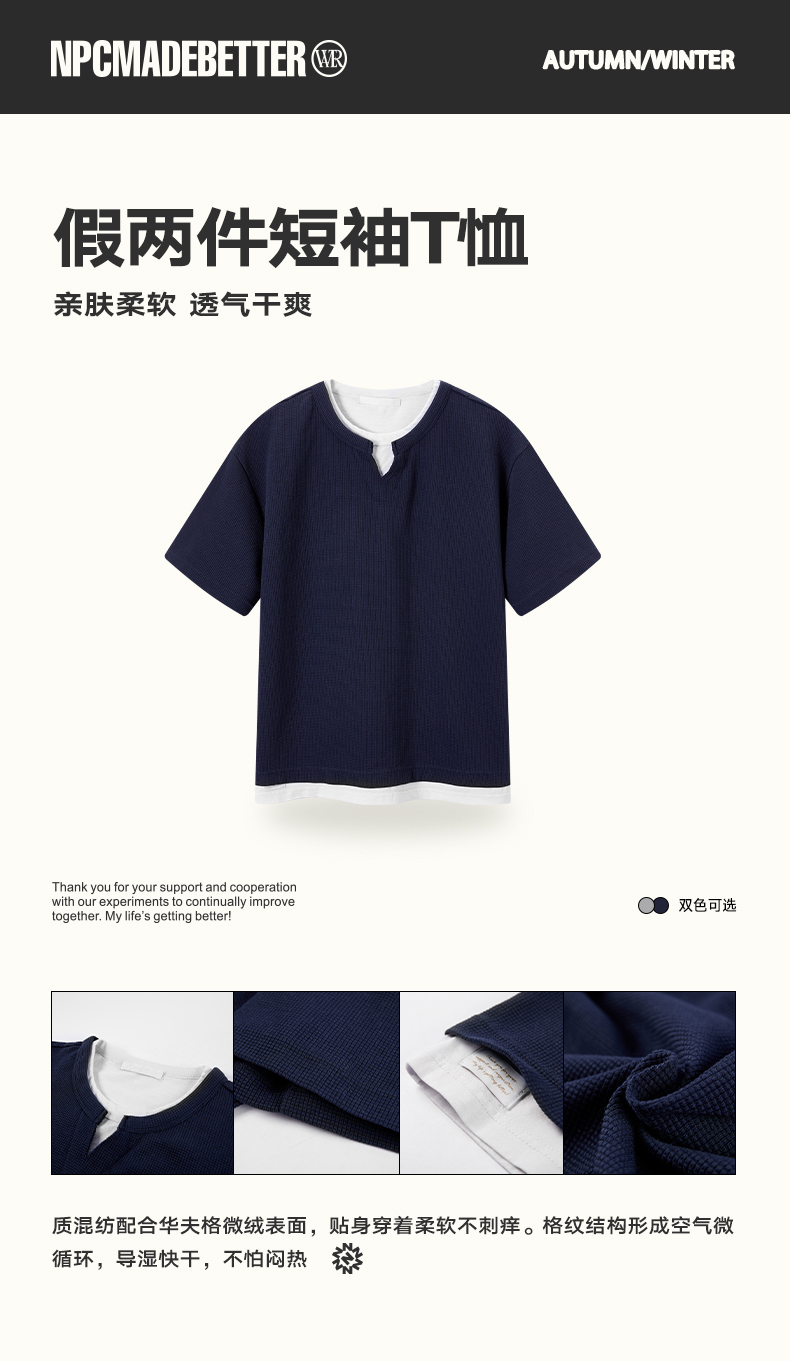 NPC潮牌棉混纺宽松假两件华夫格短袖T恤撞色亲肤春上新NP61TE12