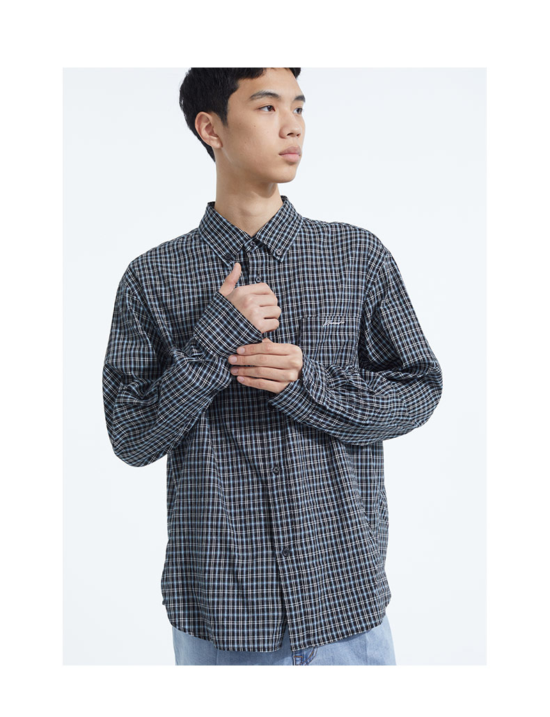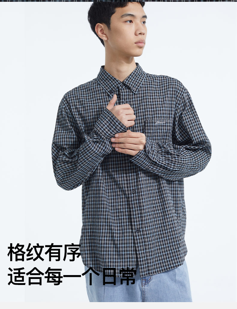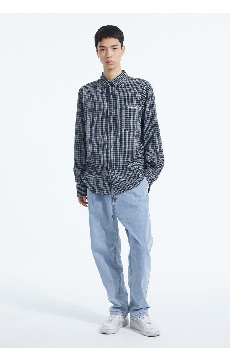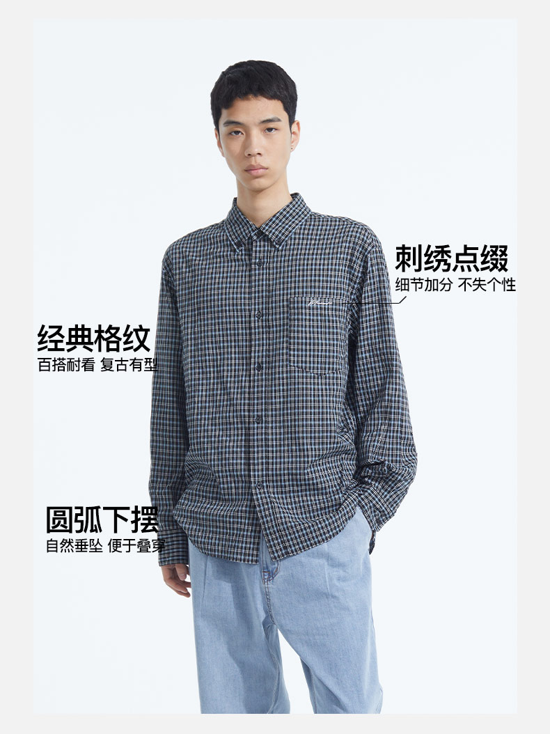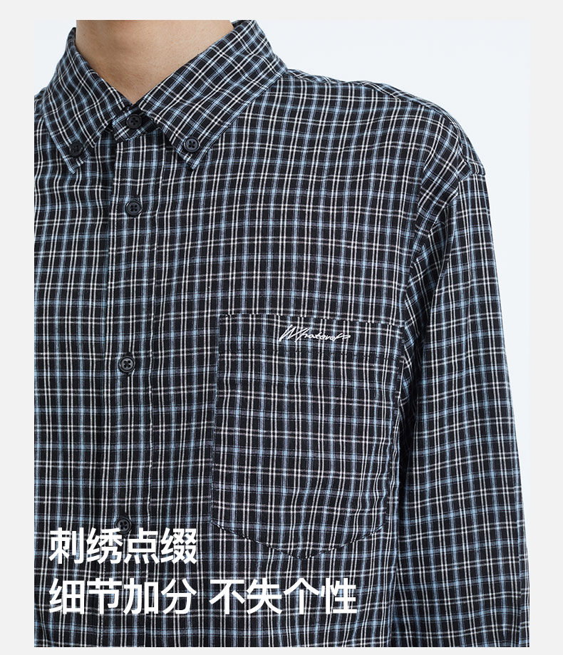 NPC潮牌复古老钱风字母刺绣小格纹翻领衬衫男圆弧下摆NP53SH15