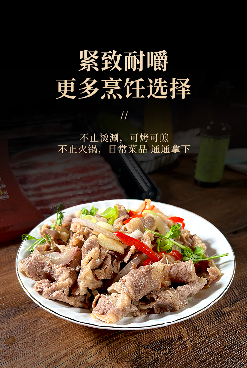 肥牛片选用了四大名牛之一的安格斯牛,经过450天的草饲喂养,严格抵制生长激素,让小公牛自然长大,保留其纯正的口感;再经过300天谷饲育肥,以大麦、小麦、高粱、玉米、燕麦等喂养,进一步提升了肉质的口感。谷饲后的牛肉会形成雪花纹路,精选24个月的小公牛后胸肉直接原切,片片纹理清晰,肥瘦相间,每一口都能体验到浓郁的奶香味!为了进一步提升肉质风味,品牌还采用先进排酸工艺,经过严格低温处理,肉质更加松软细腻,口感更出色,配料表仅有牛肉,吃起来超安心!