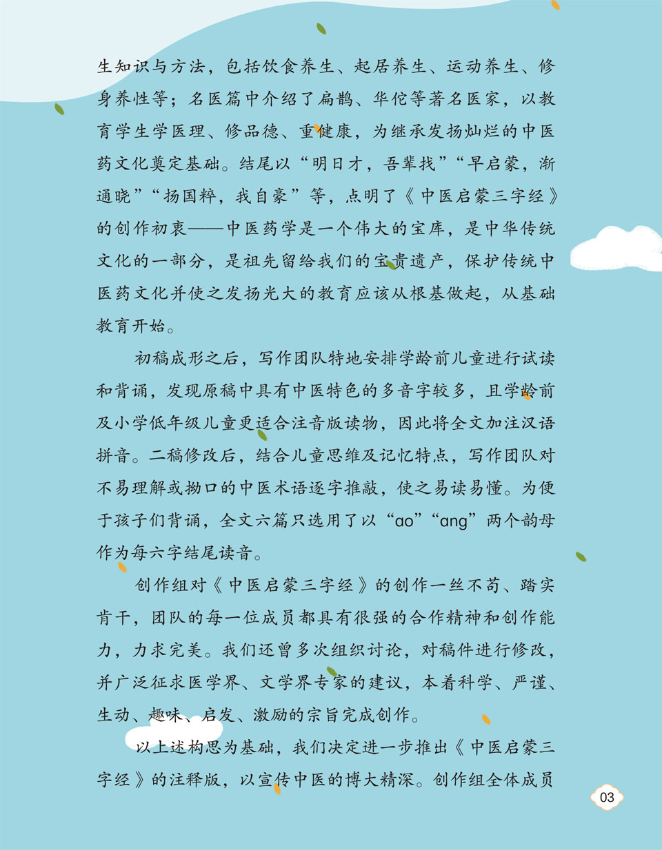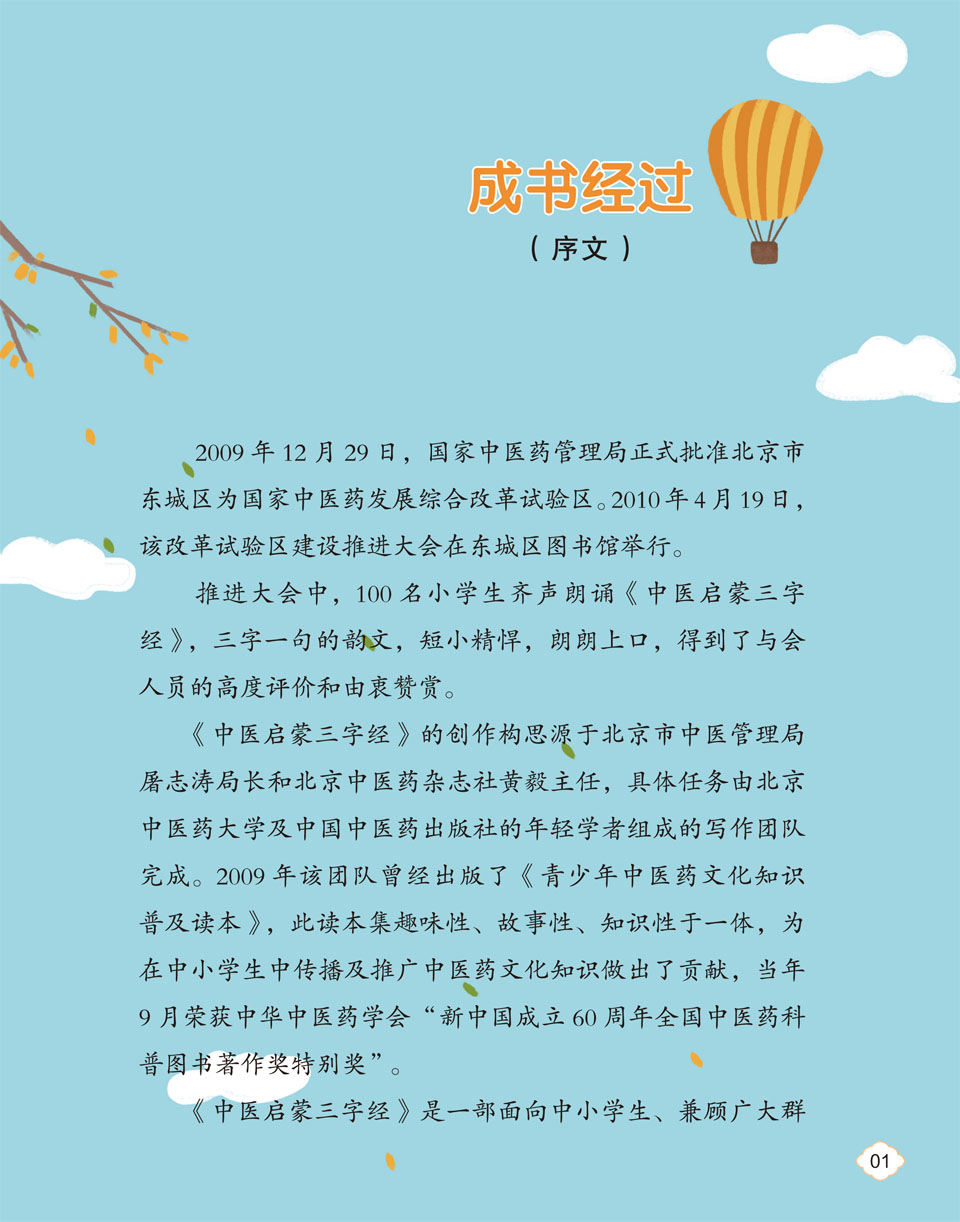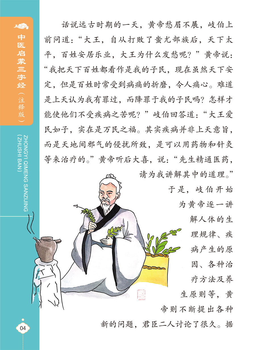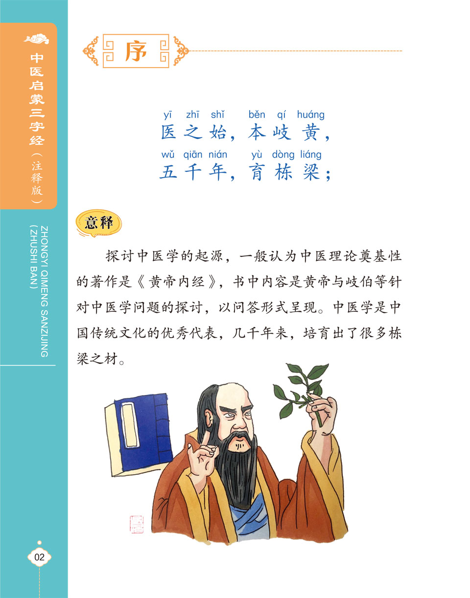 本书面向中小学生,兼顾广大群众,其内容以传统中医药文化为中心,形式选择脍炙人口的三字经形式;原文后附有注释解读。朗朗上口的三字经+简洁有趣的插图=一本妙趣横生的中医启蒙书。全书分为“名医篇”“医理篇”“诊治篇”“四季篇”“起居篇”,旨在在少年儿童的心里种下一颗中医的种子,令其体会中医药的魅力。全书的解读部分注重讲故事,说生活,浅显易懂,富深奥的医理于生动的文字当中,以达到中医药文化科普的目标。