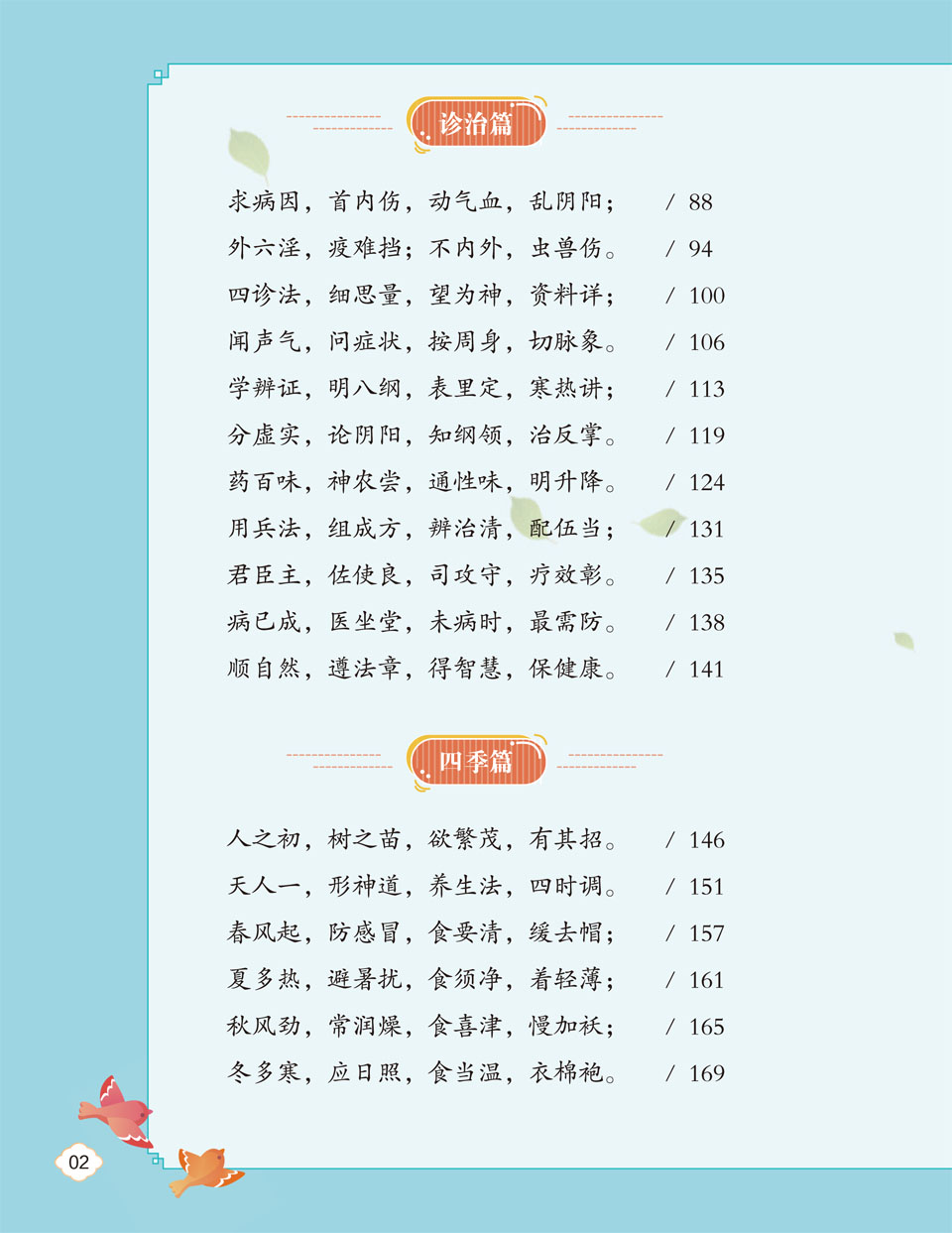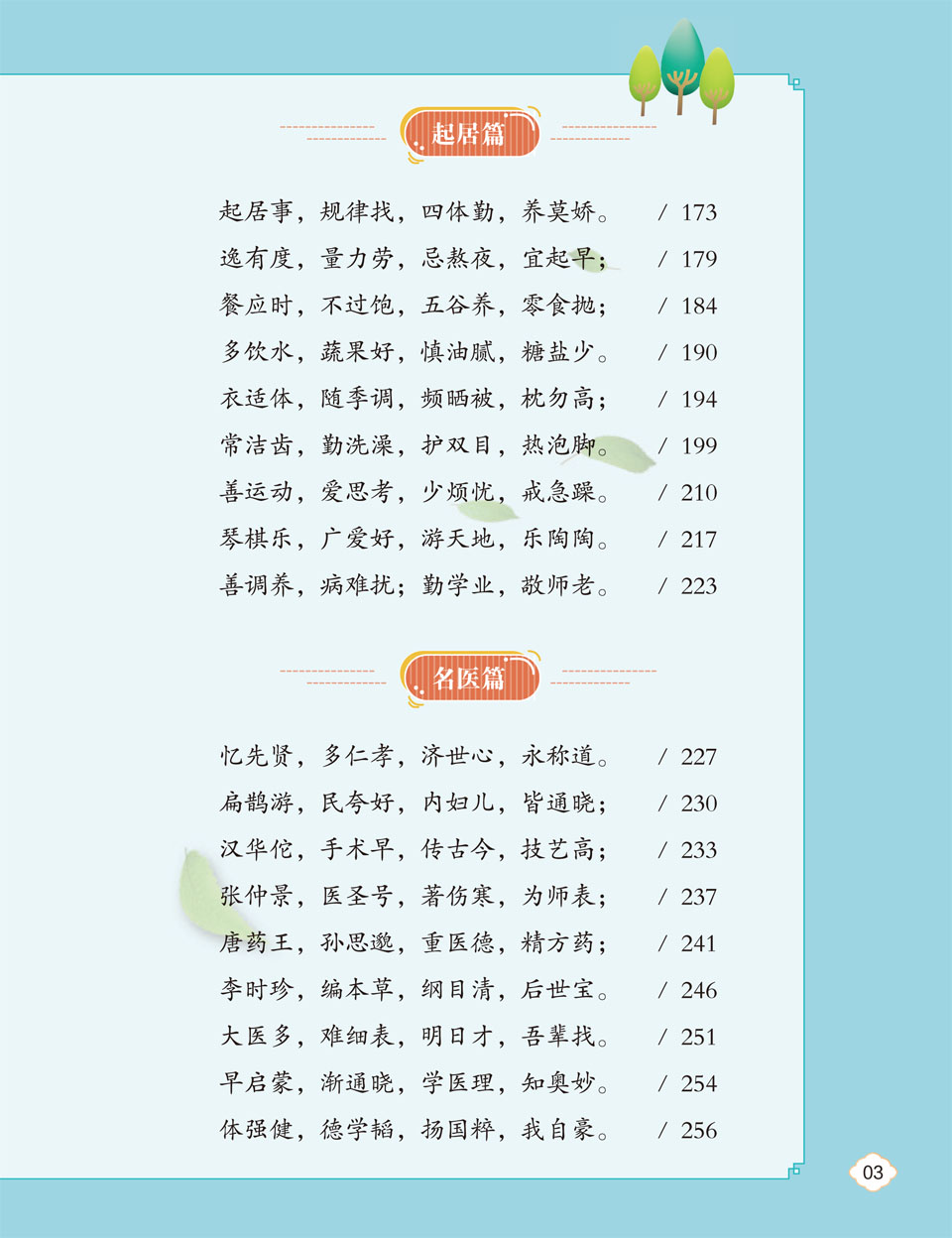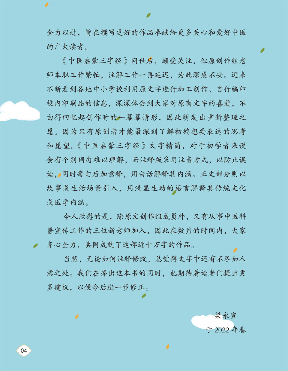 本书面向中小学生,兼顾广大群众,其内容以传统中医药文化为中心,形式选择脍炙人口的三字经形式;原文后附有注释解读。朗朗上口的三字经+简洁有趣的插图=一本妙趣横生的中医启蒙书。全书分为“名医篇”“医理篇”“诊治篇”“四季篇”“起居篇”,旨在在少年儿童的心里种下一颗中医的种子,令其体会中医药的魅力。全书的解读部分注重讲故事,说生活,浅显易懂,富深奥的医理于生动的文字当中,以达到中医药文化科普的目标。