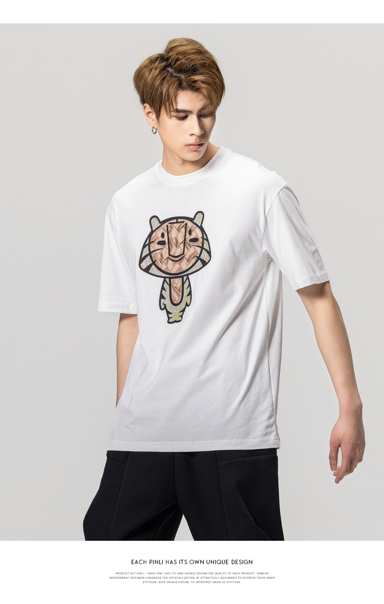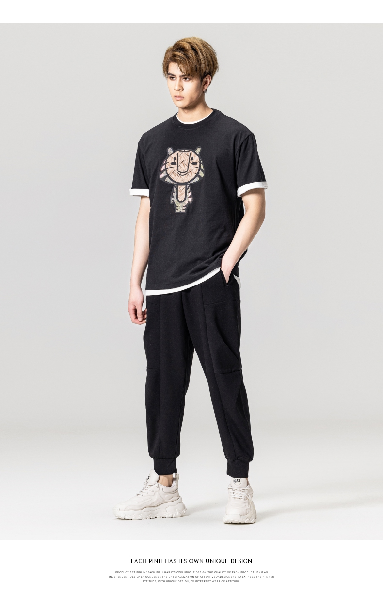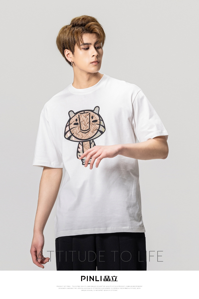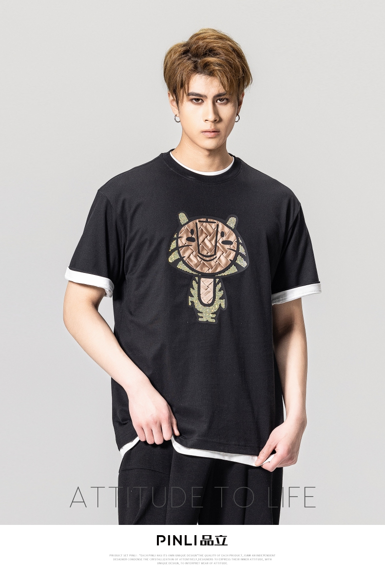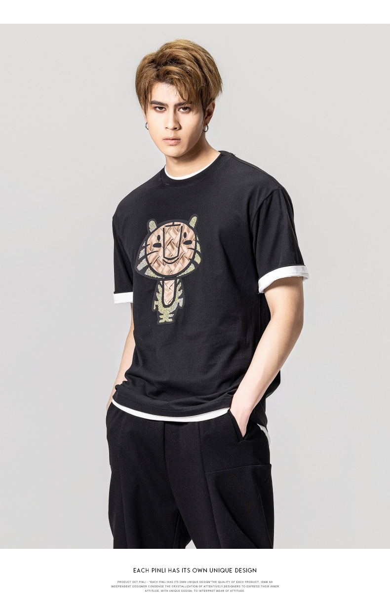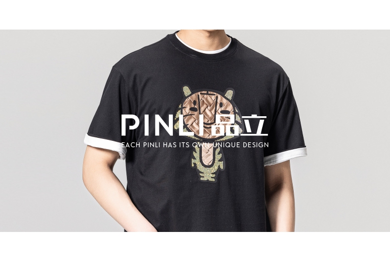 PINLI品立2023夏季新款圆领贴布烫钻短袖T恤男士上衣BG231111057