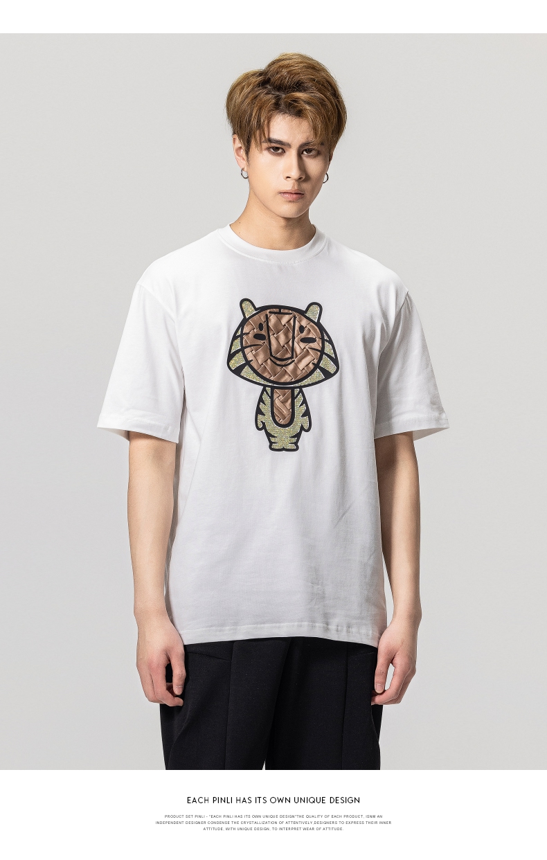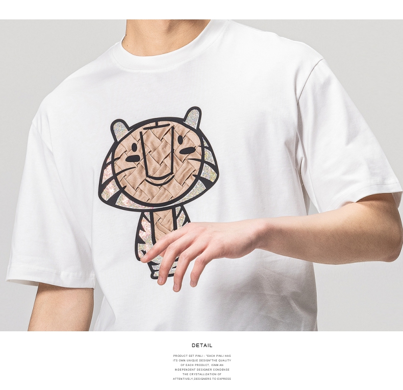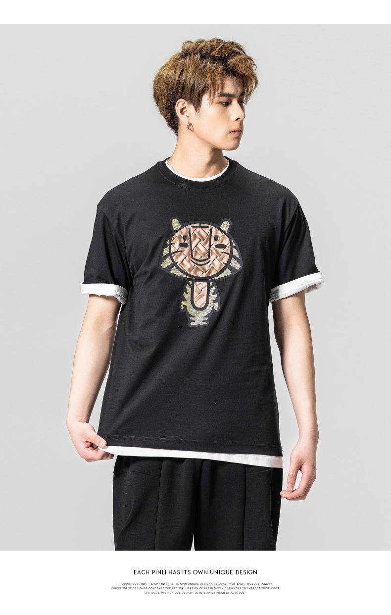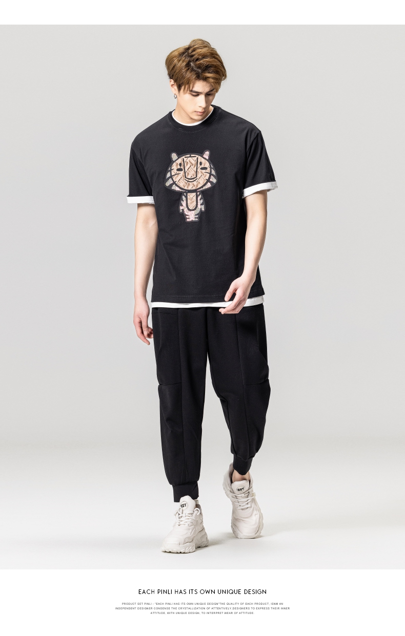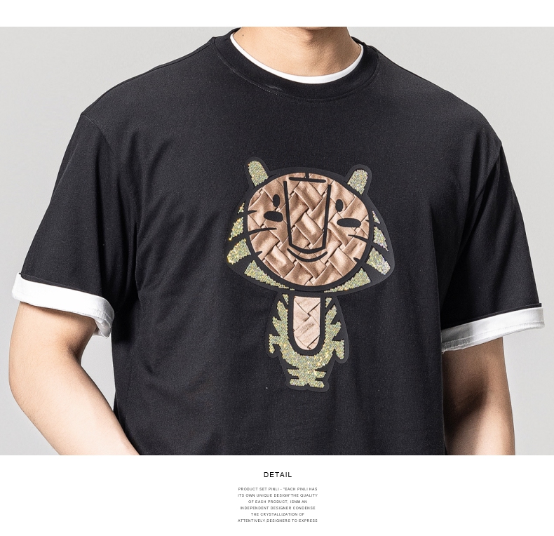 PINLI品立2023夏季新款圆领贴布烫钻短袖T恤男士上衣BG231111057