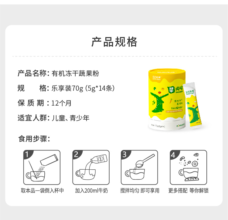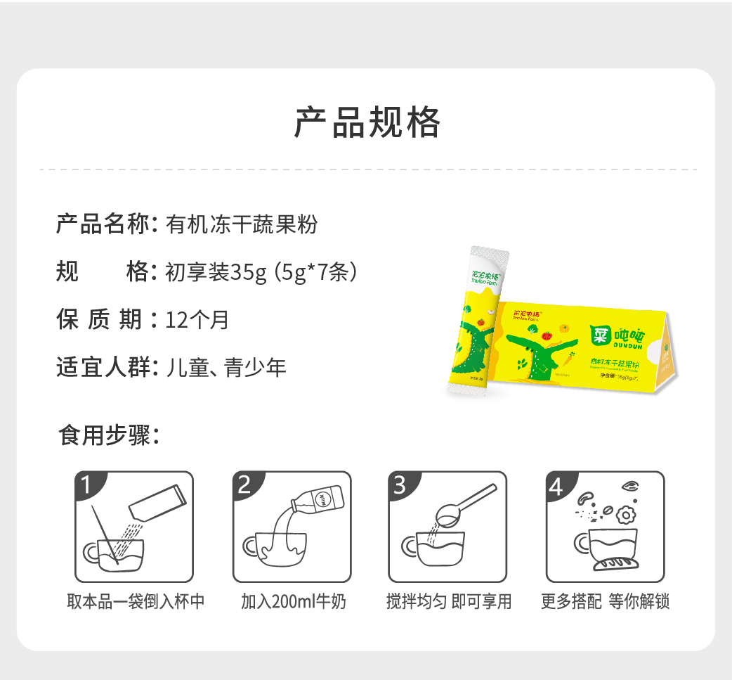 【下单后48小时发货】沱沱农场「菜吨吨」有机冻干蔬果粉 初享装5g*7袋/盒;乐享装5g*14袋/桶