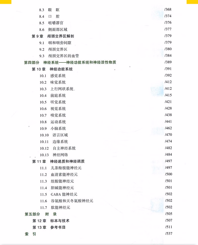 第四部分 神经系统——神经功能系统和神经活性物质 /389第10章 神经功能系统 /39110.1 感觉系统 /39210.2 味觉系统 /41210.3 上行网状系统 /41210.4 前庭系统 /41510.5 听觉系统 /42110.6 视觉系统 /42810.7 嗅觉系统 /43810.8 运动系统 /44110.9 小脑系统 /46210.10 语言区域 /47010.11 边缘系统 /47410.12 自主神经系统 /48210.13 神经网络 /484第11章 神经递质和神经调质 /49711.1 儿茶酚胺能神经元 /49711.2 血清素能神经元 /50011.3 组胺能神经元 /50111.4 胆碱能神经元 /50111.5 GABA能神经元 /50211.6 谷氨酸和天冬氨酸神经元 /50211.7 肽能神经元 /502