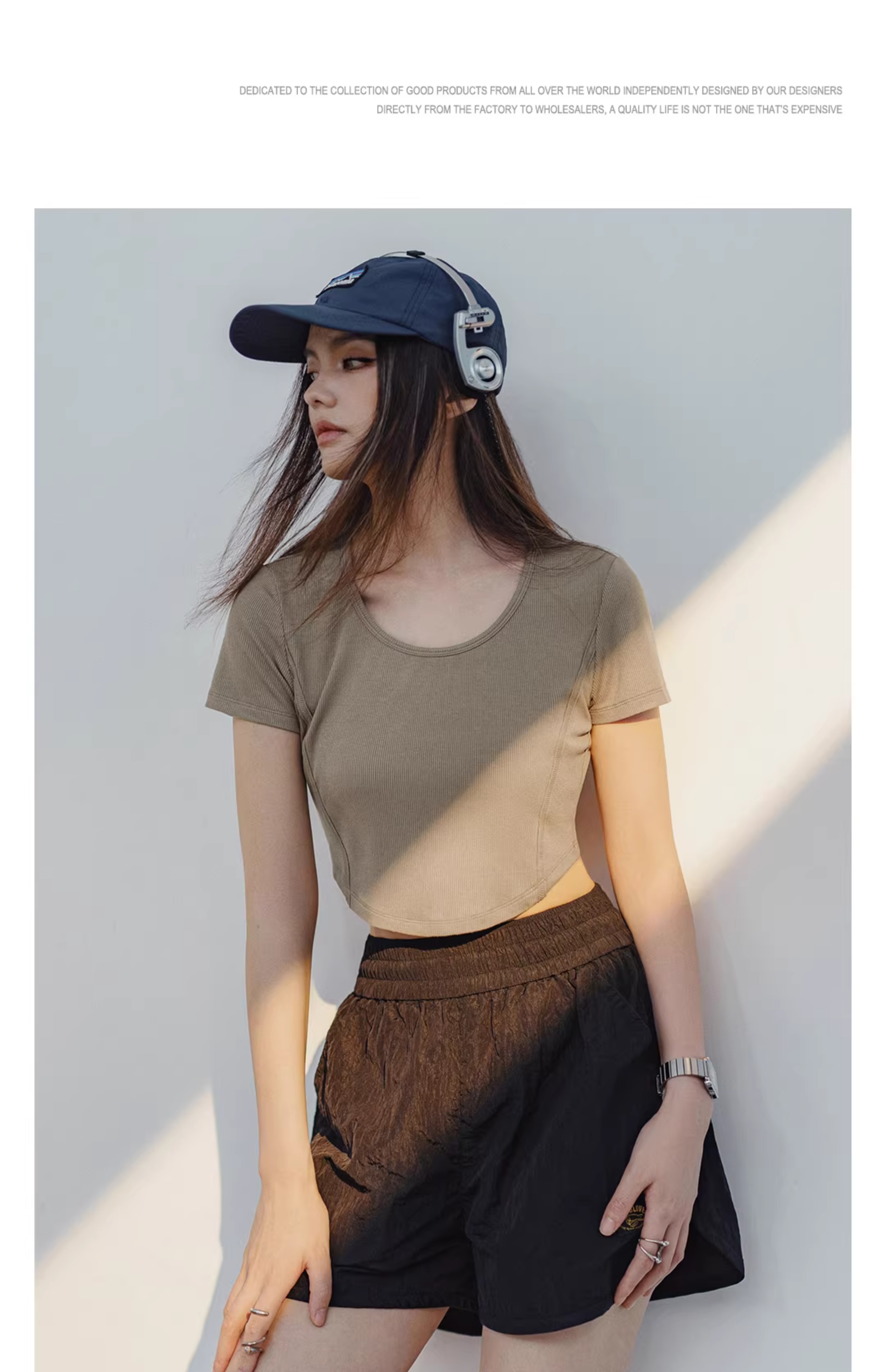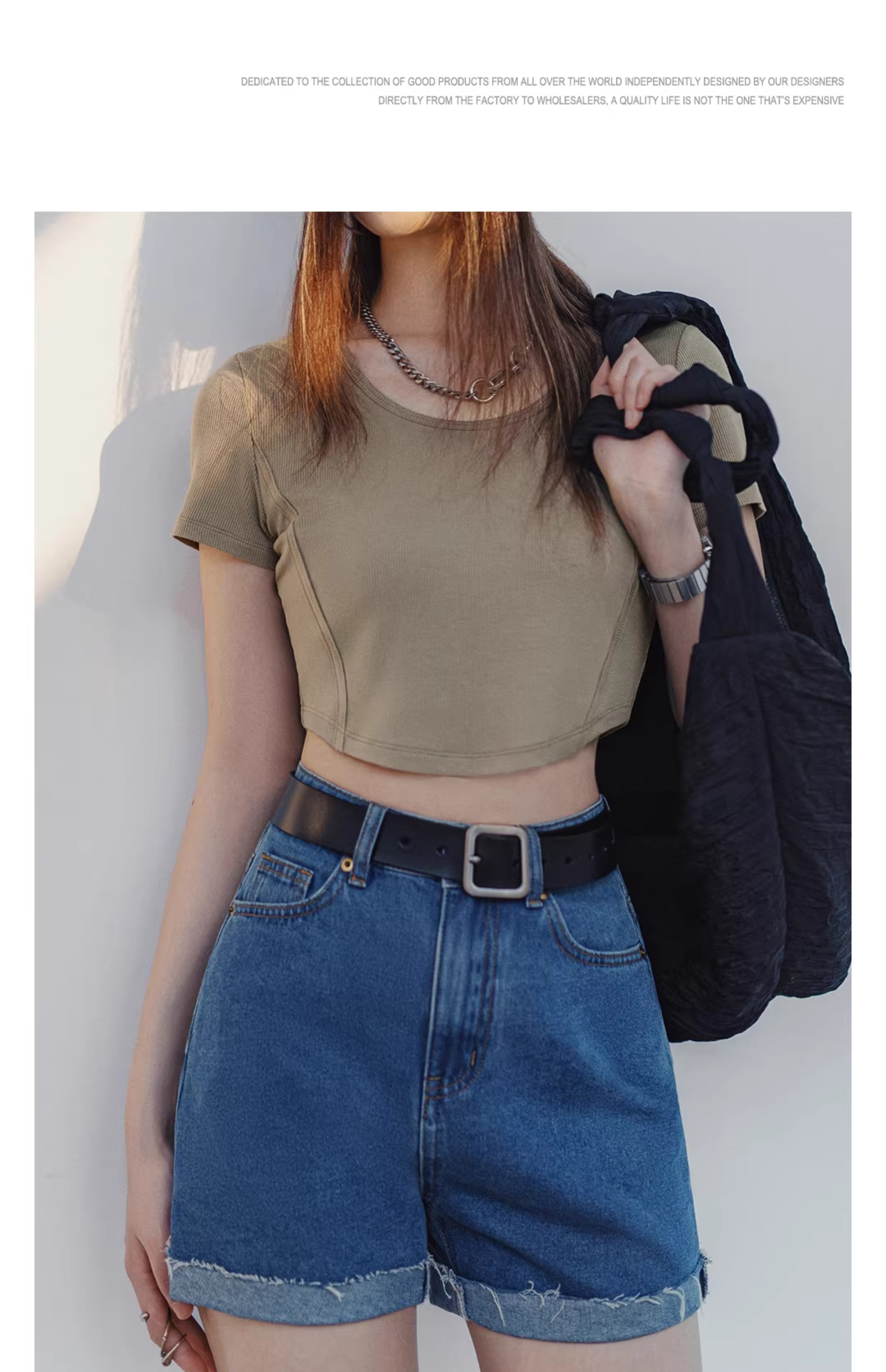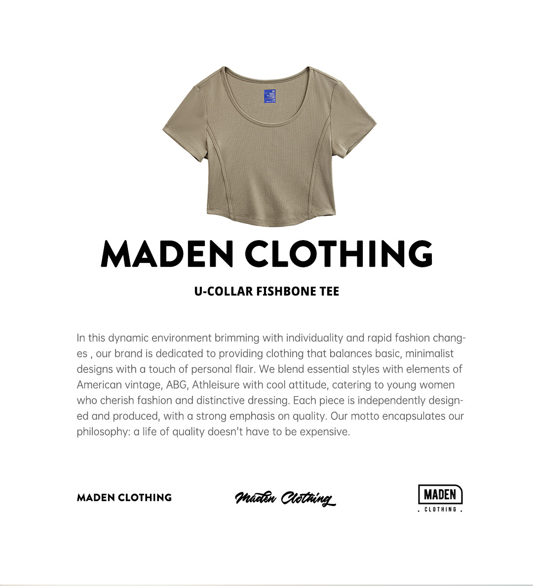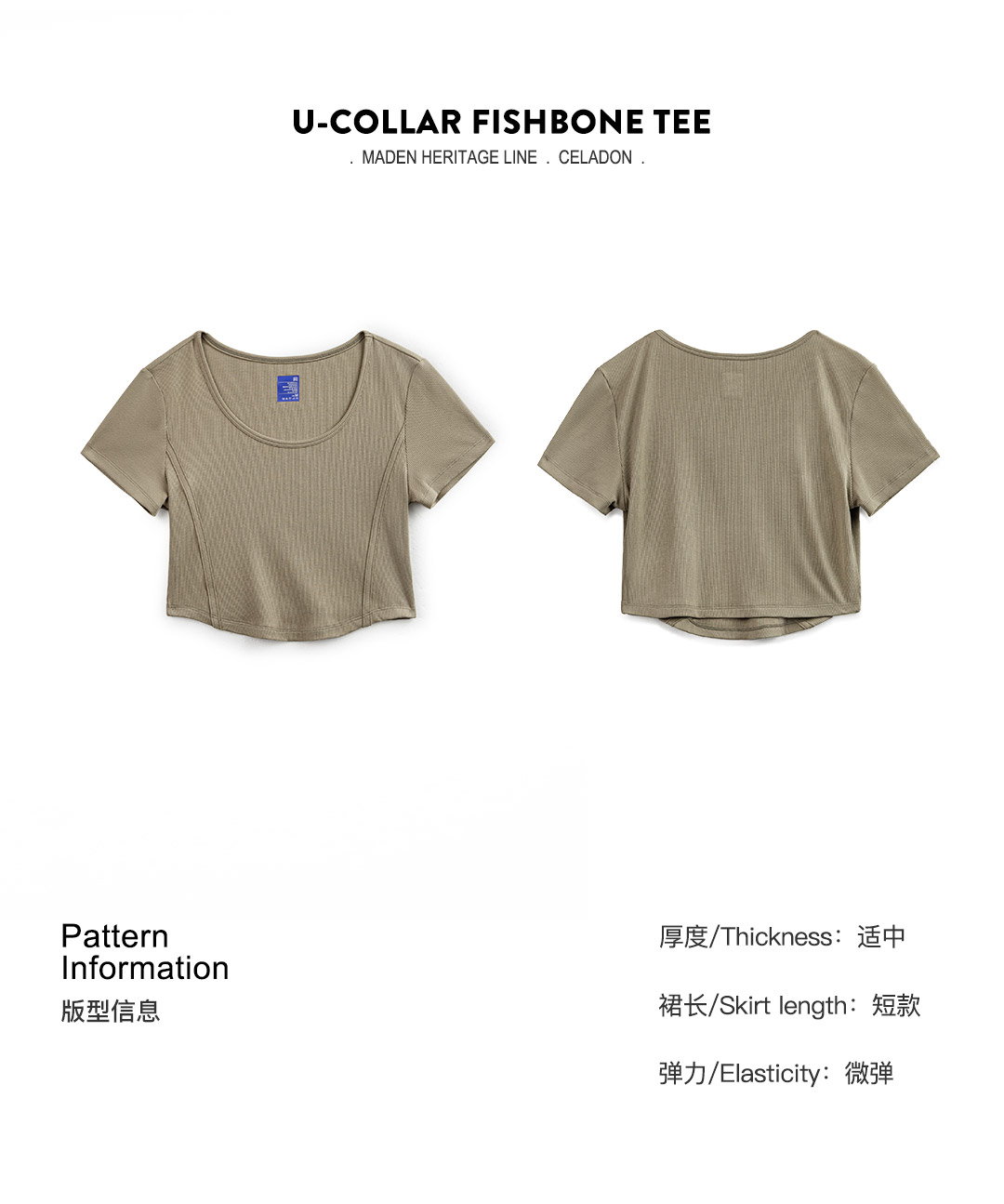 马登美式休闲正肩T恤U领鱼骨短袖修身百搭辣妹露腰短款上衣夏季女