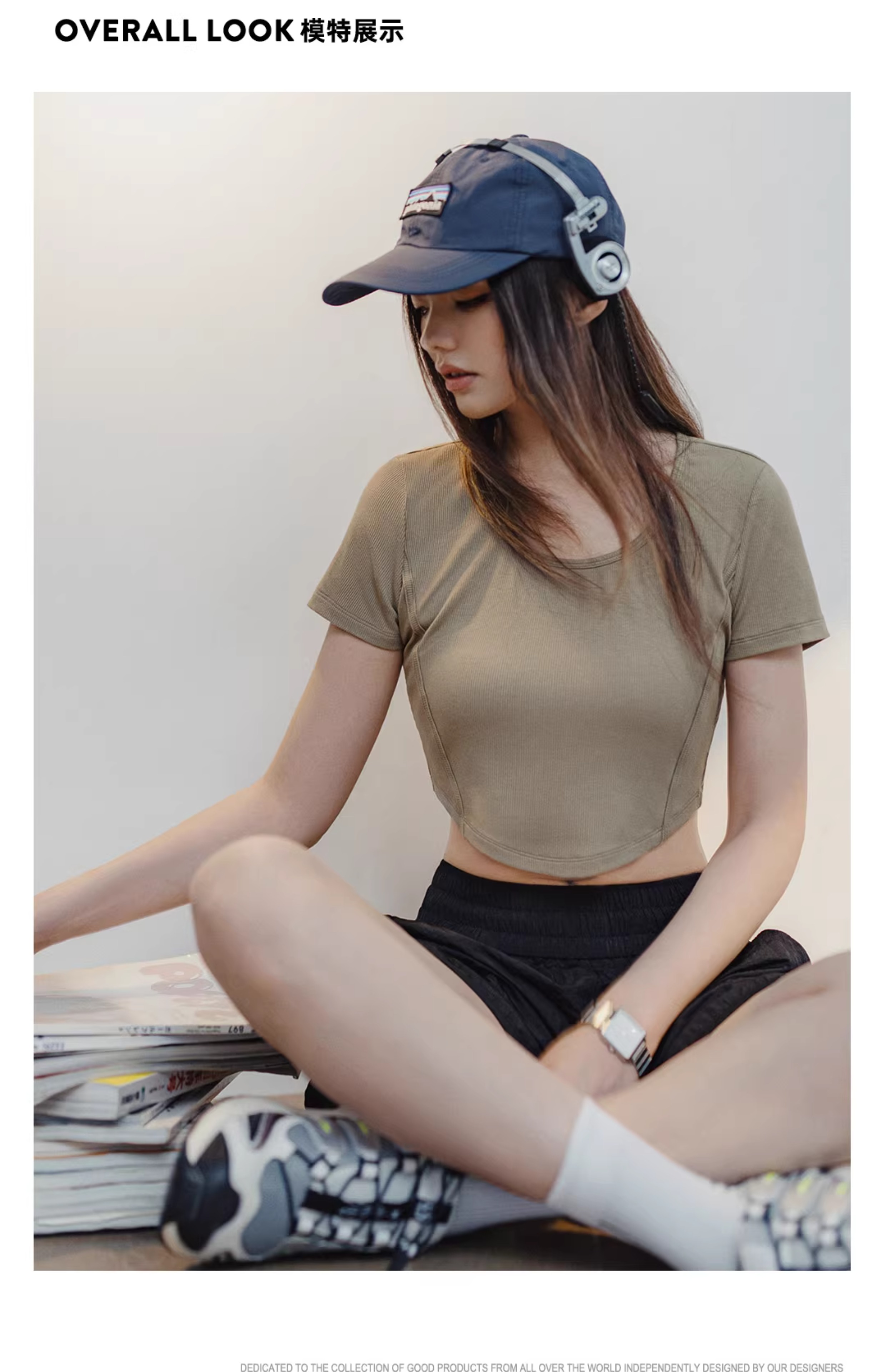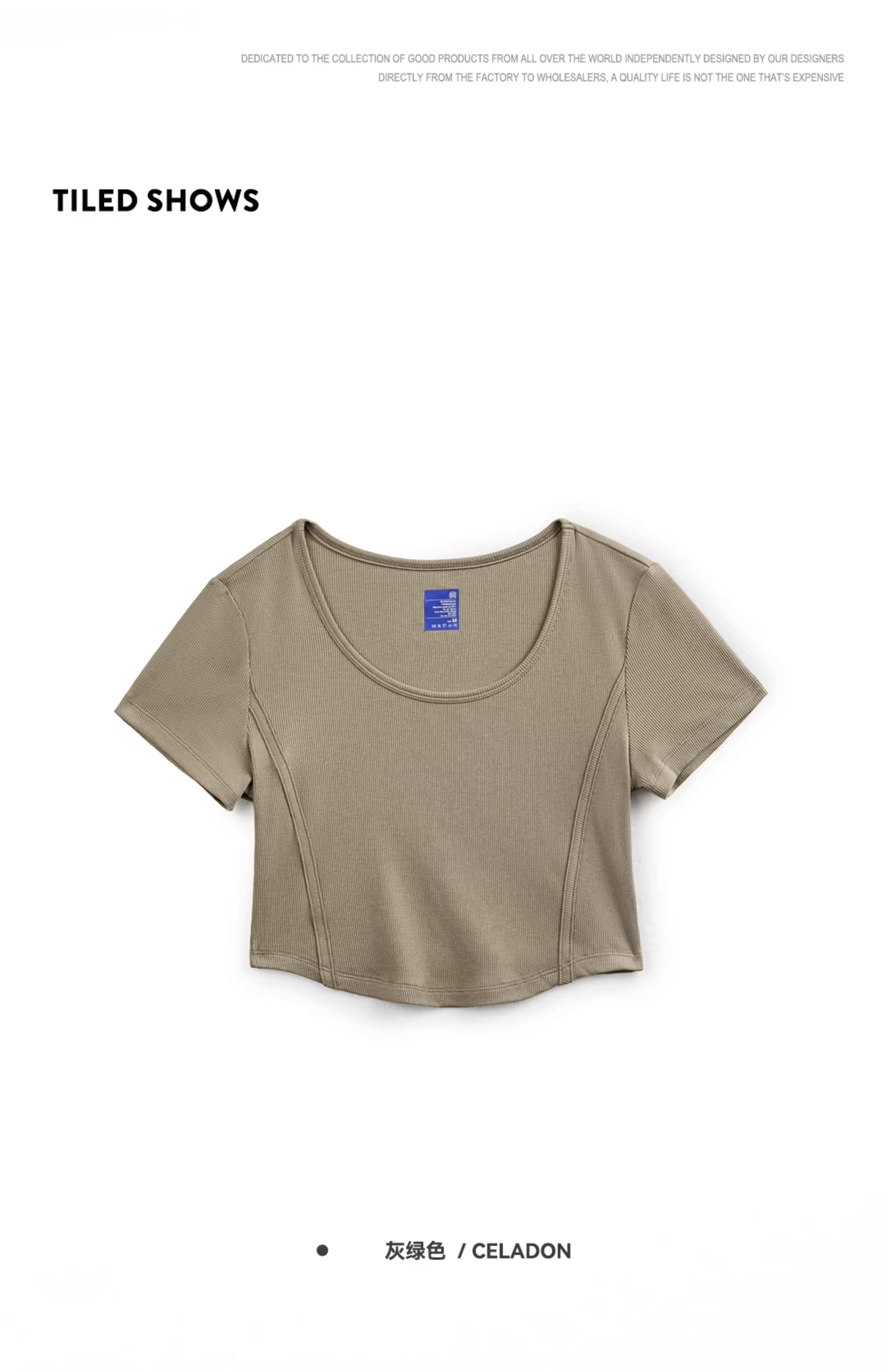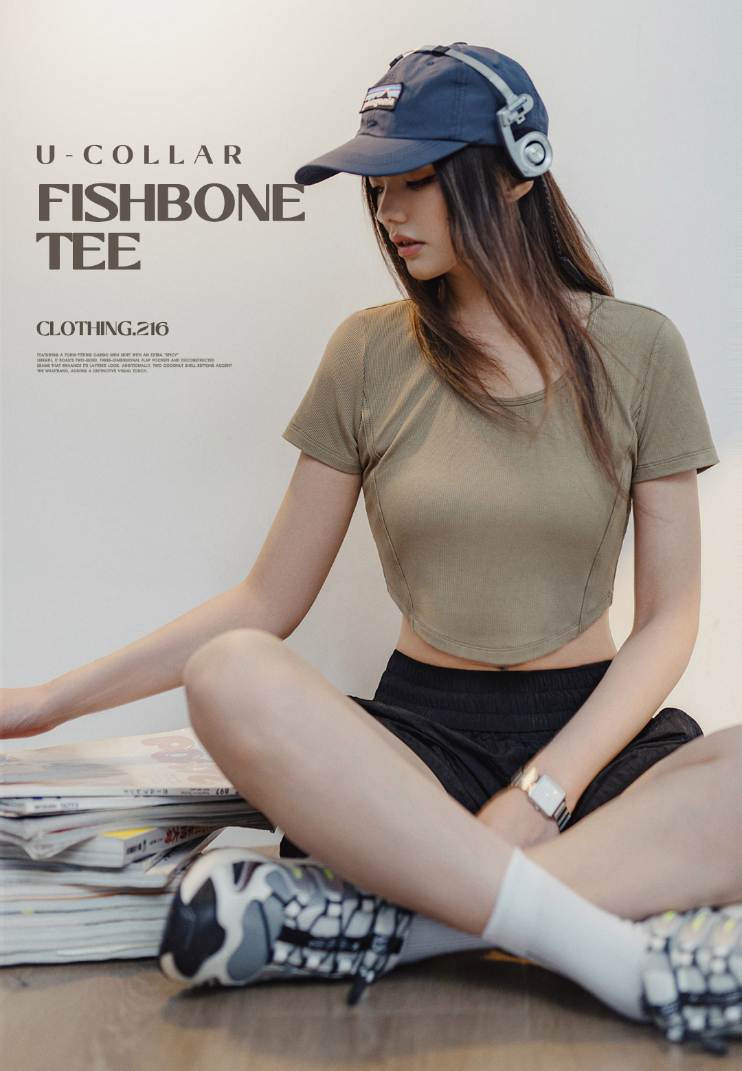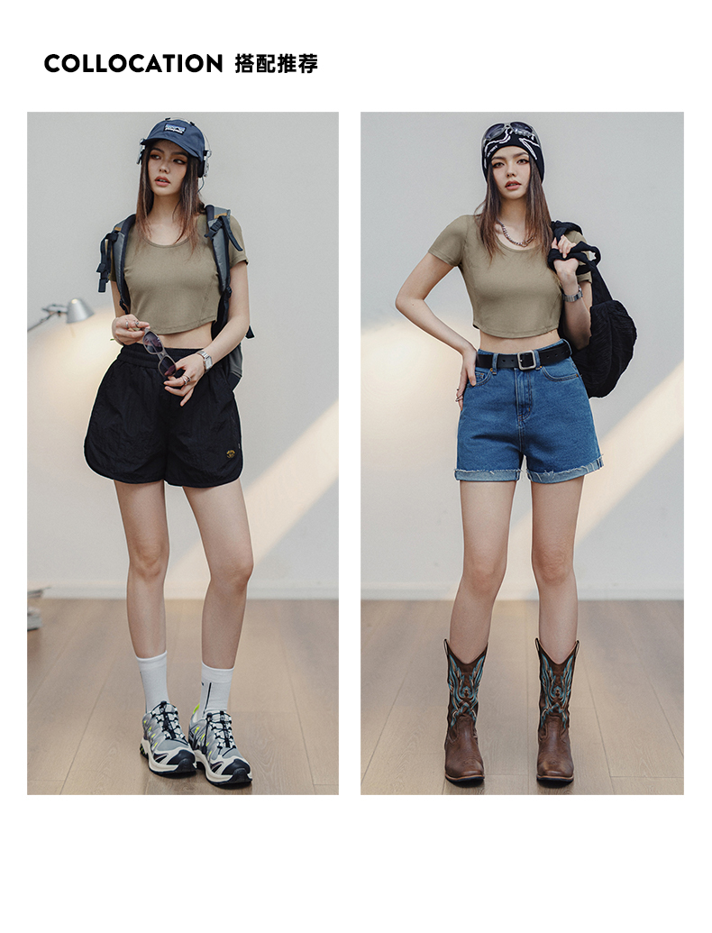 马登美式休闲正肩T恤U领鱼骨短袖修身百搭辣妹露腰短款上衣夏季女