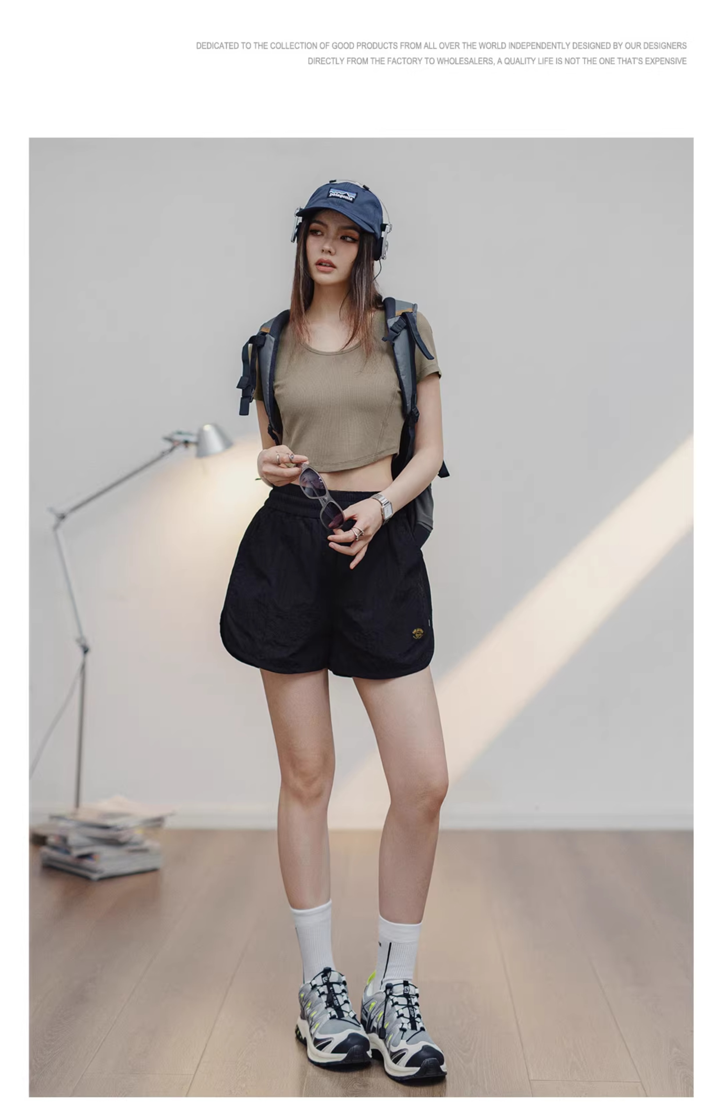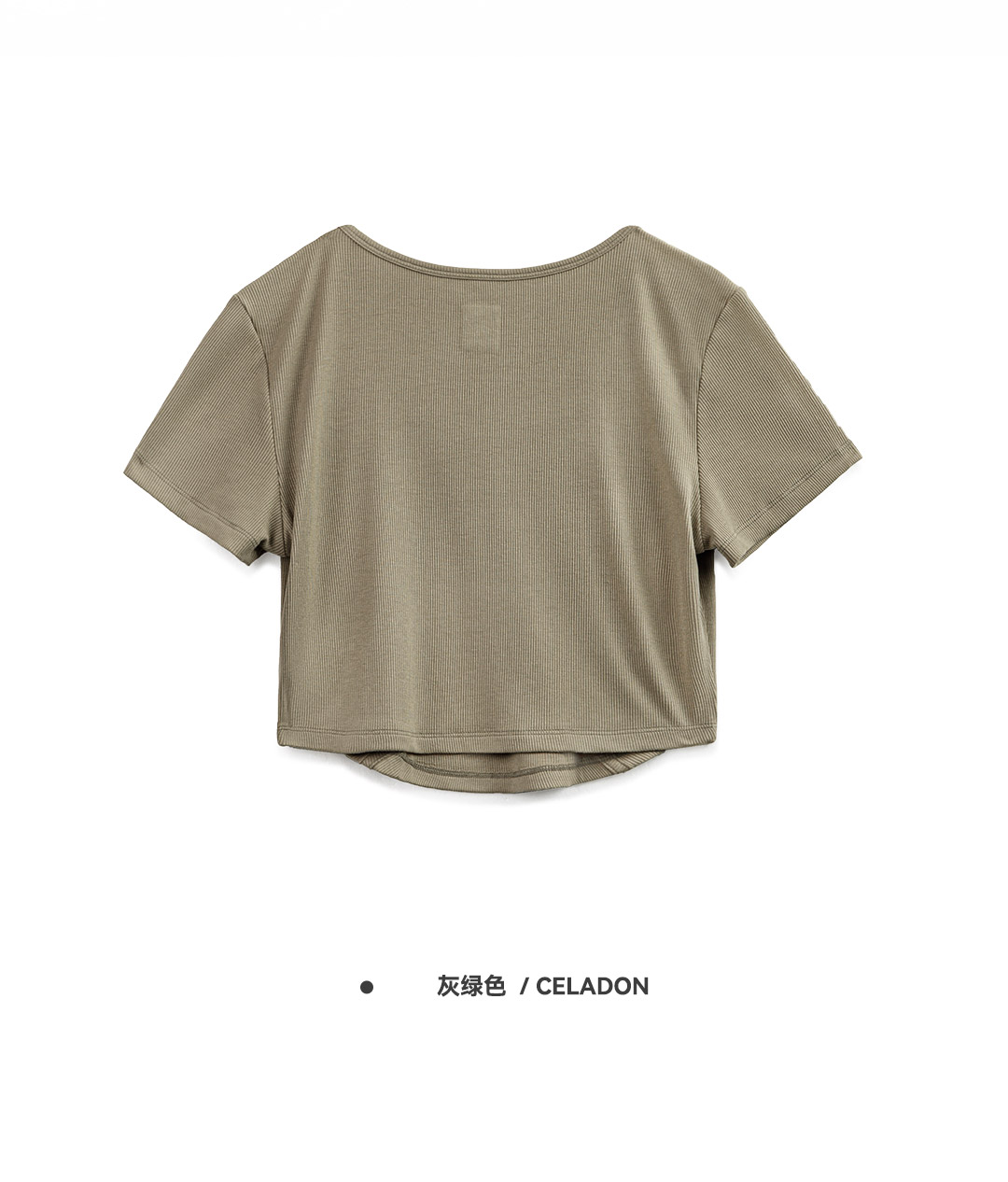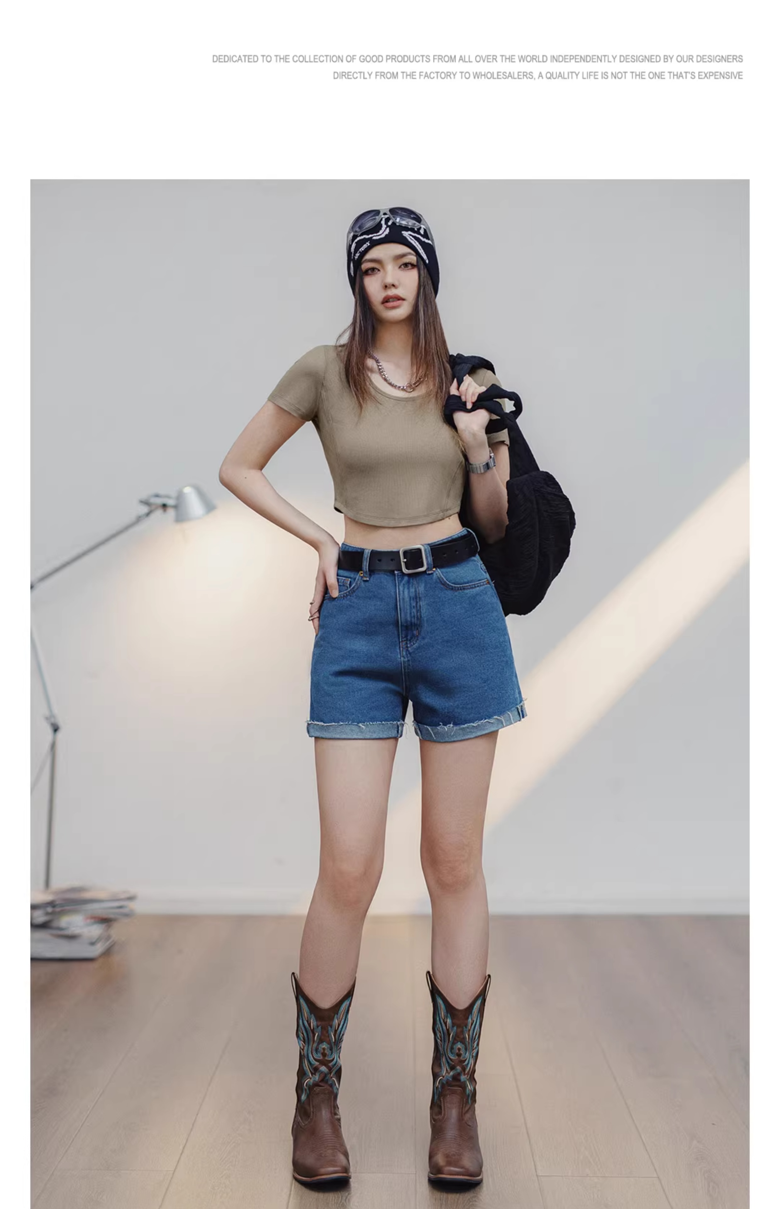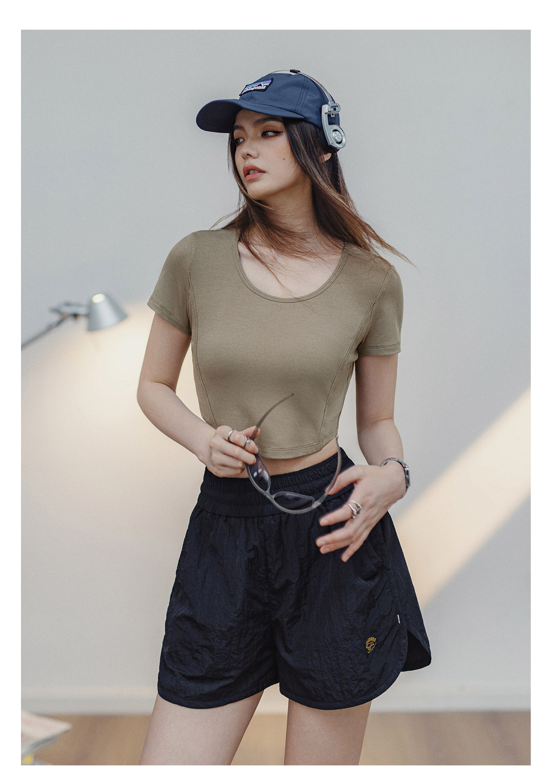 马登美式休闲正肩T恤U领鱼骨短袖修身百搭辣妹露腰短款上衣夏季女