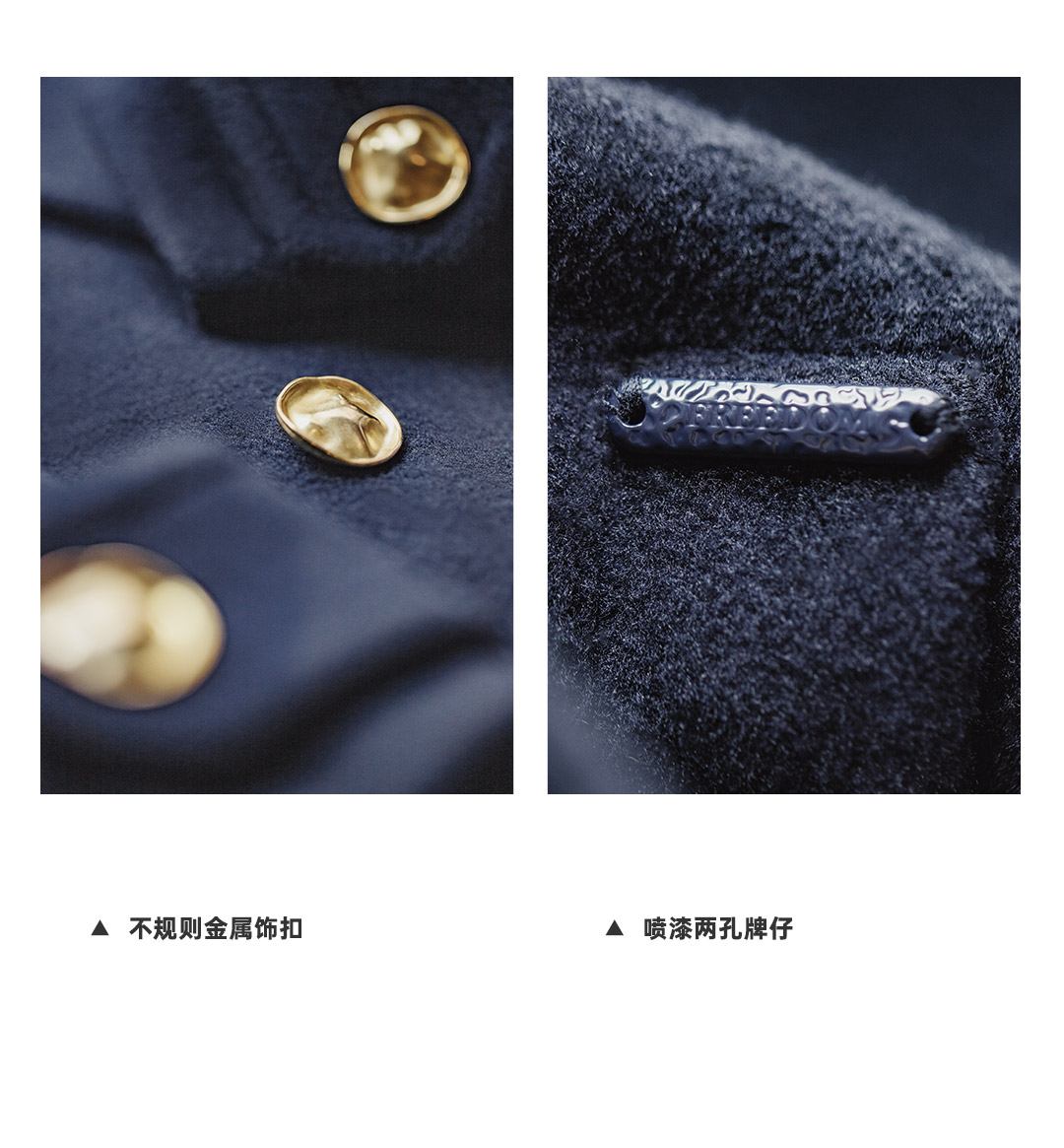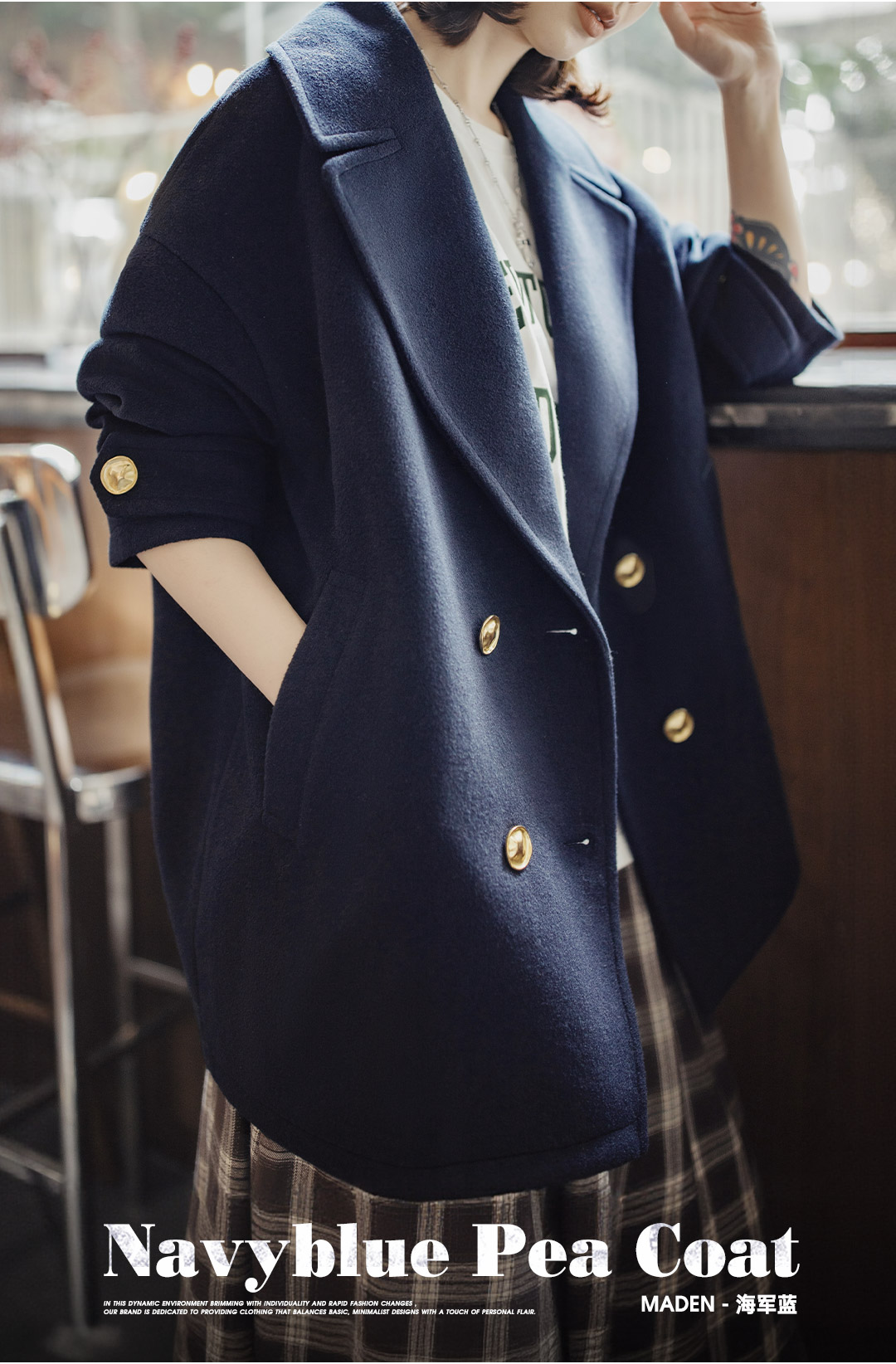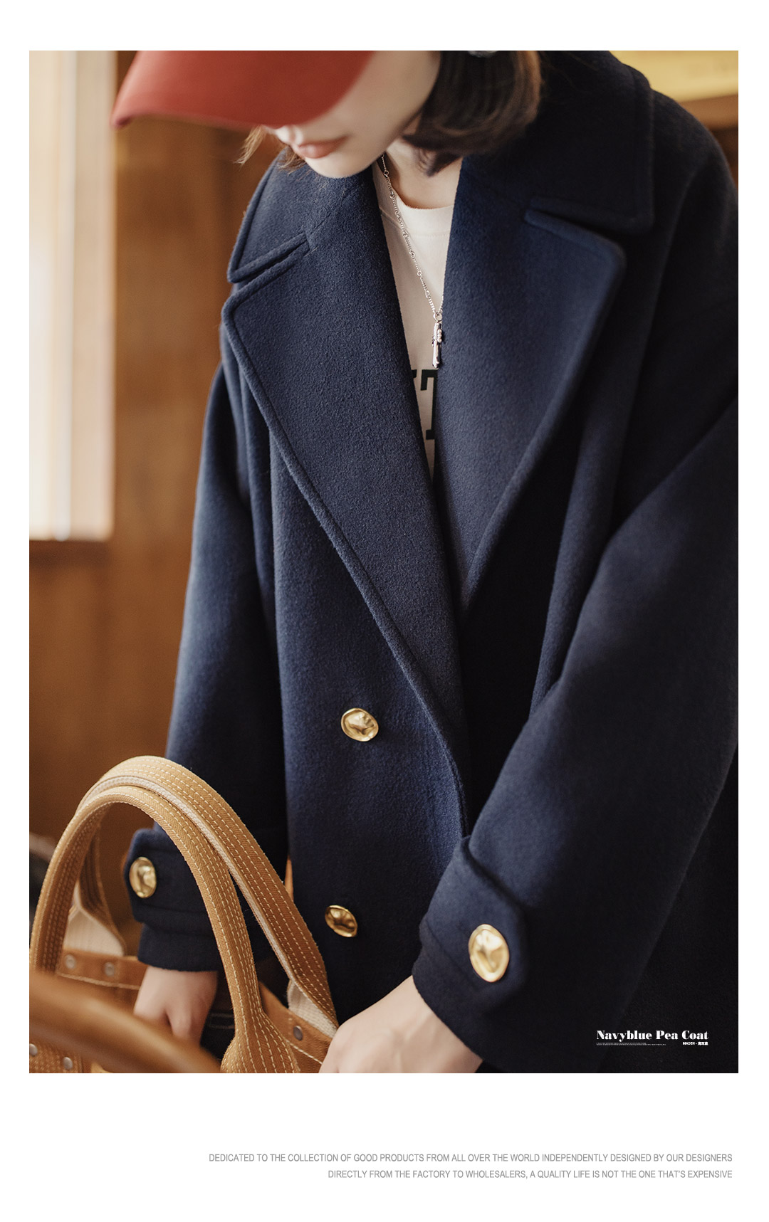 马登蓝色复古中长款绒面外套加厚保暖重磅双排扣毛呢子大衣女士秋