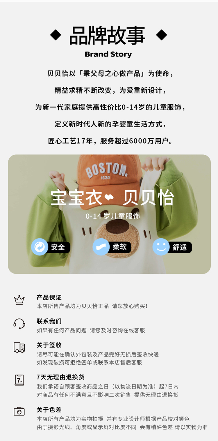 - 贝贝怡专注0-6岁婴幼儿服饰,坚持安全、柔软、舒适的产品理念,为千万中国家庭提供超高品质、安全可靠的婴幼儿服饰产品,妈妈放心,宝宝开心!