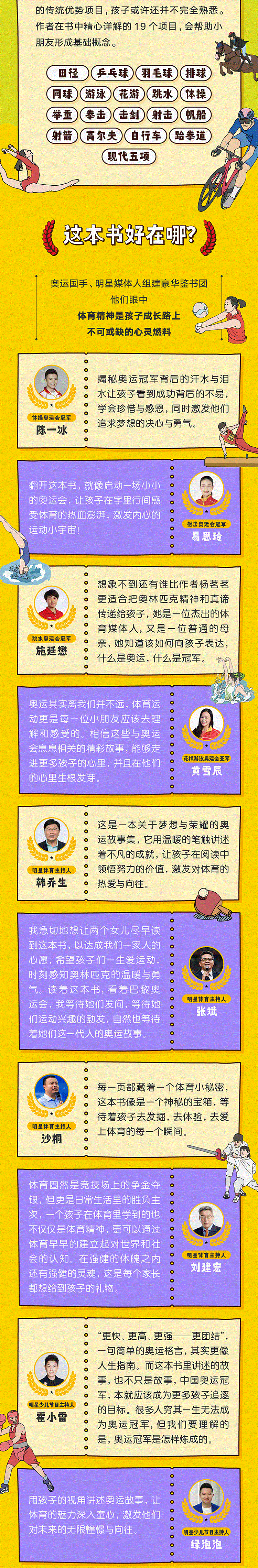 陈一冰、施廷懋、易思玲、黄雪辰、韩乔生、张斌、沙桐、刘建宏、霍小雷、绿泡泡为本书认真撰写推荐语的鉴书团阵容格外华丽,其中既有频频站上奥运领奖台的明星国手,又有在体育传媒领域名声赫赫的大咖,以及小朋友们格外熟悉的少儿节目主持人!他们眼中,体育精神是孩子成长路上不可或缺的心灵燃料,也由衷希望这本书能帮助更多孩子拥抱梦想、决心与勇气。