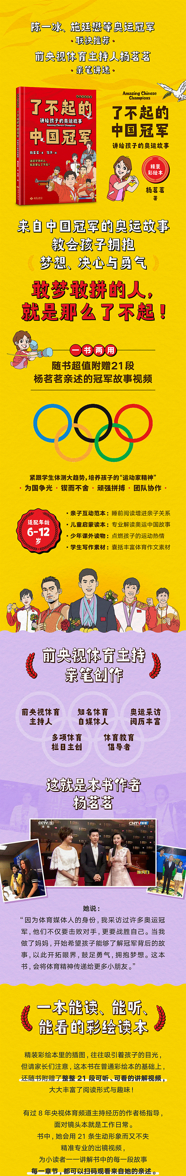 本书是由前央视明星主持人杨茗茗执笔创作的奥运科普类童书,旨在通过中国奥运冠军的故事,将奥运精神与体育力量传递给更多孩子,适配年龄段在6至12岁。