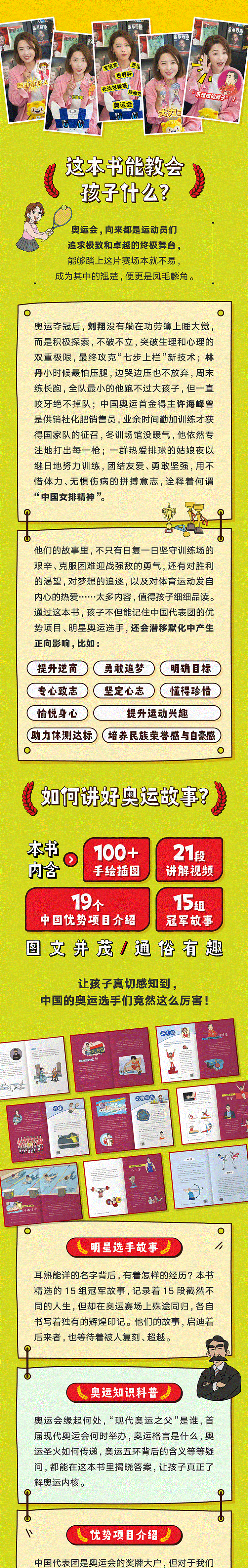 全书聚焦中国代表团奥运会优势项目,划分19个章节,简要对各项目概况进行阐述,用简短的篇幅覆盖广泛内容,干货满满,是帮助少儿群体了解奥运会的百科全书。