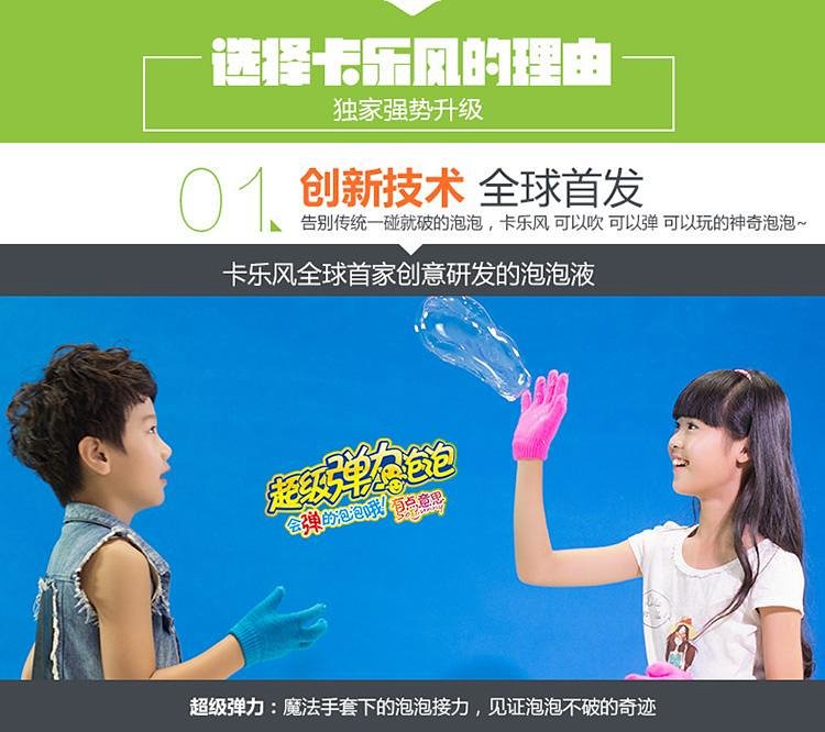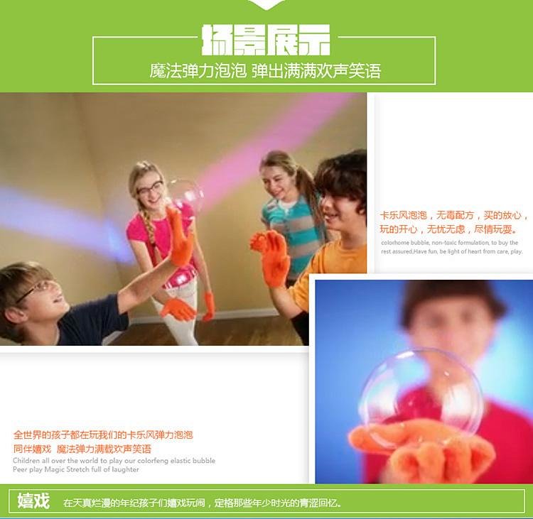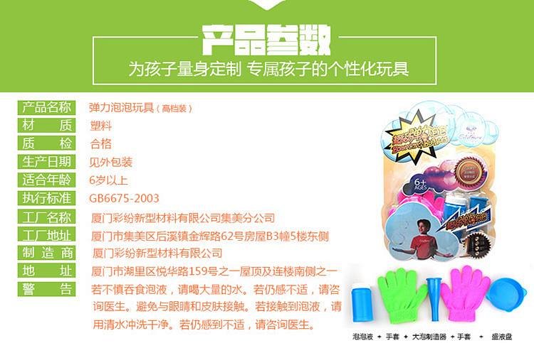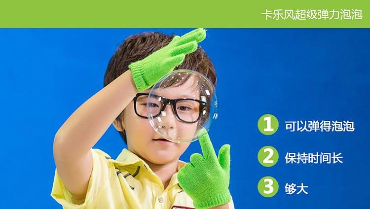 通过欧盟玩具安全标准 、美国玩具安全标准、美国药典防腐抗菌认证、欧盟无毒认证,本套装含90ML弹力泡泡水一瓶,配小托盘、两只手套及吹泡泡工具