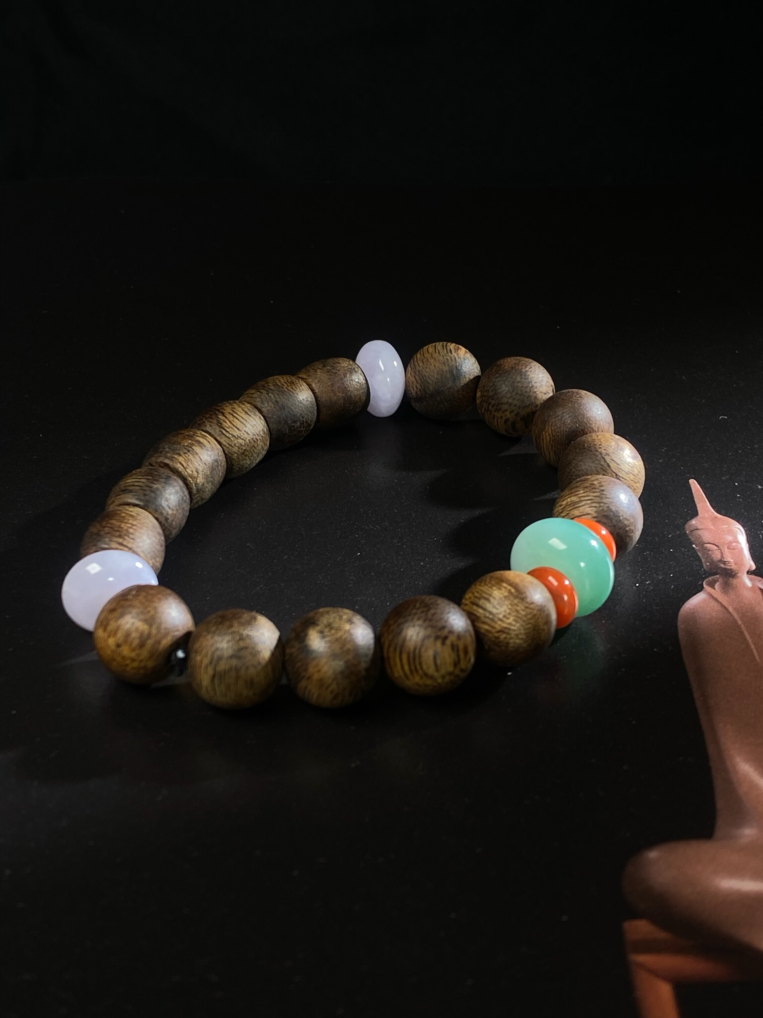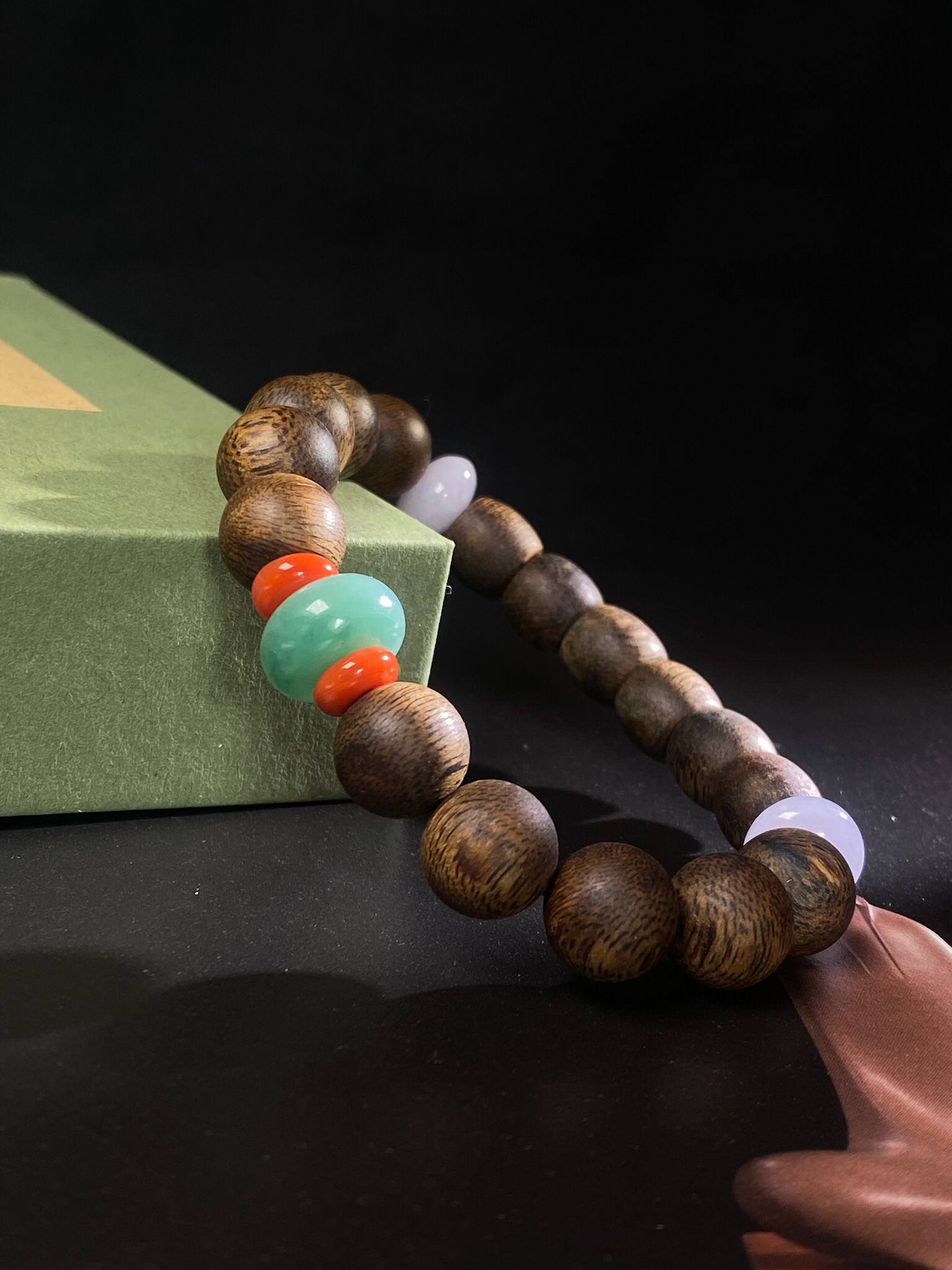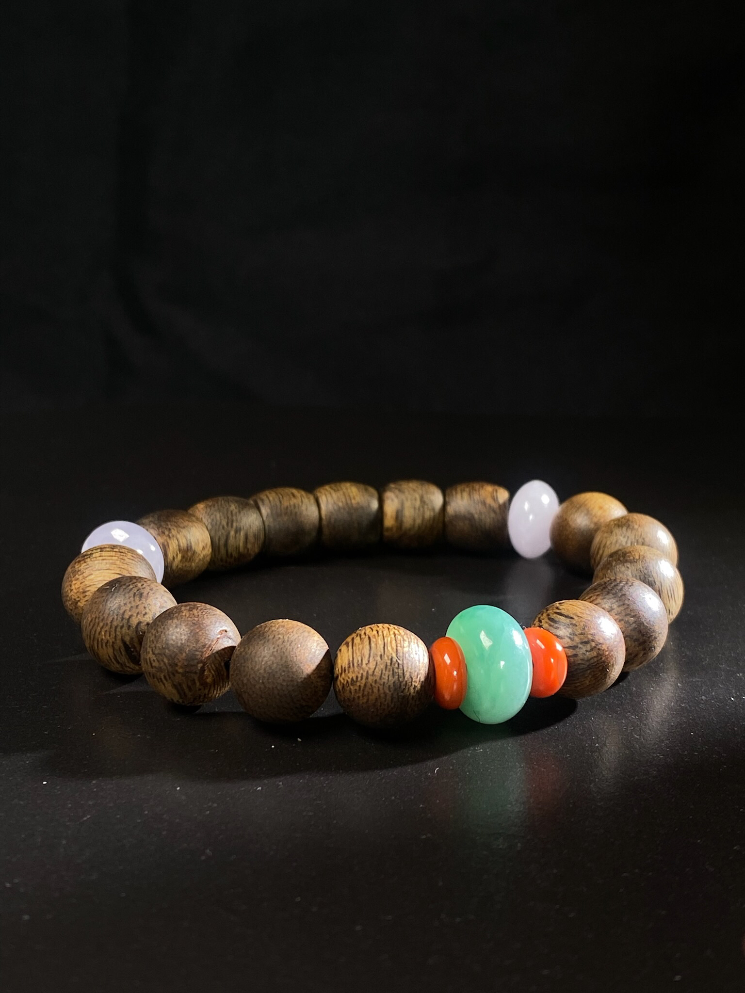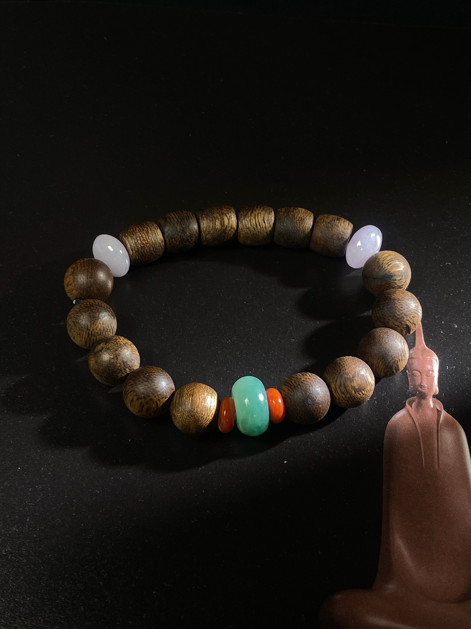 沉香DIY圆珠翡翠算盘珠桶珠手串,天然沉香圆珠+桶珠,约9mm,3颗翡翠算盘珠,整体搭配多样时尚