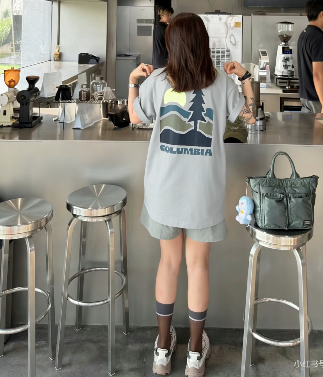 • 前后印花:正面小logo低调简约,背面大幅山野森林🌳印花,氛围感拉满,上身超有辨识度,拍照巨出片。