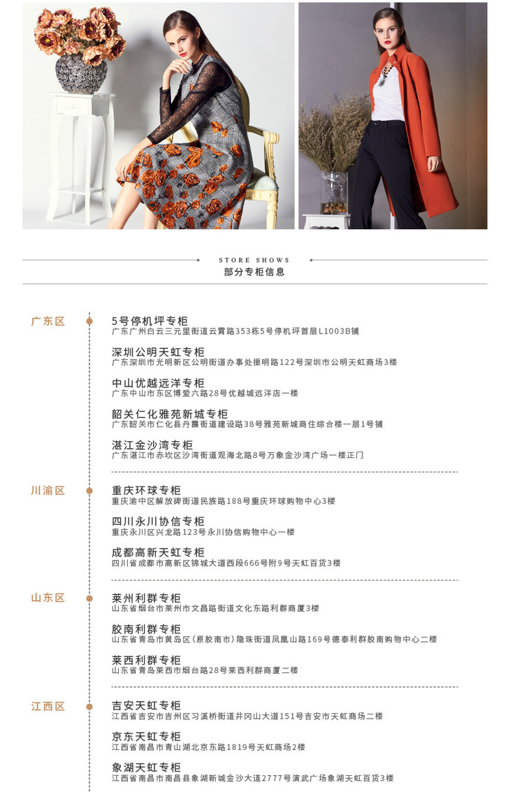 品牌风格:源自千年文学和万年艺术的时装,让你的气质内涵一枝独秀,精彩的品质,华丽的风格,炫耀的视觉,让你的衣品从此与众不同,标记你深厚的文化内涵与艺术气息。