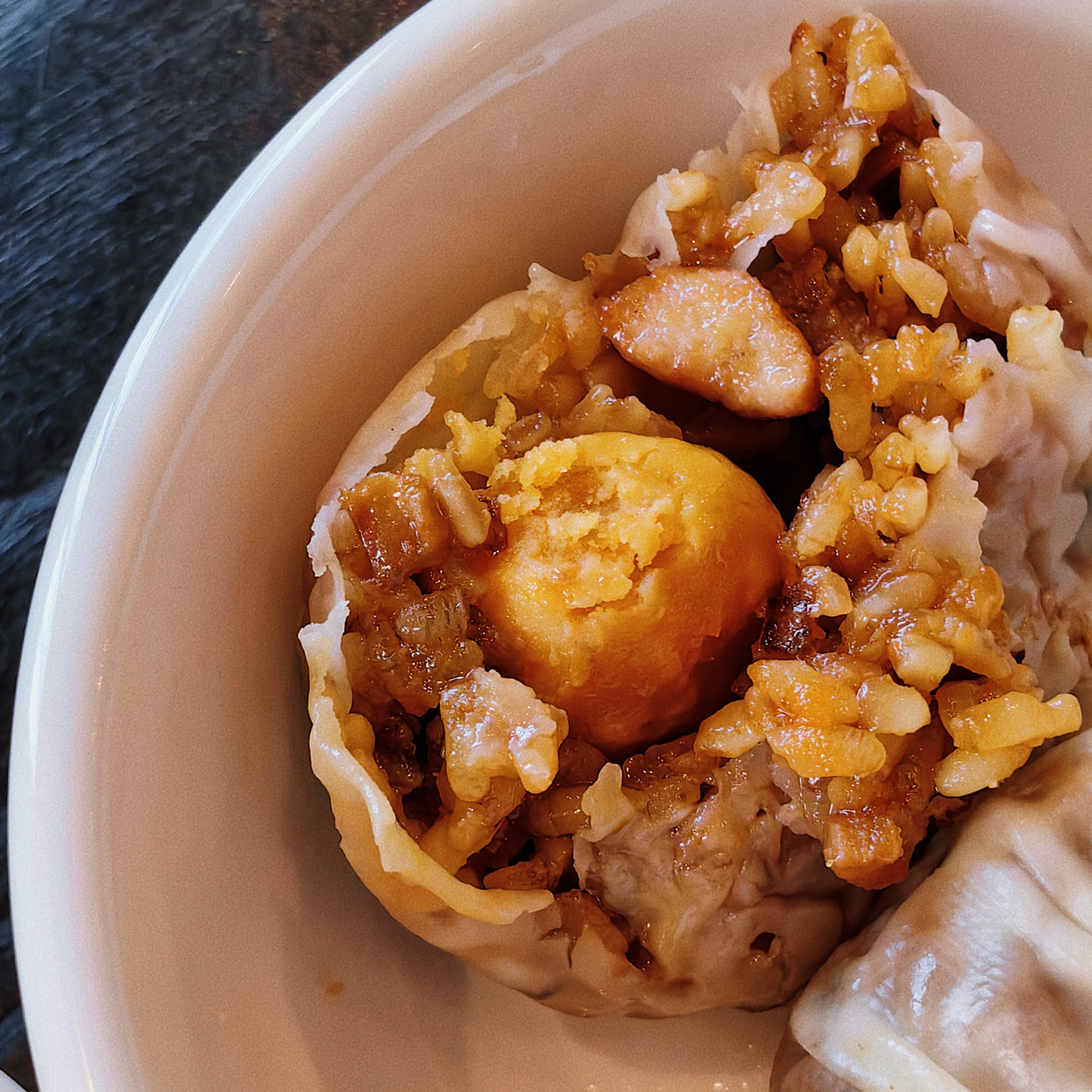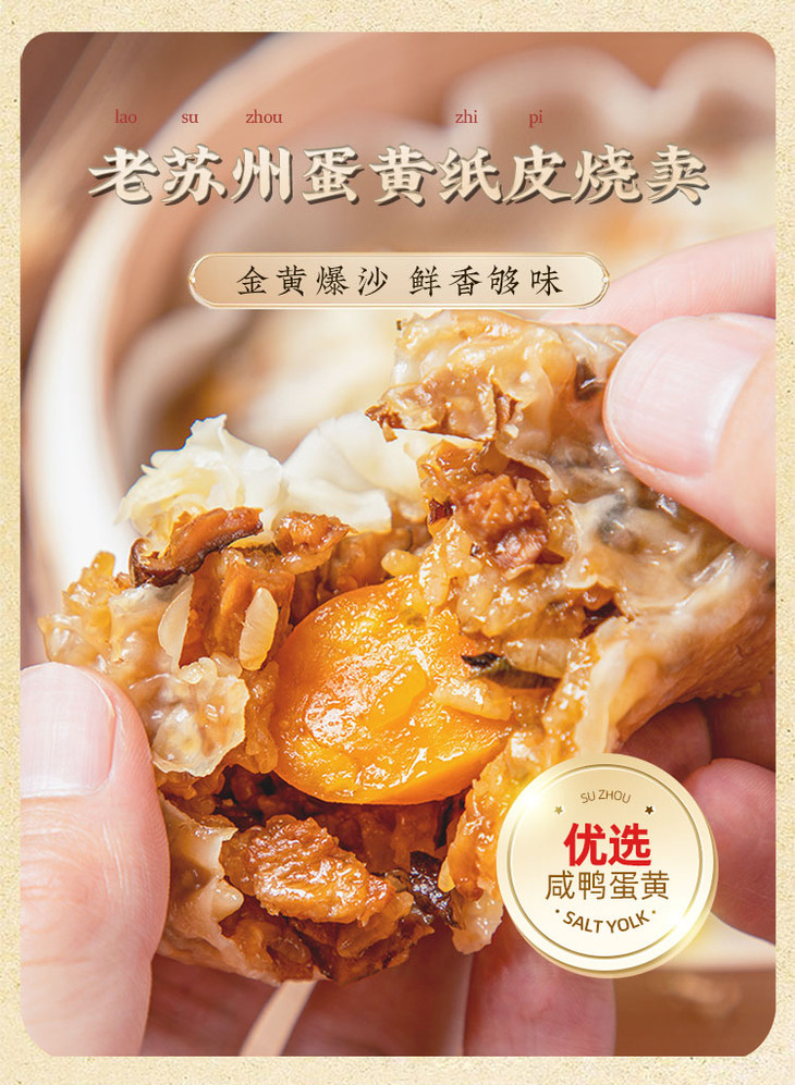 “纸皮烧卖”,顾名思义,外皮如纸般透薄的烧麦。据苏州的朋友说,这两年纸皮烧麦在线下超火,个别几家网红店甚至还排起了长队。头厨为了让更多人能尝到苏州这一风味面食,采用苏式手作法,皮薄馅足。烧麦的面皮采用的是五得利一等面粉,人工揉面,做到皮薄而不破;内馅搭配了糯米、香菇丁、笋丁、和里脊肉丁,造就了肉、笋、菇三丁碰撞出的多重口感。这还不算完,头厨还加入芝士和咸蛋黄,打造了金沙蛋黄和拉丝芝士这两种特别的口味!芝士味的纸皮烧卖采用新西兰进口芝士,用料实在,奶香十足,浓郁拉丝;蛋黄口味的纸皮烧卖则是精选优质咸蛋黄,金黄爆沙,鲜香十足,大颗粒蛋黄肉眼可见!这配料,真的用心了!