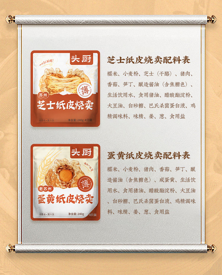 这两款能被誉为早餐头牌的面点来自头厨,一个致力于成为中华地道面食专家的新品牌。头厨坚信,只要选对了地道的食材,做对了地道的风味,就能够把这种人文精神融入食物之中,为面食赋予更多的色彩。因此,头厨这两年出了很多带有地方特色的面食小点,其中嵊州小笼和苏州纸皮烧麦就是很能代表江南口味的特色面食。